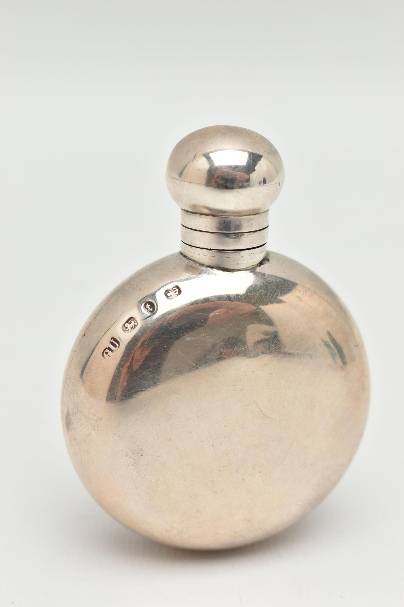 A LATE VICTORIAN SILVER HIP FLASK, of a polished circular form, hallmarked 'George Unite' Birmingham 1893, screw on cover with an additional glass stopper, approximate gross weight excluding stopper 45.5 grams (condition report: general light wear, stopper not believed to be original)
