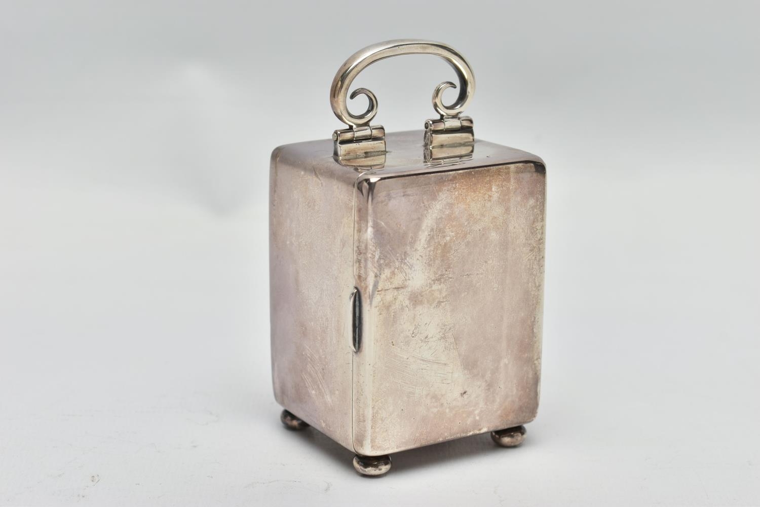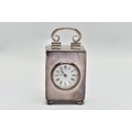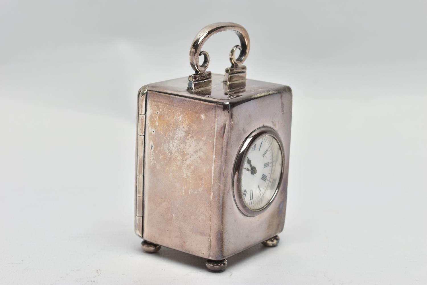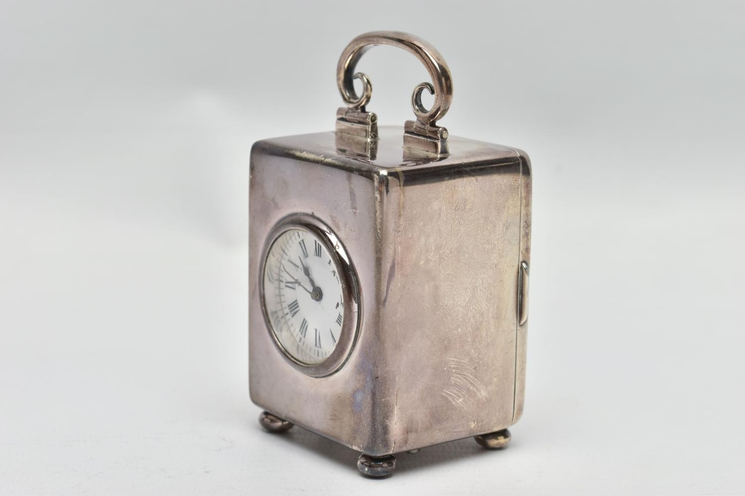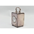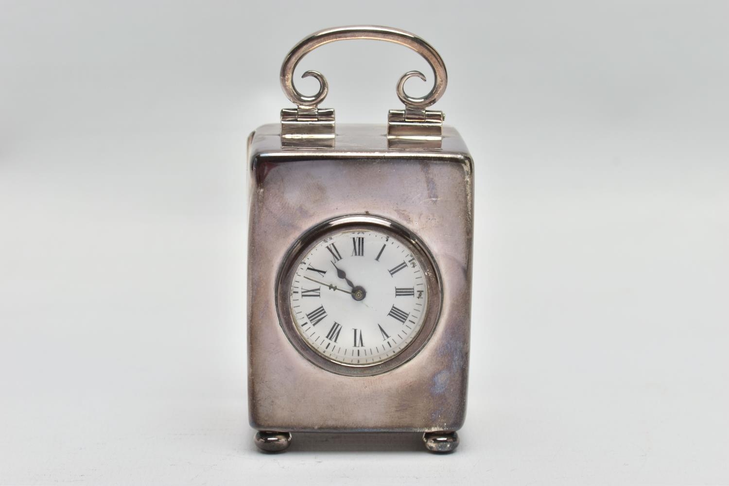 AN EDWARDIAN WILLIAM COMYNS MINIATURE SILVER BOUDOIR CLOCK, the plain case with swing carrying handle, enamel dial with Roman numerals, gilt interior, French movement, bun feet, London 1903, height with handle up 8.6cm (Condition report: winds and runs, small dent towards the top of the front left hand corner and a dent to the inside of the back door)