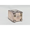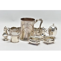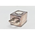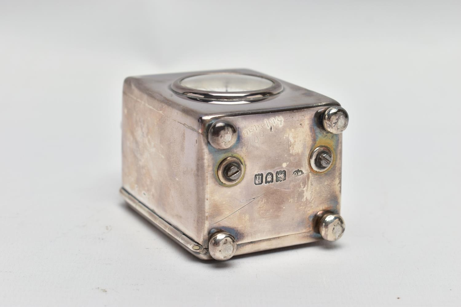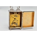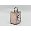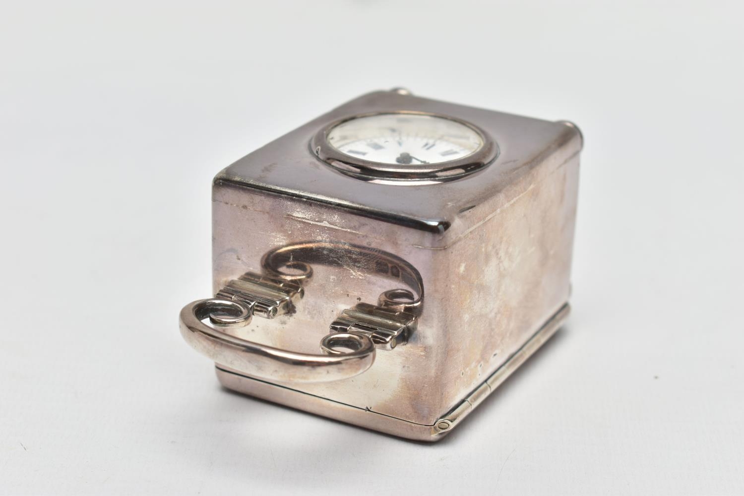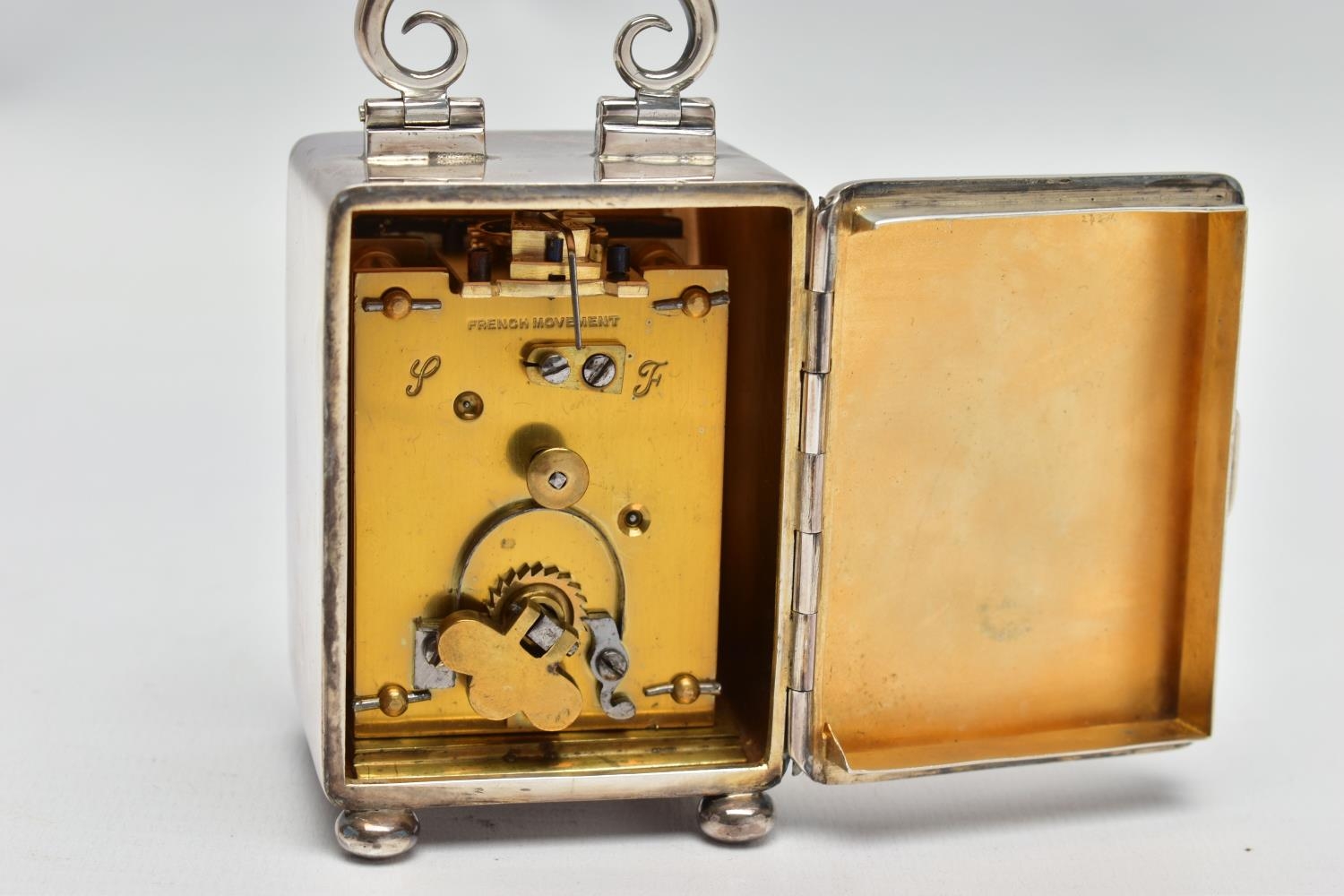 AN EDWARDIAN WILLIAM COMYNS MINIATURE SILVER BOUDOIR CLOCK, the plain case with swing carrying handle, enamel dial with Roman numerals, gilt interior, French movement, bun feet, London 1903, height with handle up 8.6cm (Condition report: winds and runs, small dent towards the top of the front left hand corner and a dent to the inside of the back door)