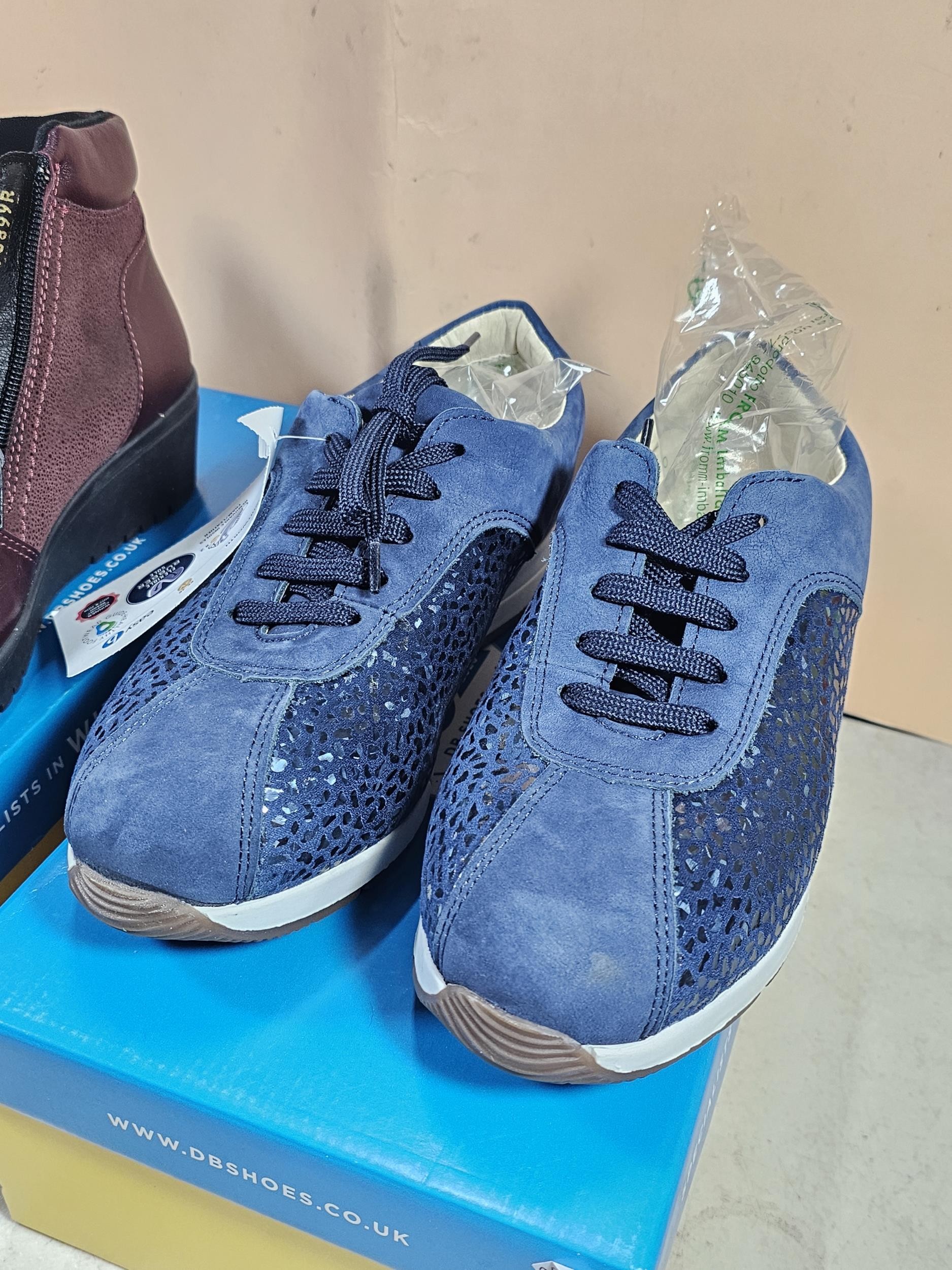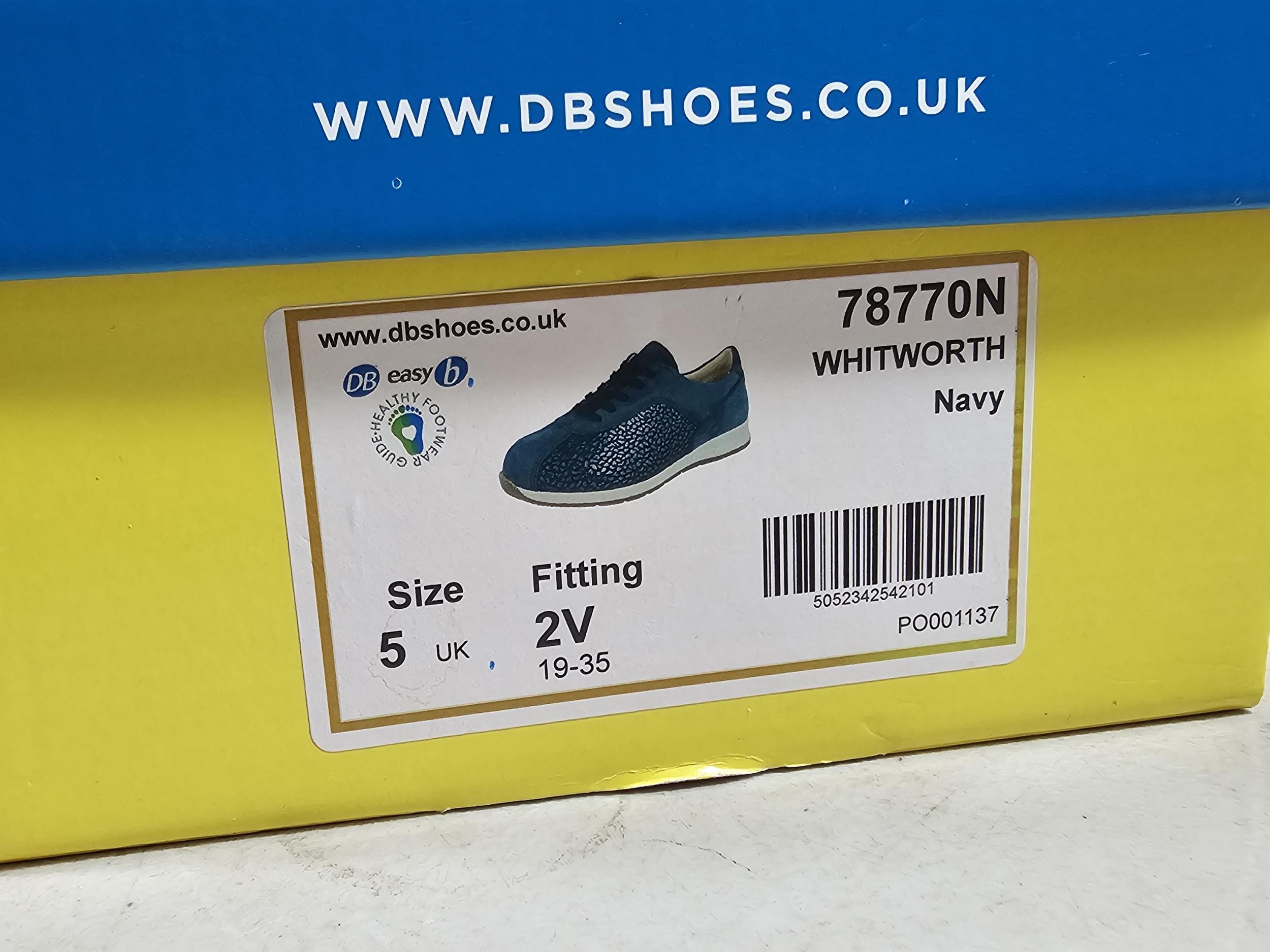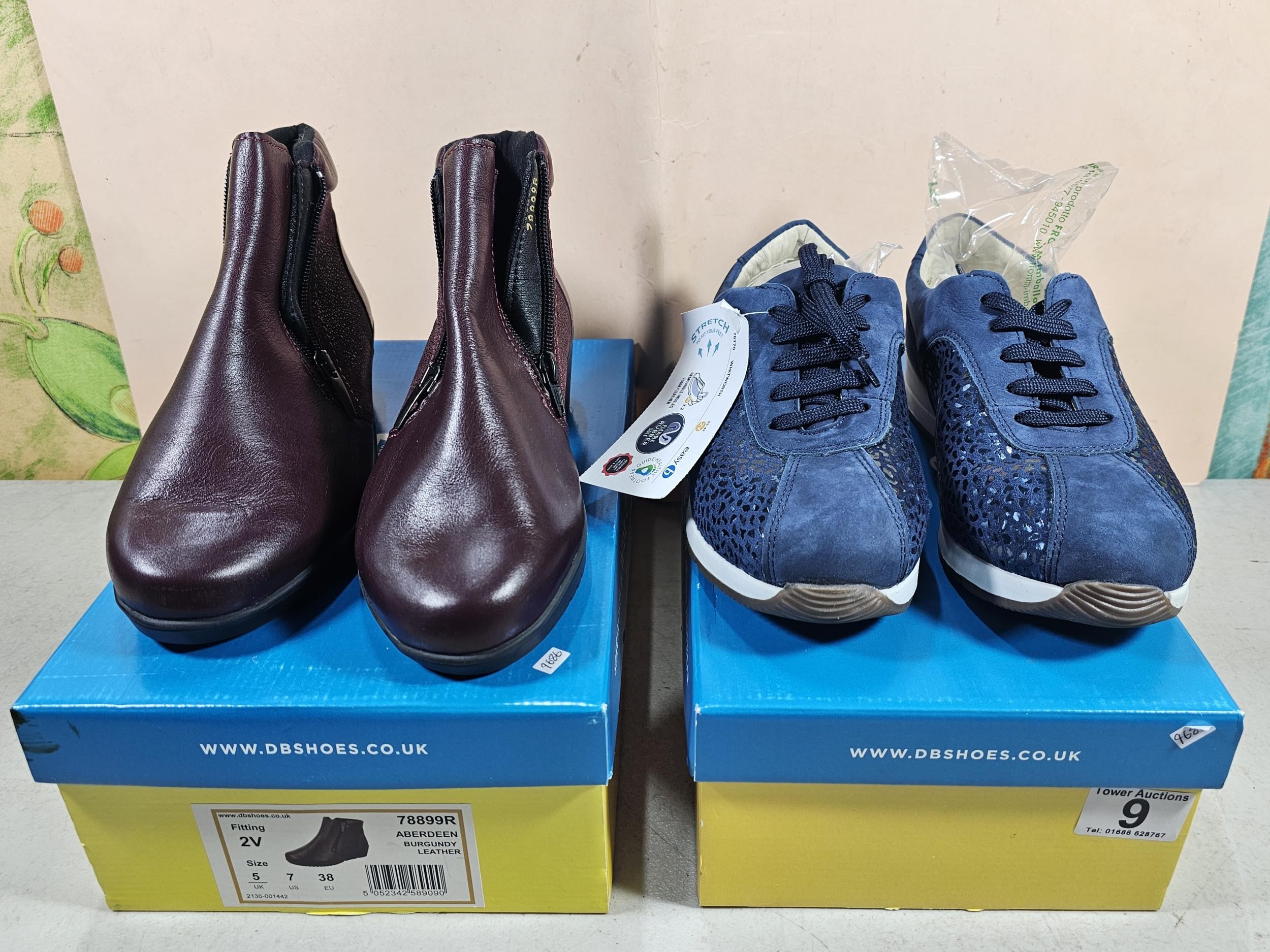 2 pairs of as new boxed shoes from DB Shoes to include a pair of Aberdeen leather topped ladies shoes, size 5 and a pair of ladies Whitworth navy trainers also size 5.