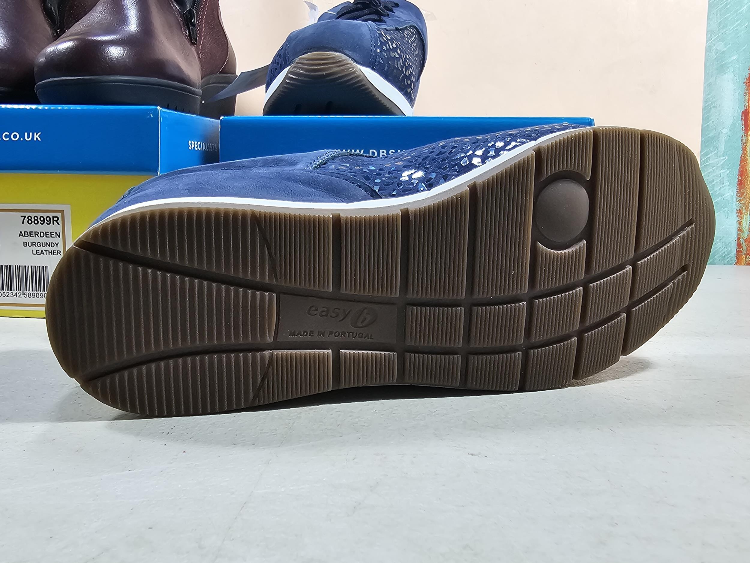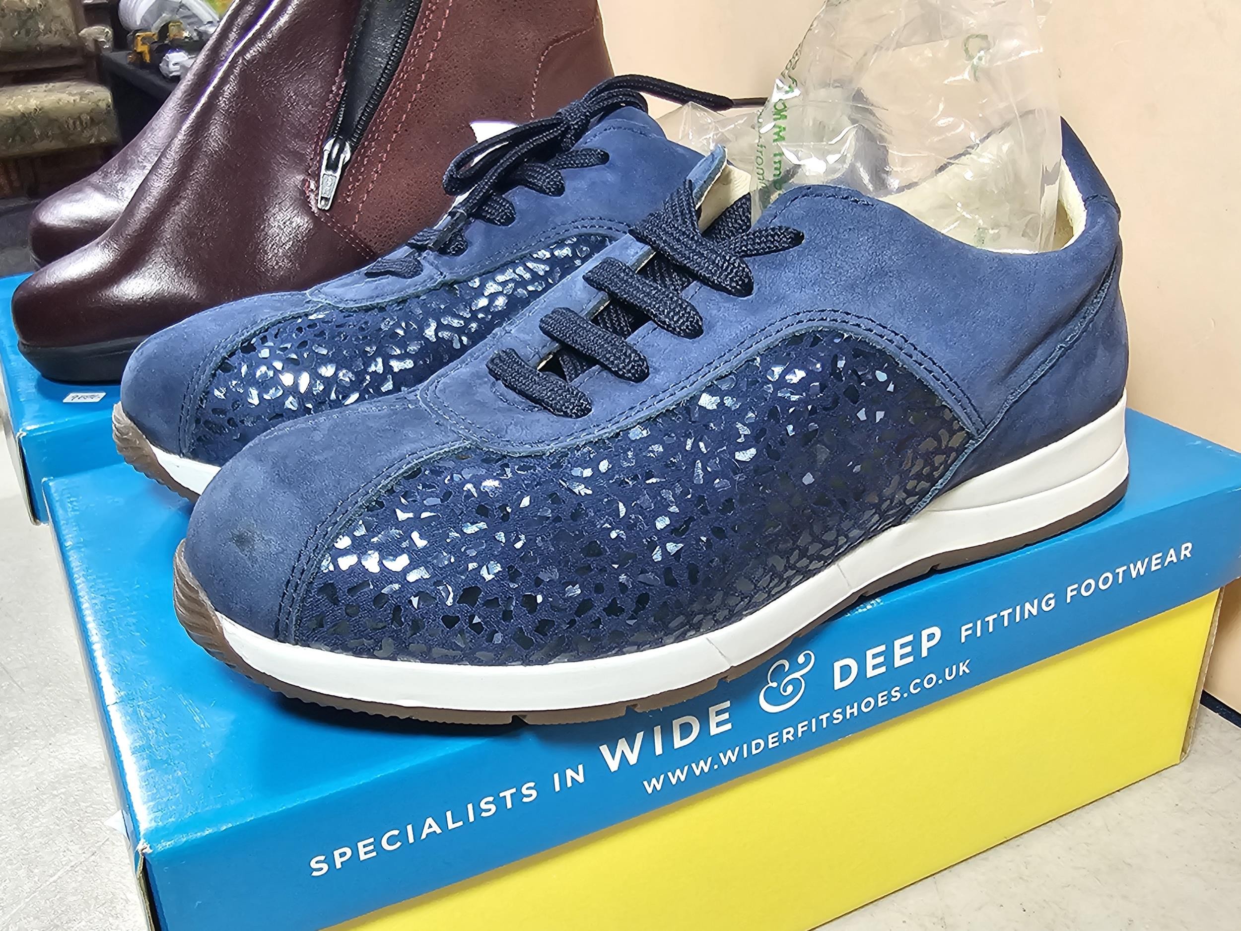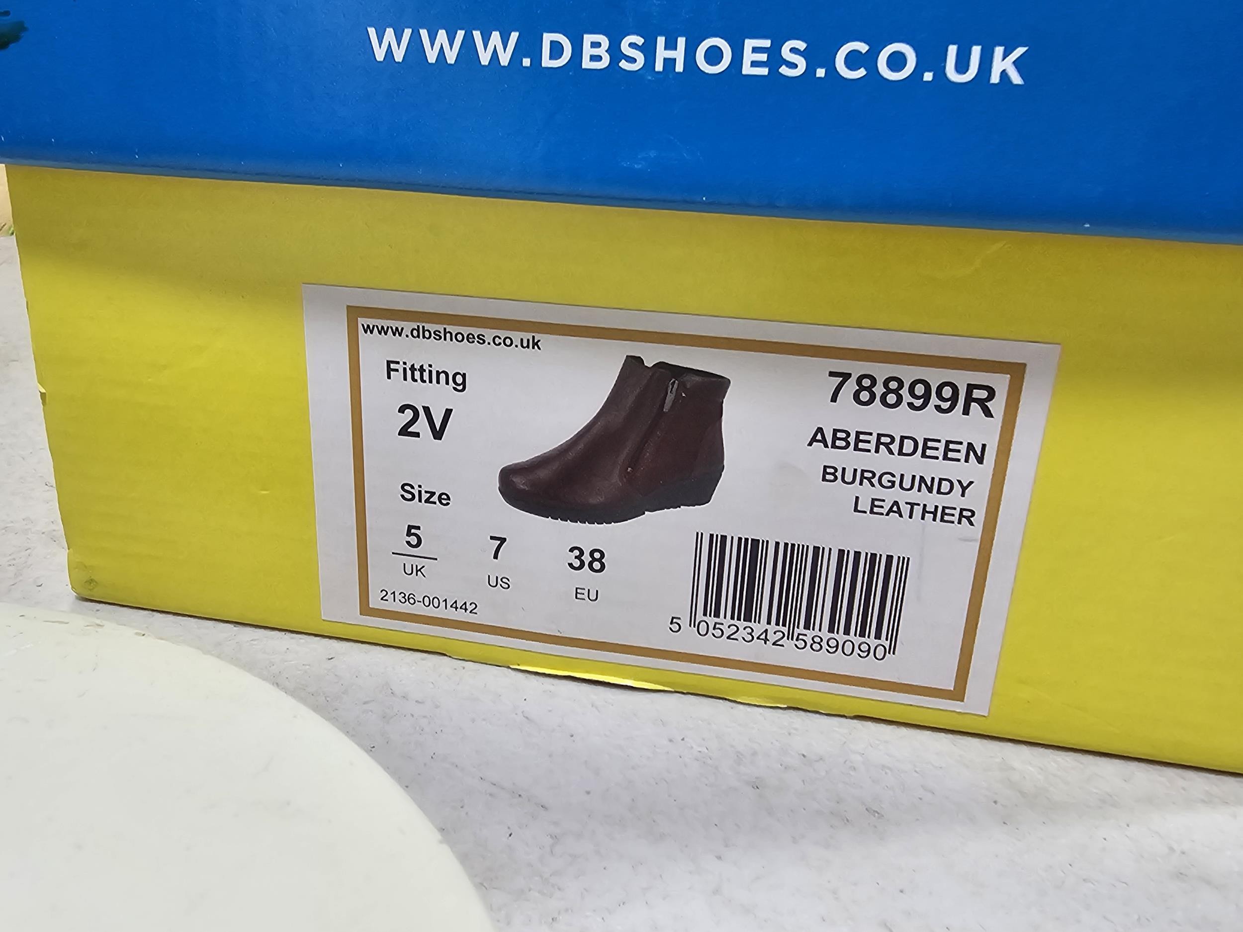 2 pairs of as new boxed shoes from DB Shoes to include a pair of Aberdeen leather topped ladies shoes, size 5 and a pair of ladies Whitworth navy trainers also size 5.