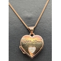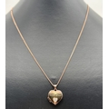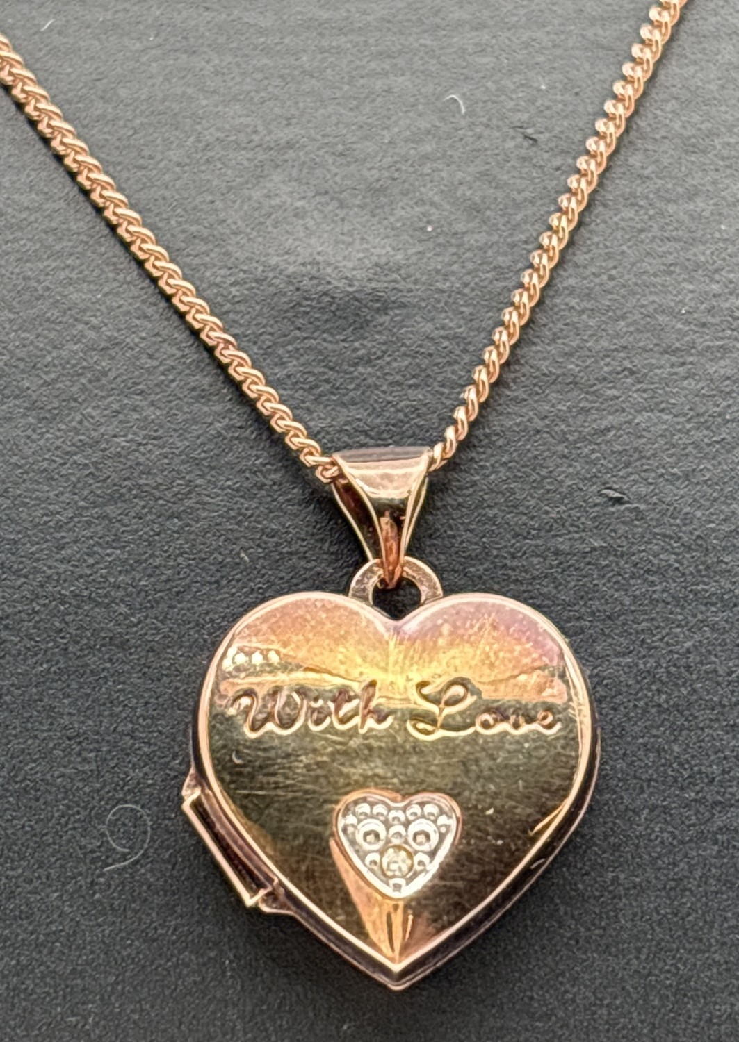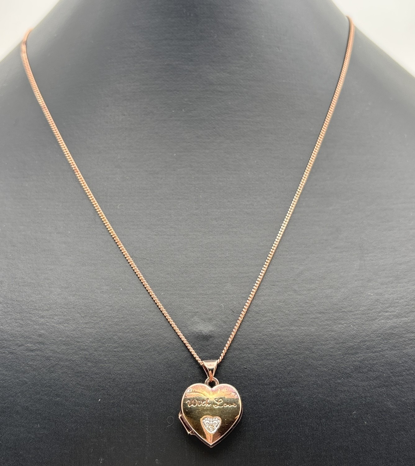 A rose gold on silver heart shaped locket set with small diamond and engraved 'With Love'. Comes on an 18" curb chain with spring ring clasp. Locket bale stamped 925 & Dia, chain fixing link stamped 925. Locket approx. 2.2cm drop (inc bale).