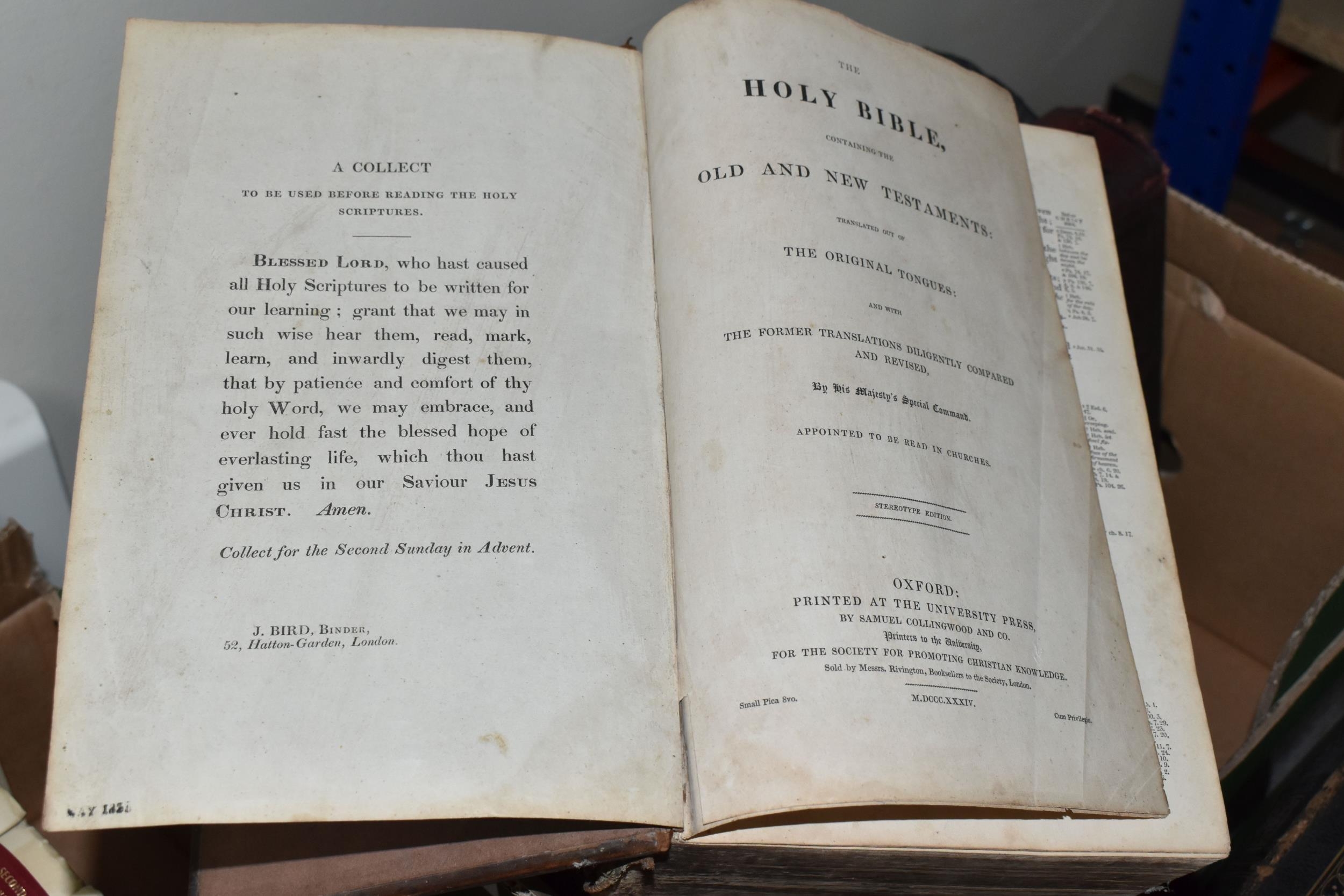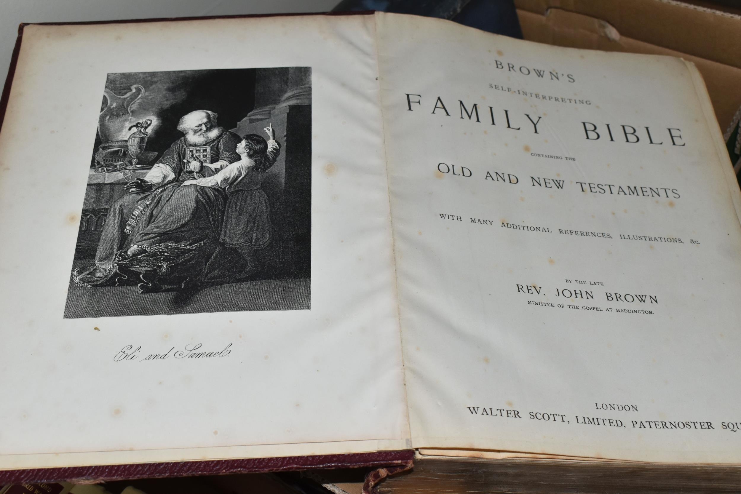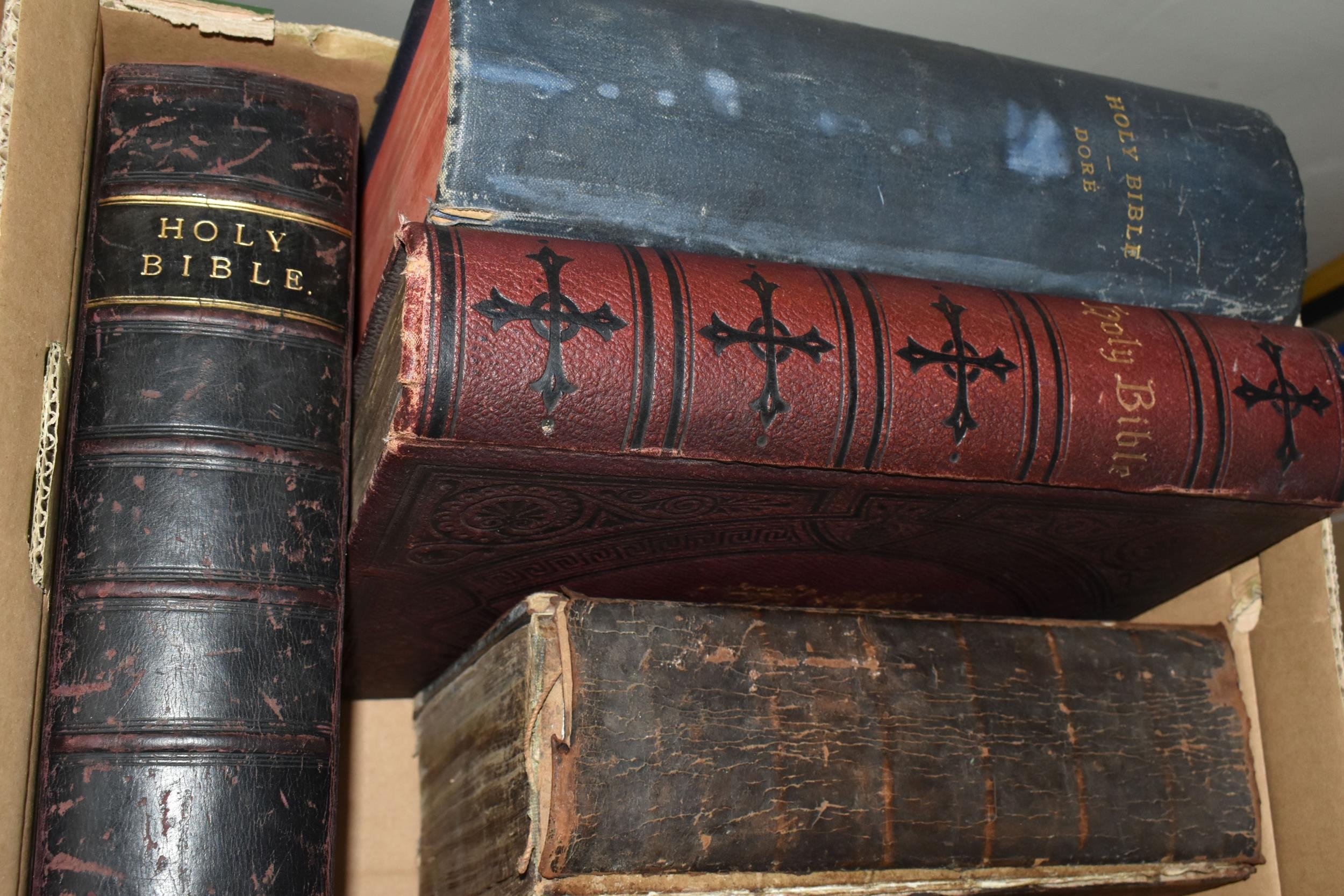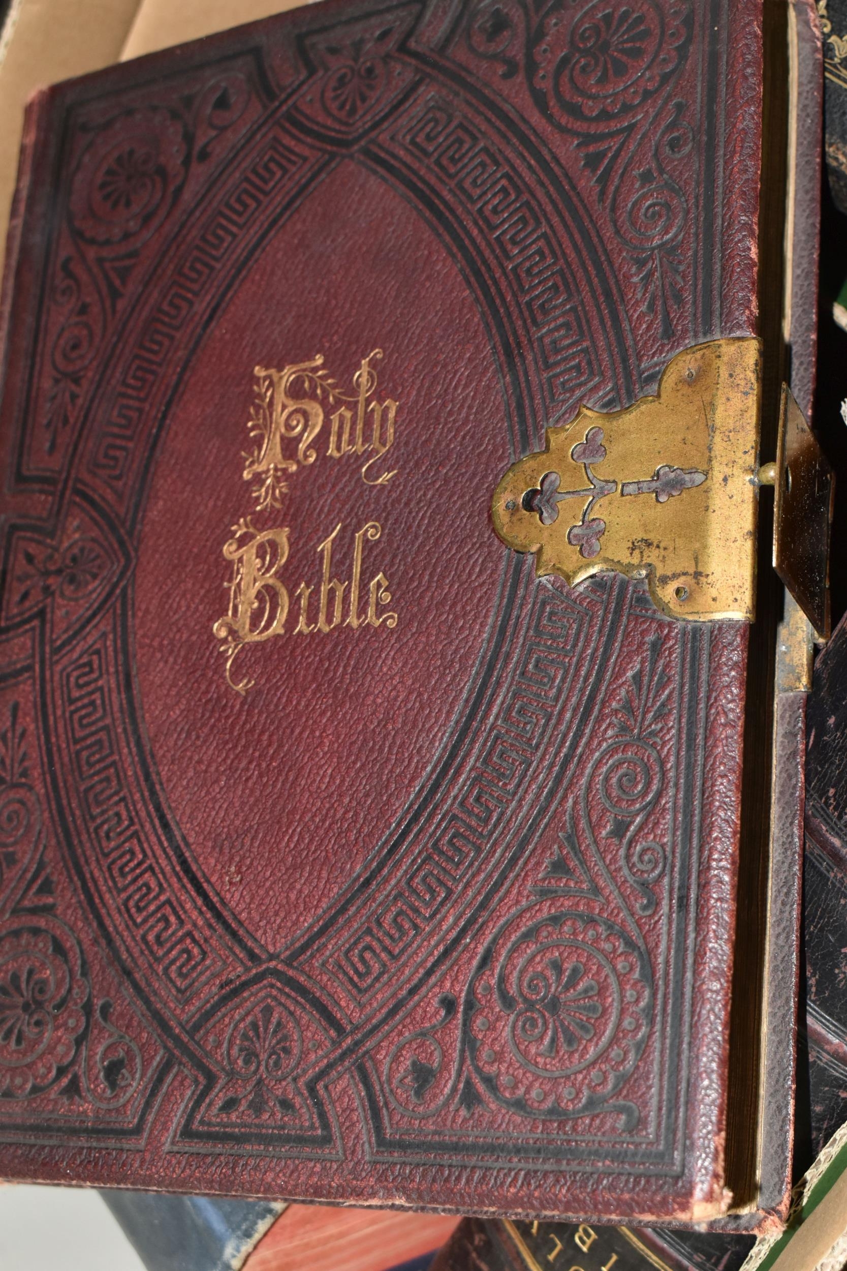 FOUR ANTIQUARIAN BIBLES comprising a Broen's Self-Interpreting Family Bible, leather bound, brass clasped, The Holy Bible with Illustrations by Gustave Dore, 1897, The Holy Bible 1834 and The Art Bible 1896