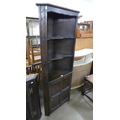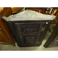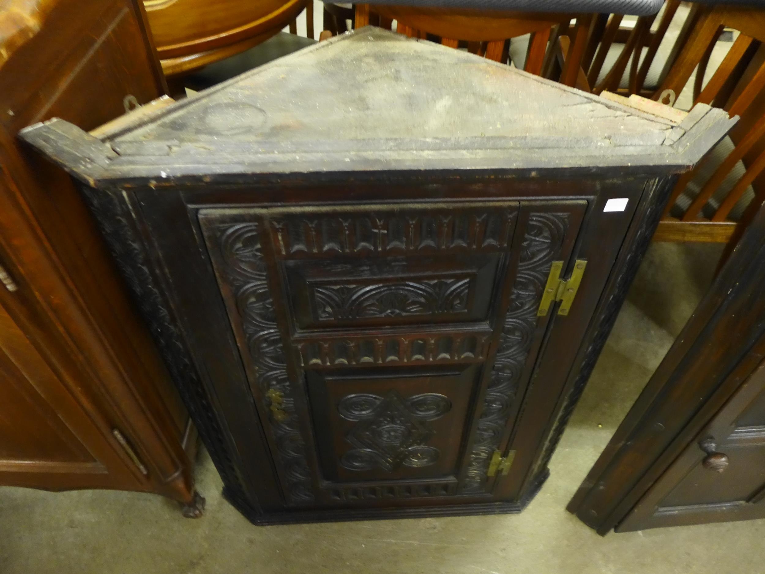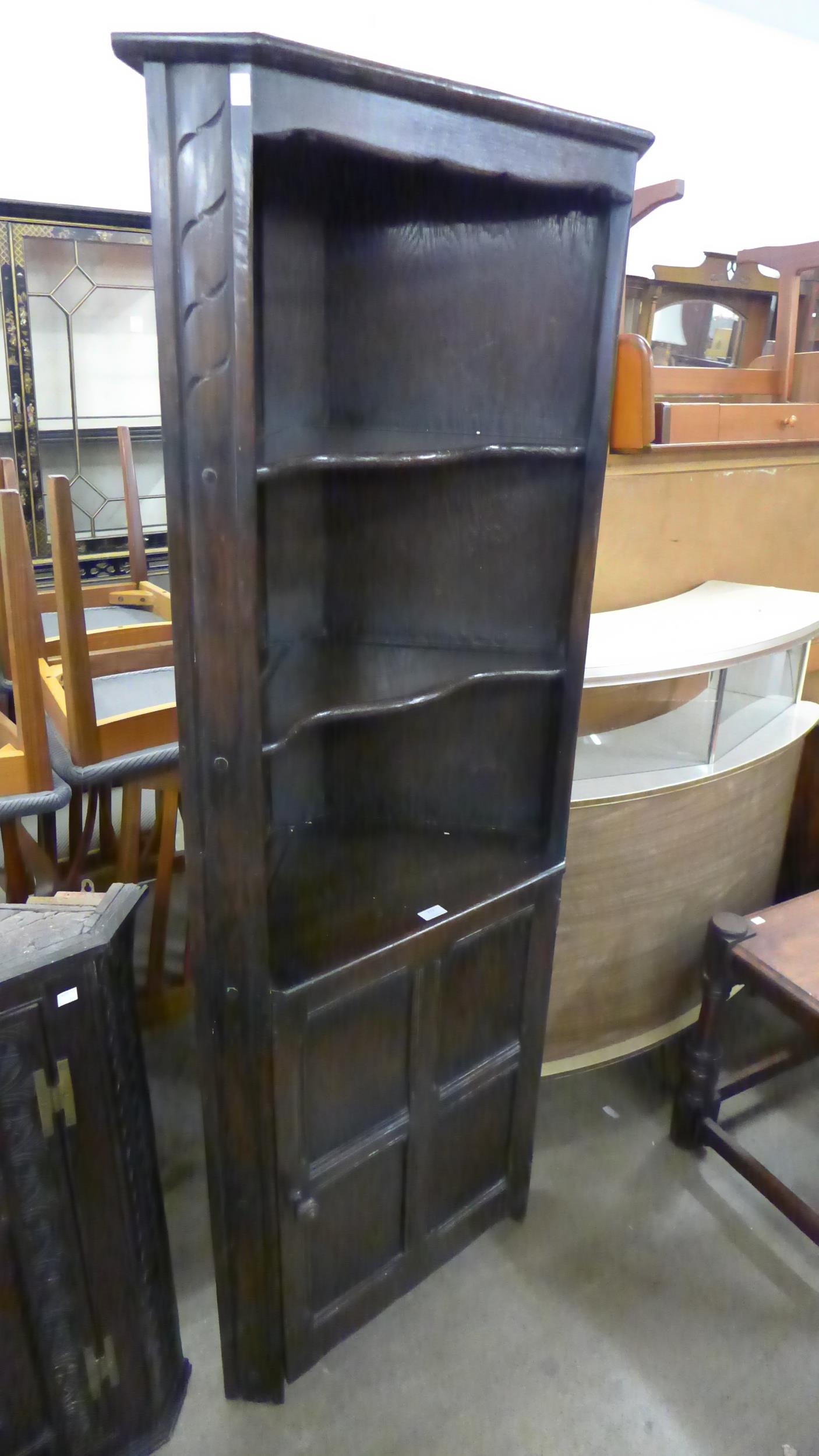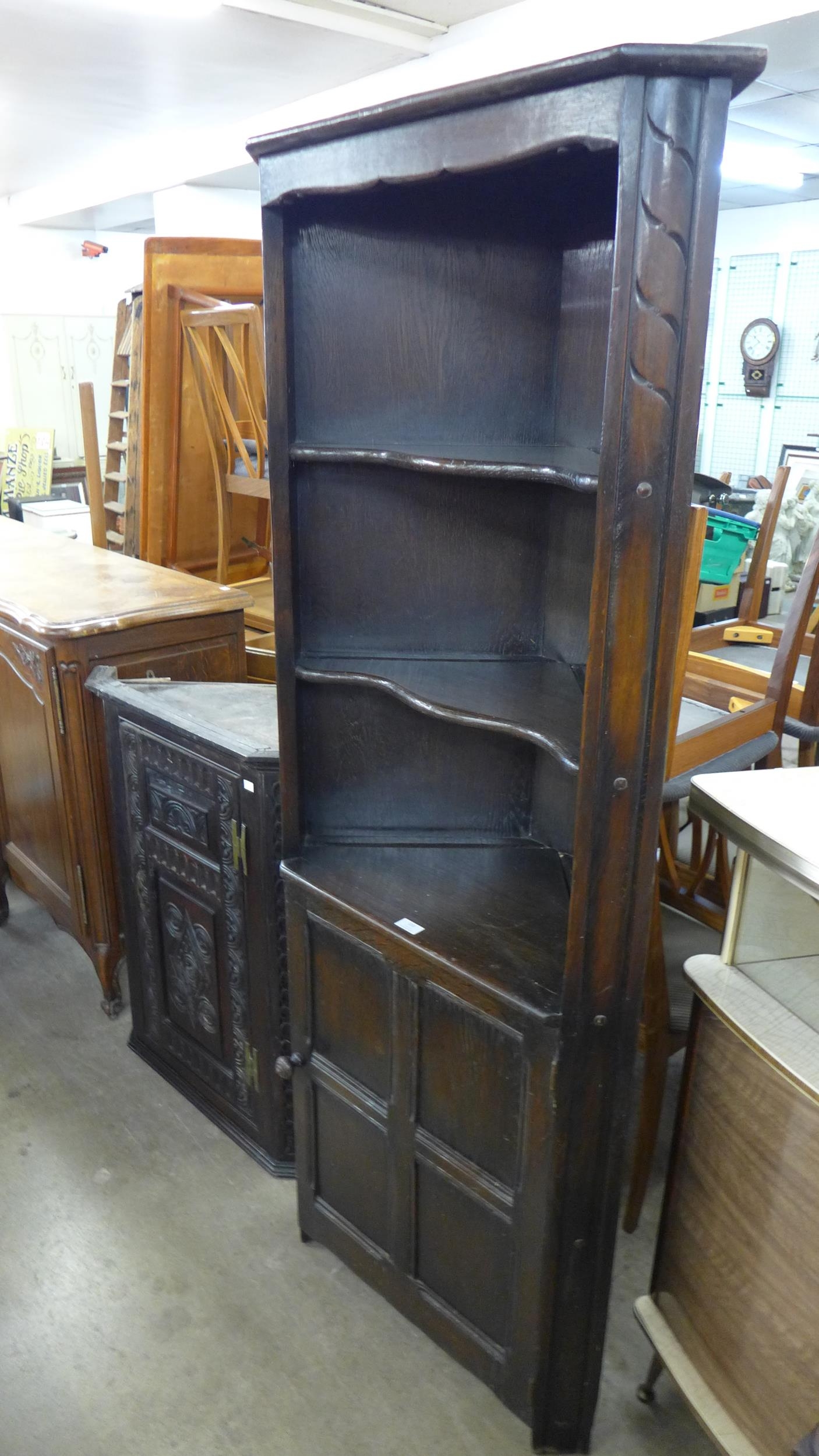 A Victorian Jacobean Revival carved oak hanging corner cupboard and an Ercol dark elm freestanding corner cupboard