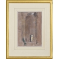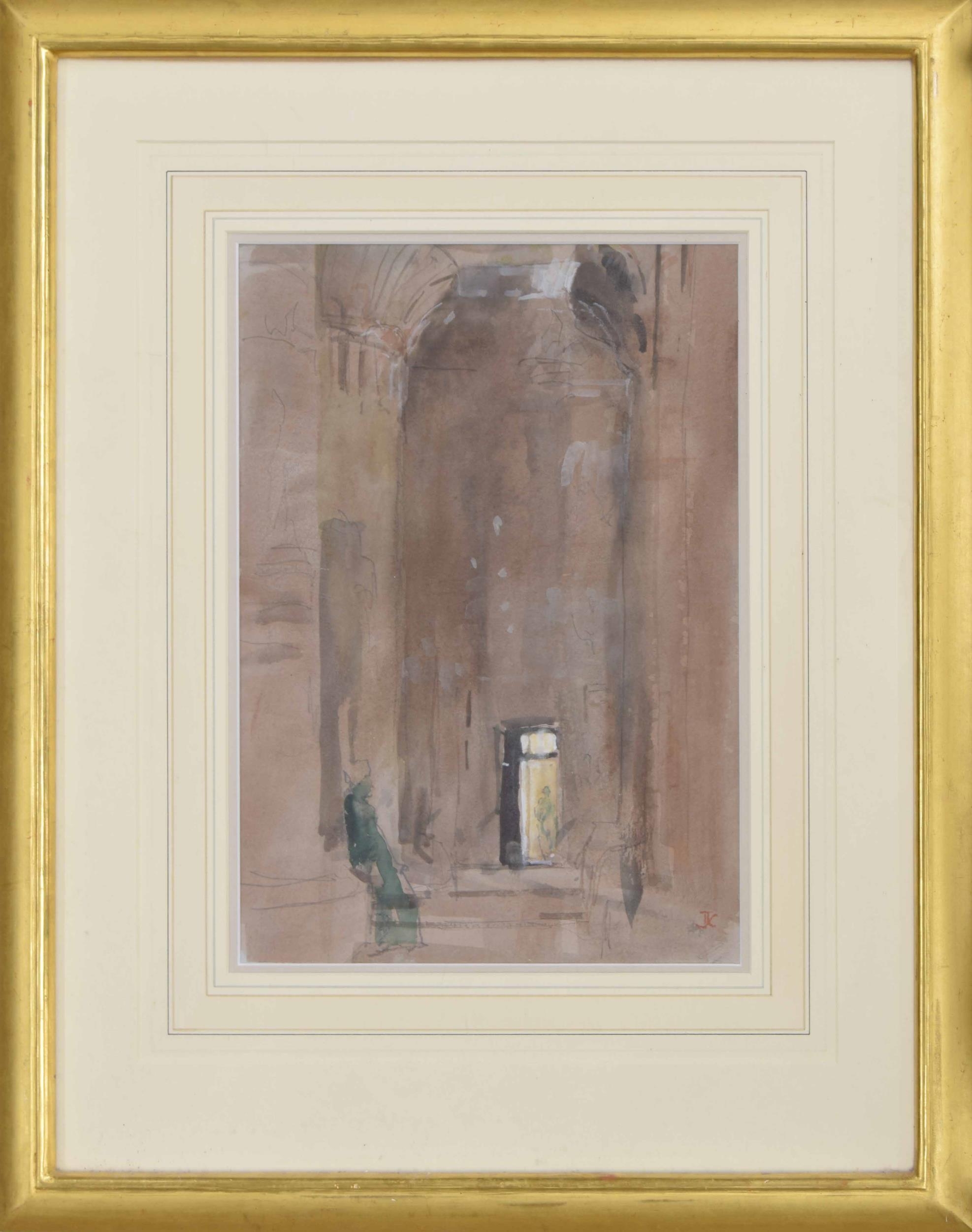 English School (20th century) - Figure beside a stone column with another figure in a sunlit doorway nearby, signed with the initials J.K., pencil and watercolour, a preparatory sketch, 14" x 10"