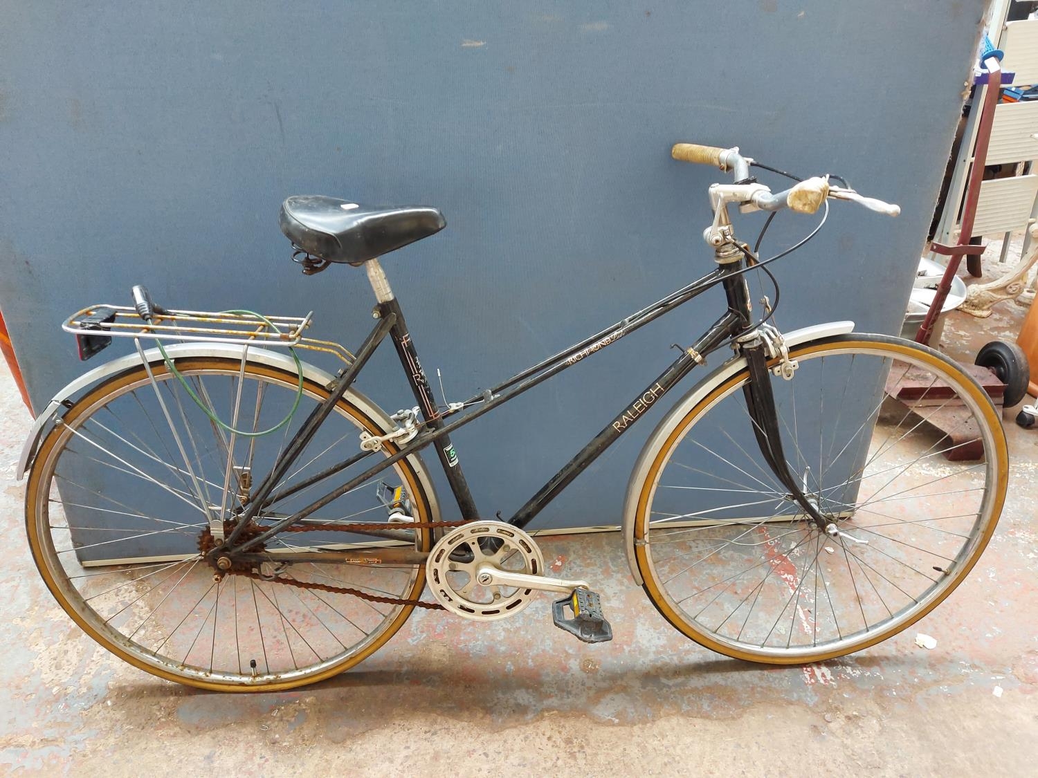 A vintage black Raleigh Richmond ladies town bike with quick release front wheel, rear carrier and single gear system