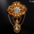 ANTIQUE VICTORIAN DROP BROOCH. Set to the center with a cluster of white stones, decorated with floral leaf design and beaded decorations, suspending a drop to the bottom and a garland chain. Locket back. L 6.1 cm. W 4.2 cm. 12.2 grams.