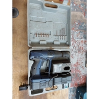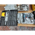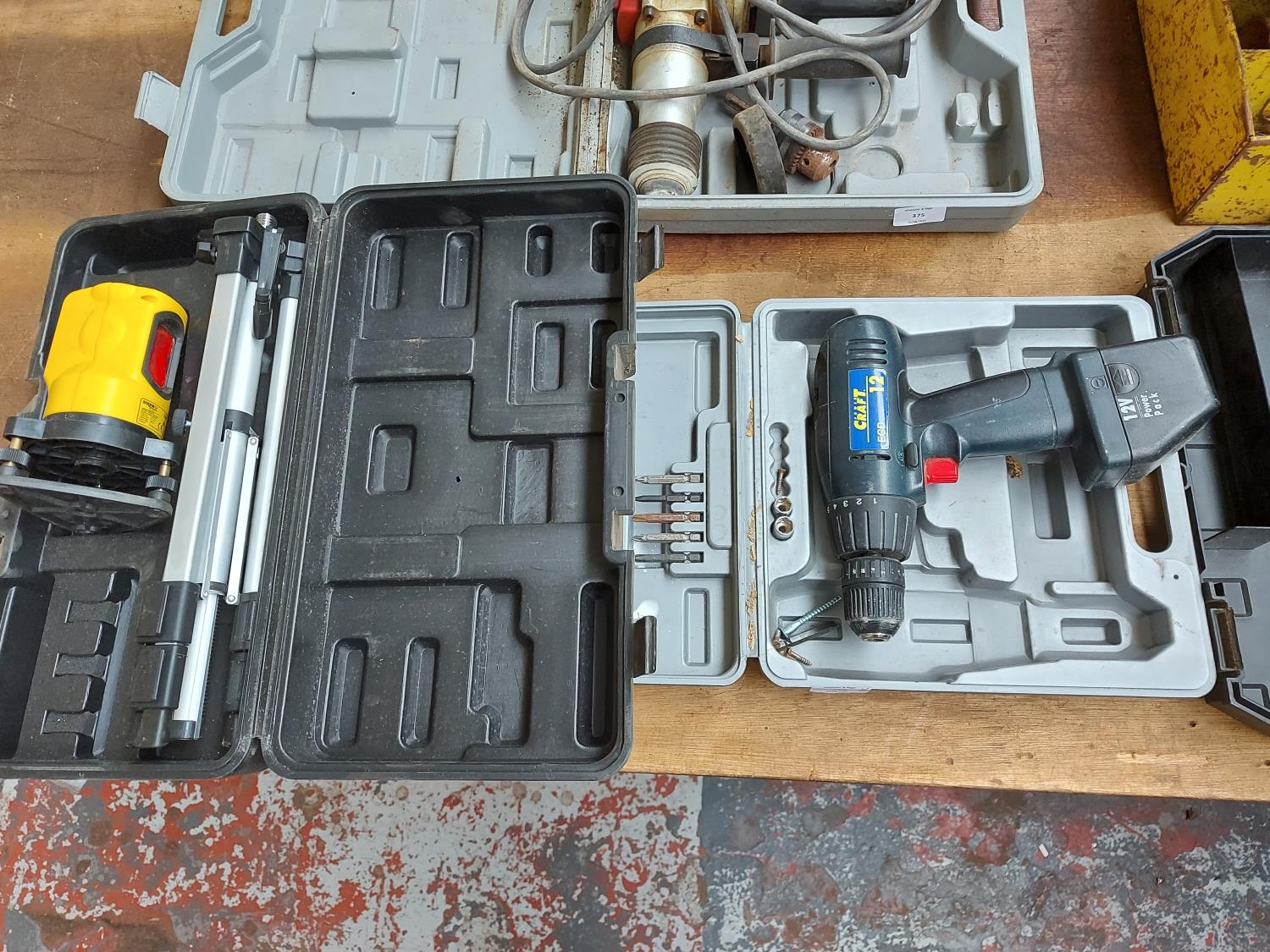 Two cased items to include a black Powercraft ECD 12V cordless drill together with a black and yellow Screwfix laser level and tripod