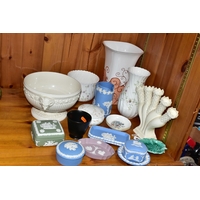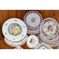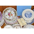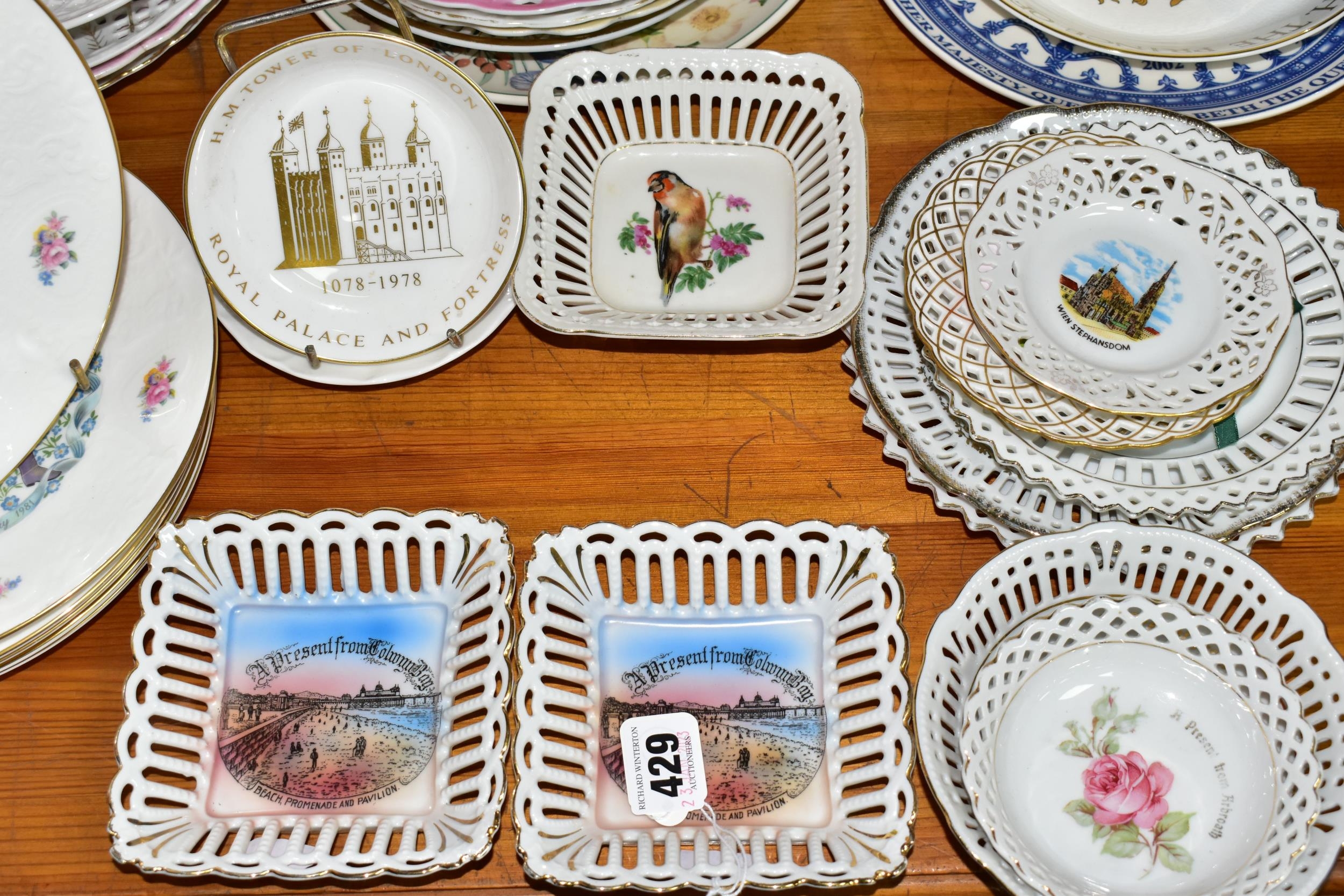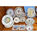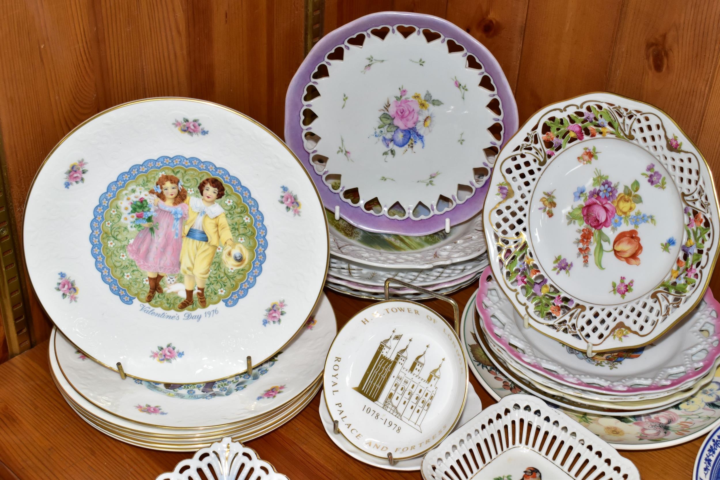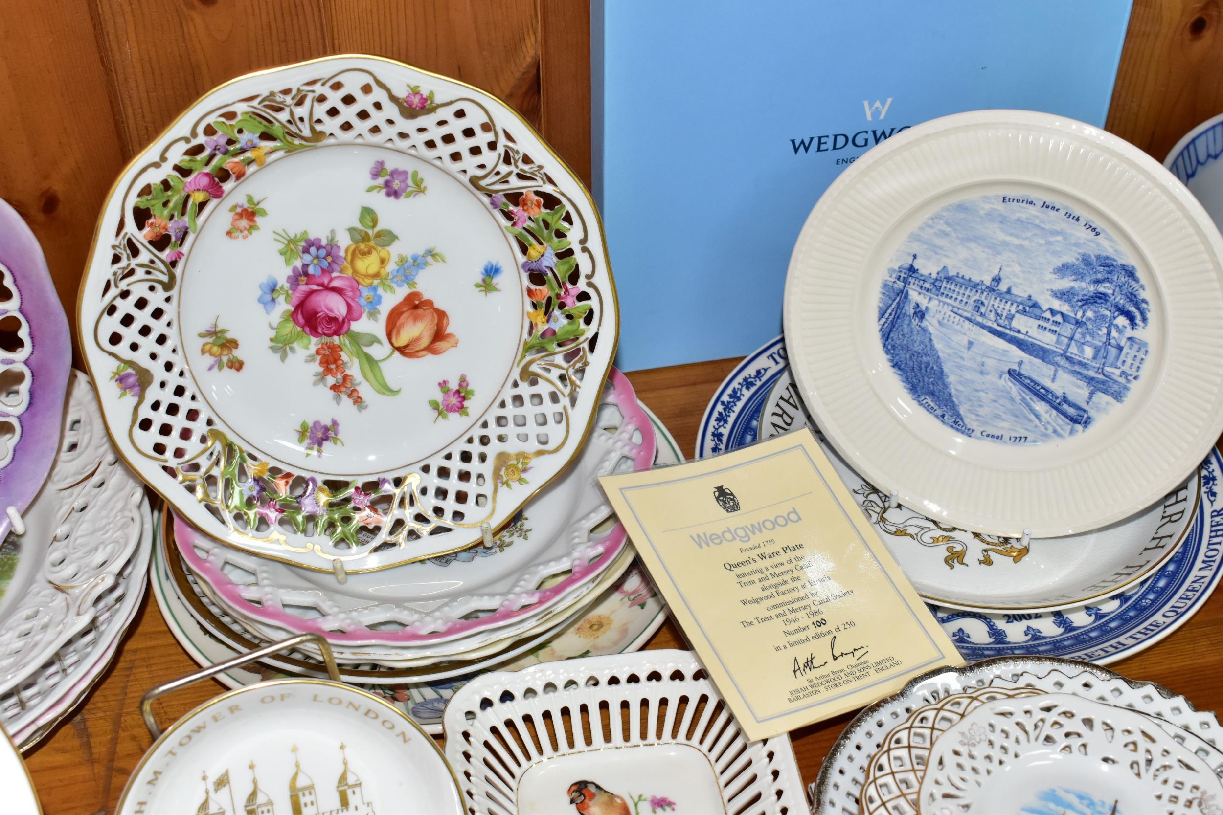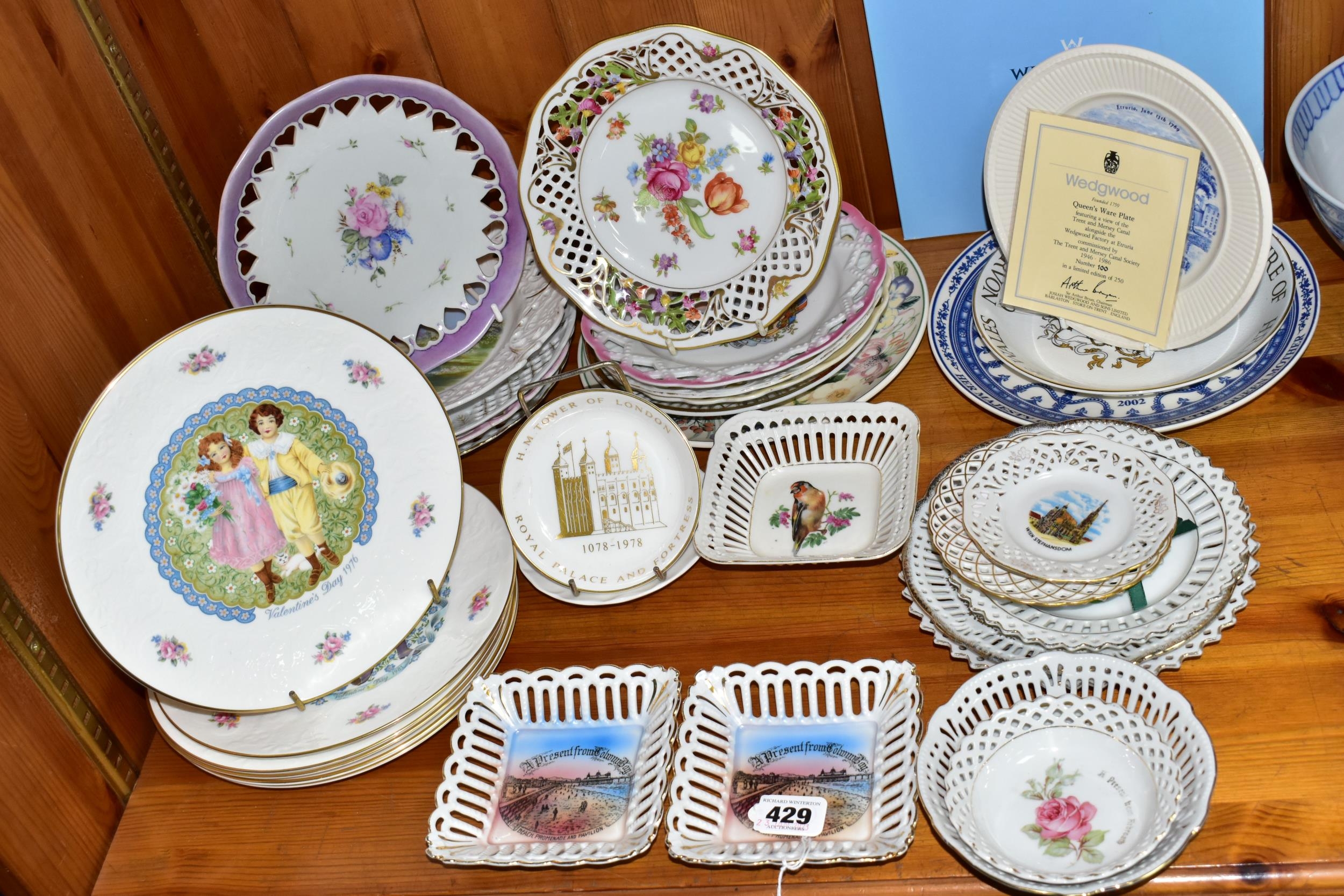 A QUANTITY OF CABINET PLATES, comprising a boxed limited edition Wedgwood Queen's Ware plate to mark 40 years of inland waterways campaigning 100/250, a Crown Ducal plate 1969 for the Investiture of H.R.H Prince of Wales, six Royal Doulton Valentine's Day plates 1976- 1981, a Royal Worcester 'Tower of London' trinket dish, a collection of holiday souvenir plates, etc (Qty) (Condition Report: some crazing and worn gilt in varying degrees)