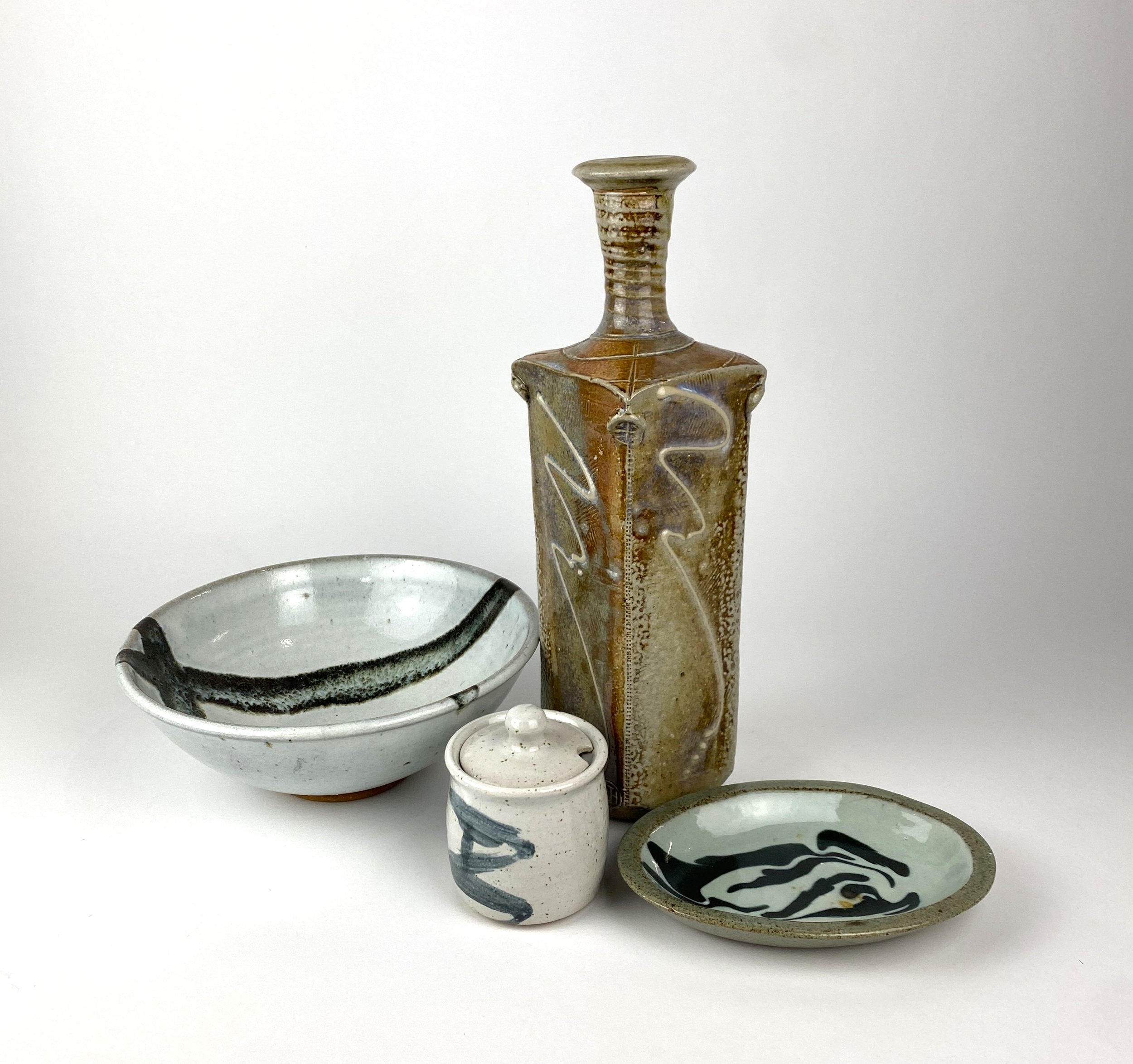 A collection of contemporary British studio pottery comprising a Barry Huggett Leach pottery bottle vase, monogrammed, 32cm high, a Gary Hill blue and white oval dish, signed, 17cm long, a bowl, monogrammed PS, possibly Paul Stubbs, 21.5cm diameter, and a condiment pot, unsigned, 10cm