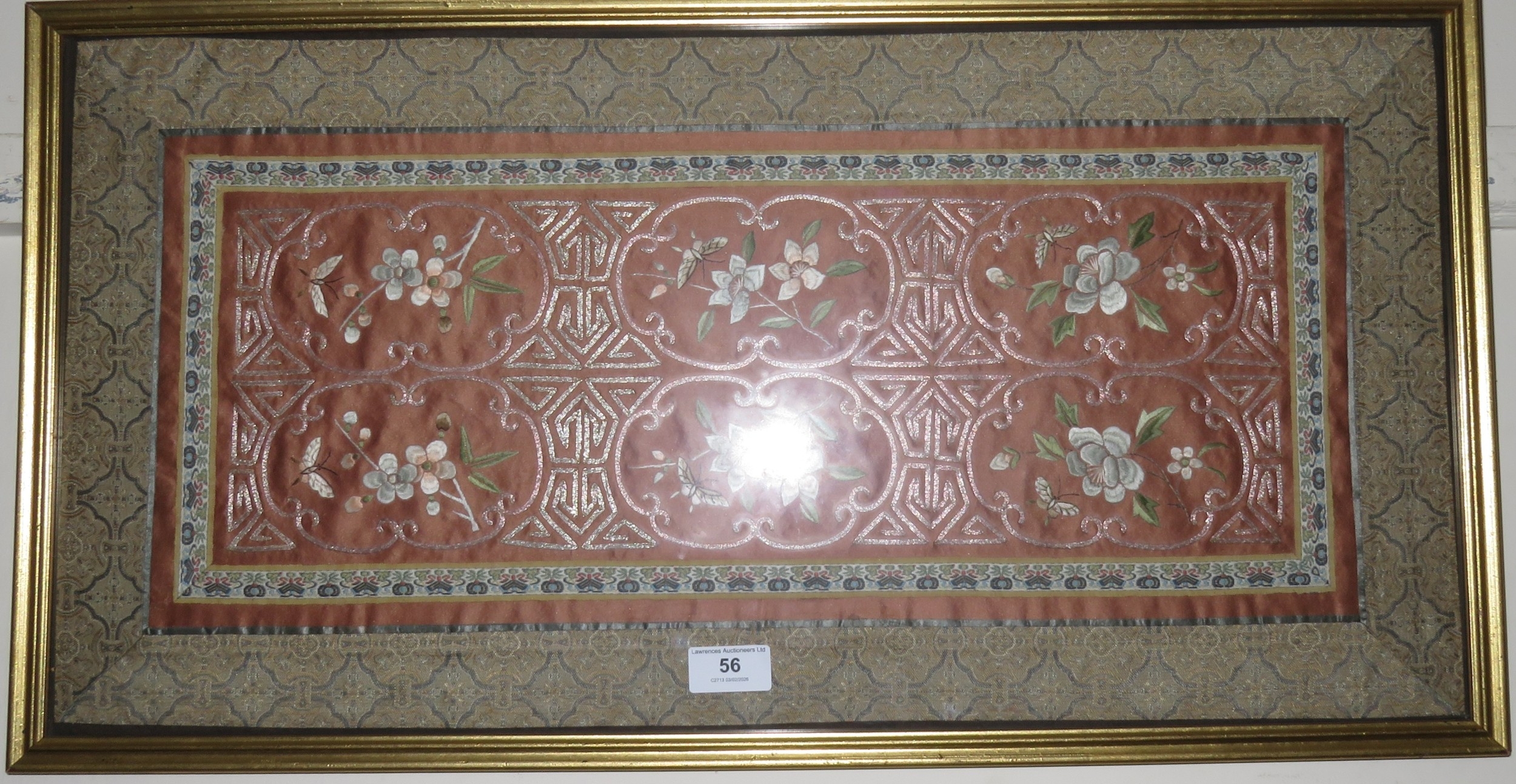Chinese silk and silver thread embroidered panel, decorated with flowers and moths, gilt framed, 33 x 65cm