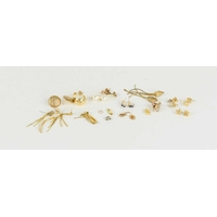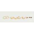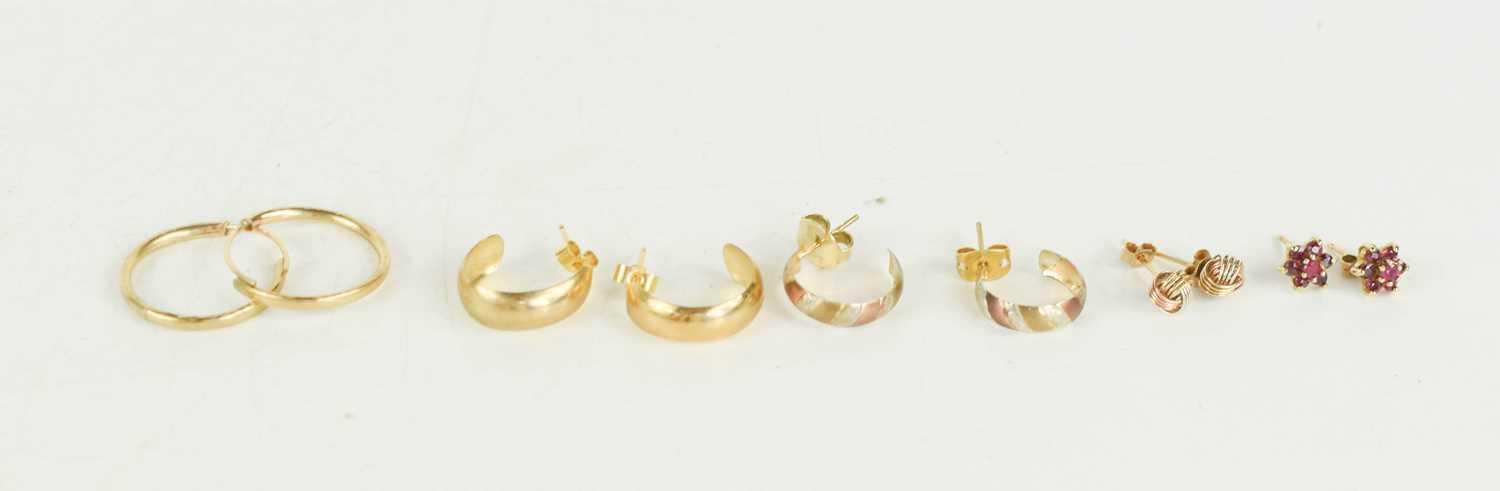 A pair of 15ct gold hoop earrings, 1g, a pair of 9ct gold hoop earrings, 0.6g, a pair of 9ct gold half hoop earrings, 0,9g, a pair of 9ct gold and garnet flowerhead earrings 0,9g, a pair of knot form stud earrings 0.5g,