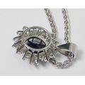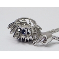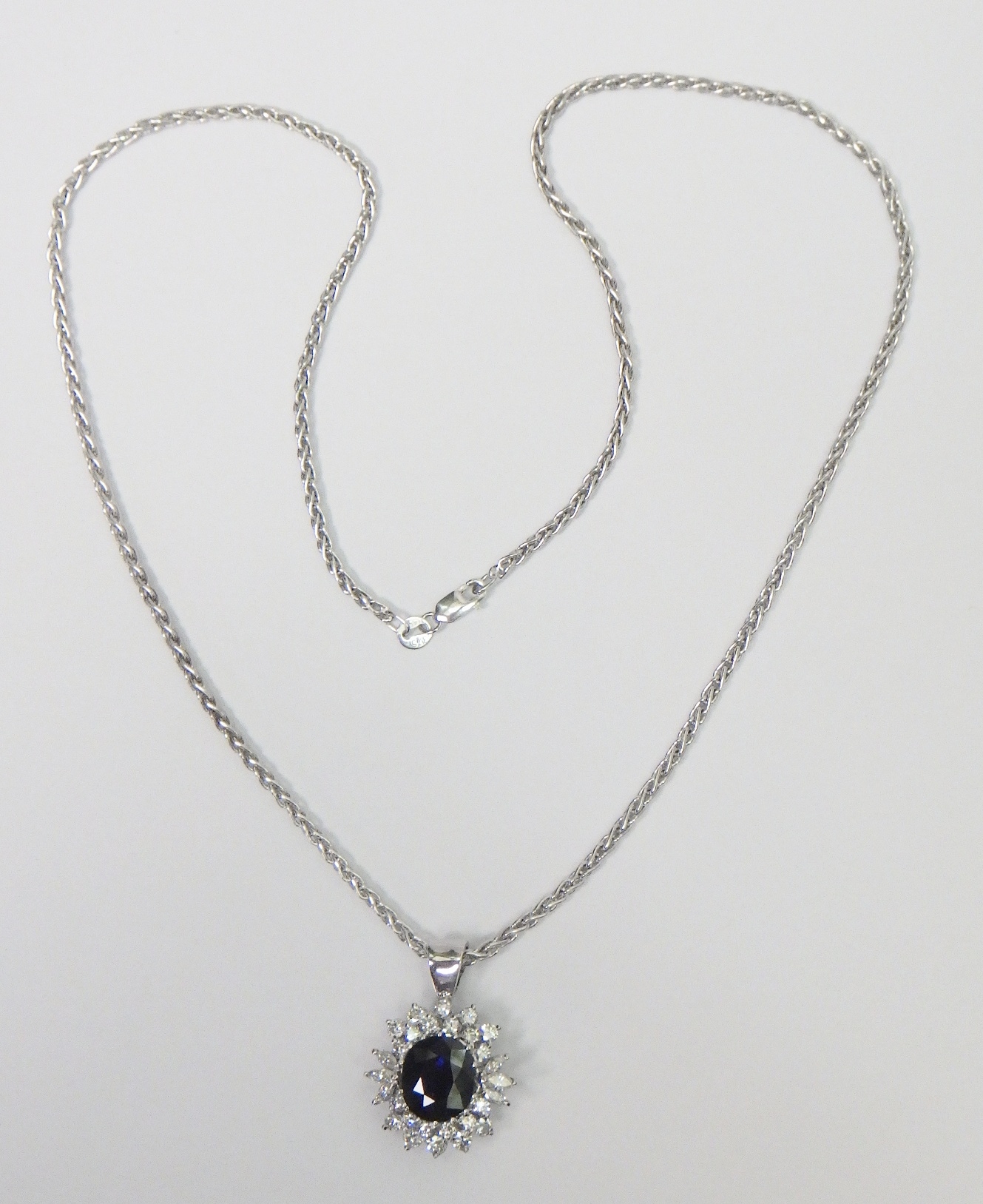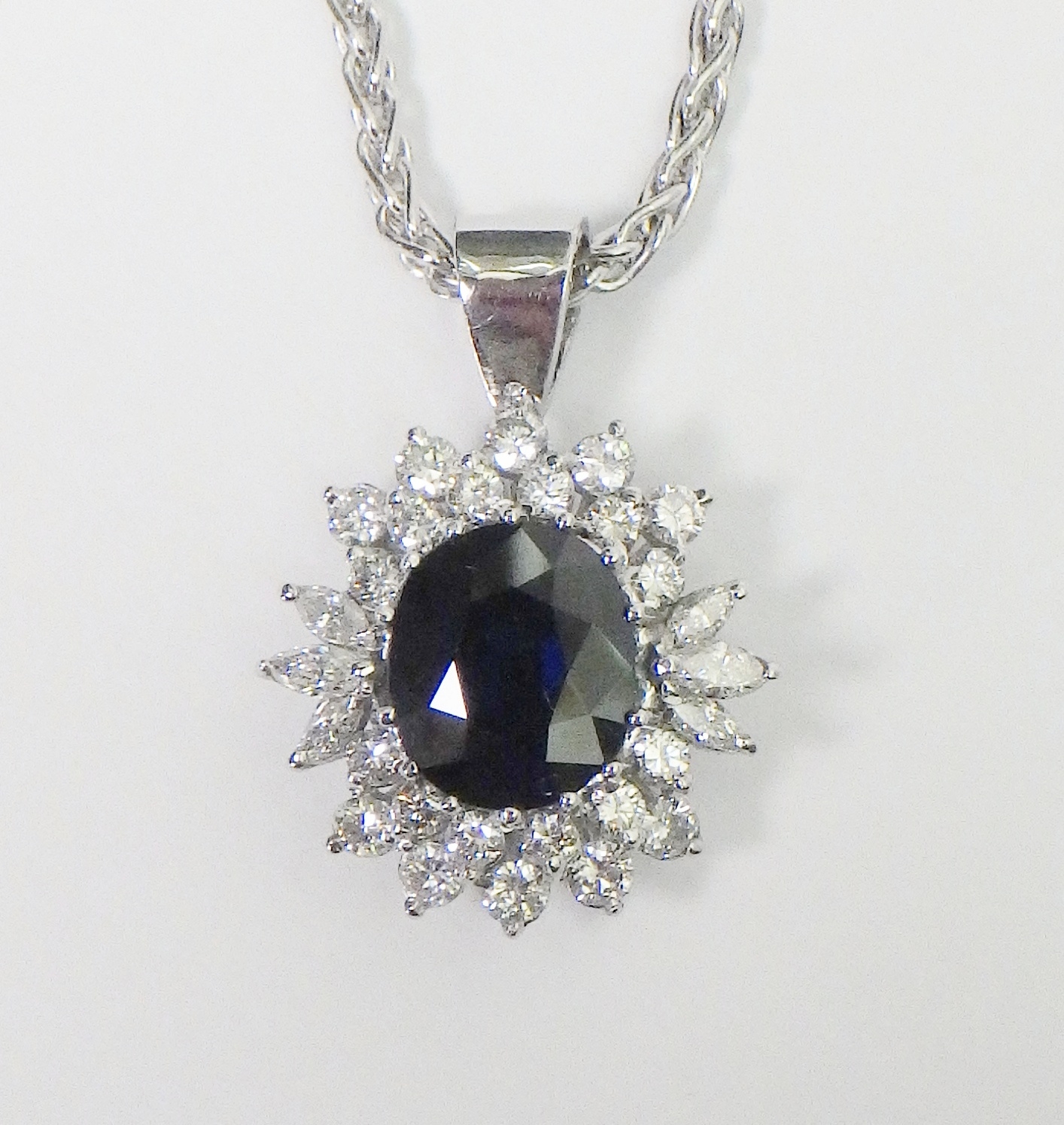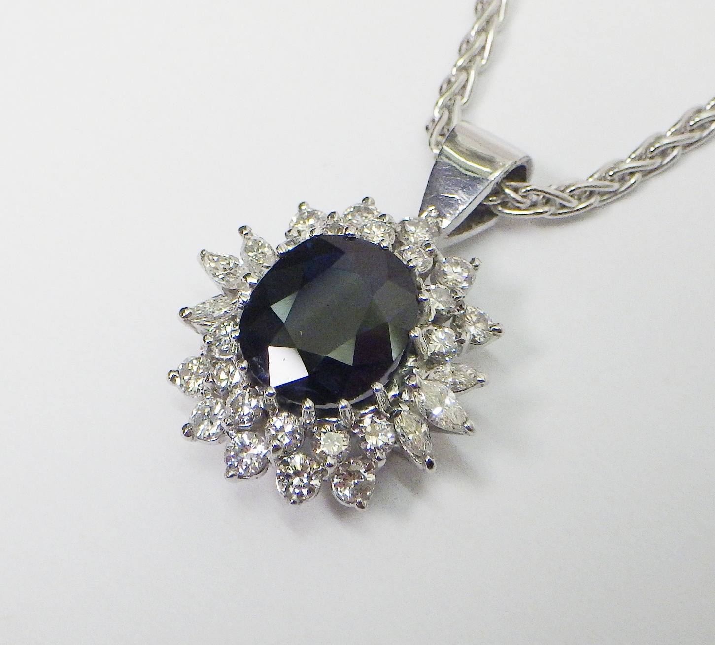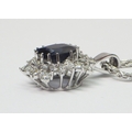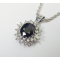 A cluster pendant comprising an oval sapphire surrounded by 28 diamonds of round an marquise cuts, unmarked white metal. The whole suspended on a 9ct gold rope twist chain. Pendant 25mm long / 18mm across. The chain weighs approx 3.5g. The pendant weighs approx 5.5g gross - please note no guarantee as to its metal composition is offered or suggested by Wombell's Auctioneers as it not hallmarked.