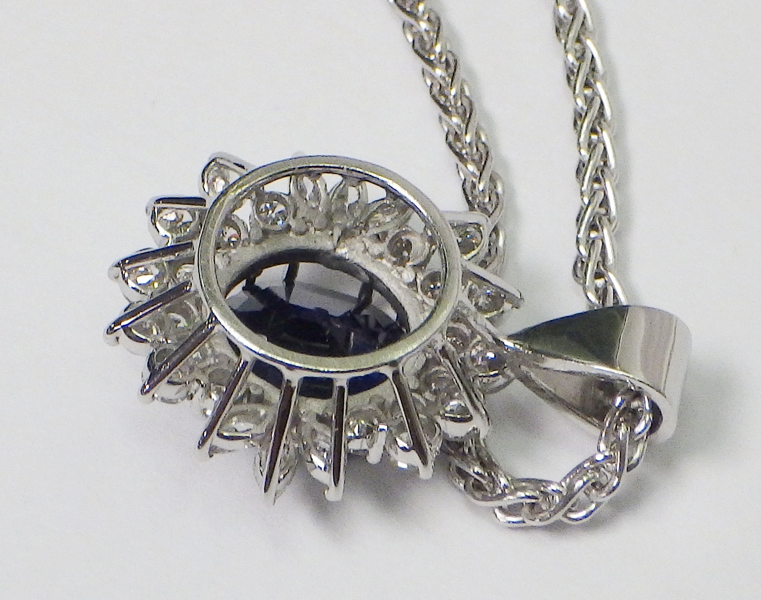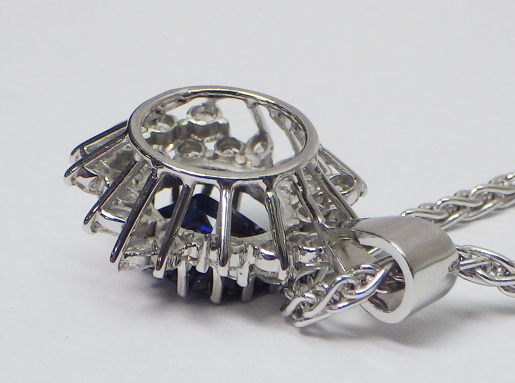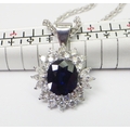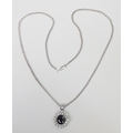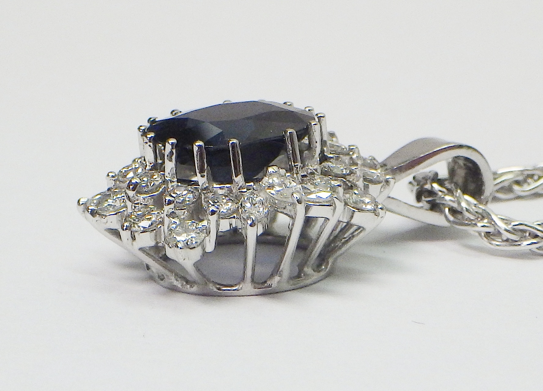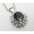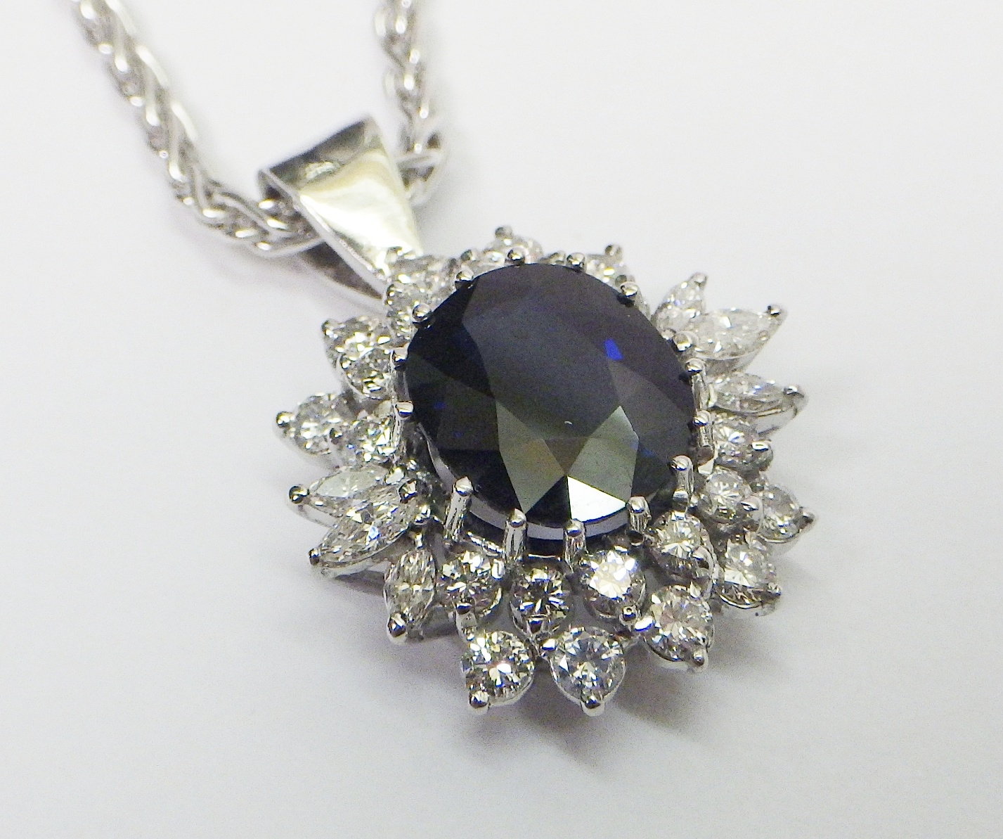 A cluster pendant comprising an oval sapphire surrounded by 28 diamonds of round an marquise cuts, unmarked white metal. The whole suspended on a 9ct gold rope twist chain. Pendant 25mm long / 18mm across. The chain weighs approx 3.5g. The pendant weighs approx 5.5g gross - please note no guarantee as to its metal composition is offered or suggested by Wombell's Auctioneers as it not hallmarked.