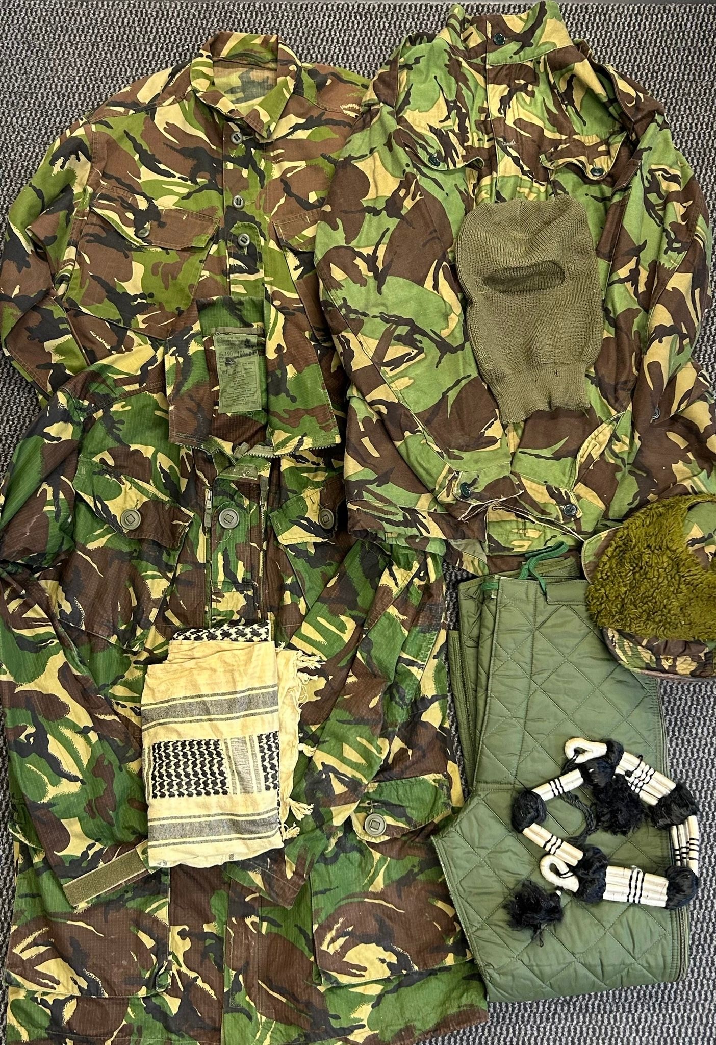A DPM combat smock, a DPM shirt , a pair of extreme cold weather trousers, An SAS desert type shemagh & agal head band, all VGC. A balaclava helmet, an SAS cold weather cap, a 1968 Patt. DPM smock GC