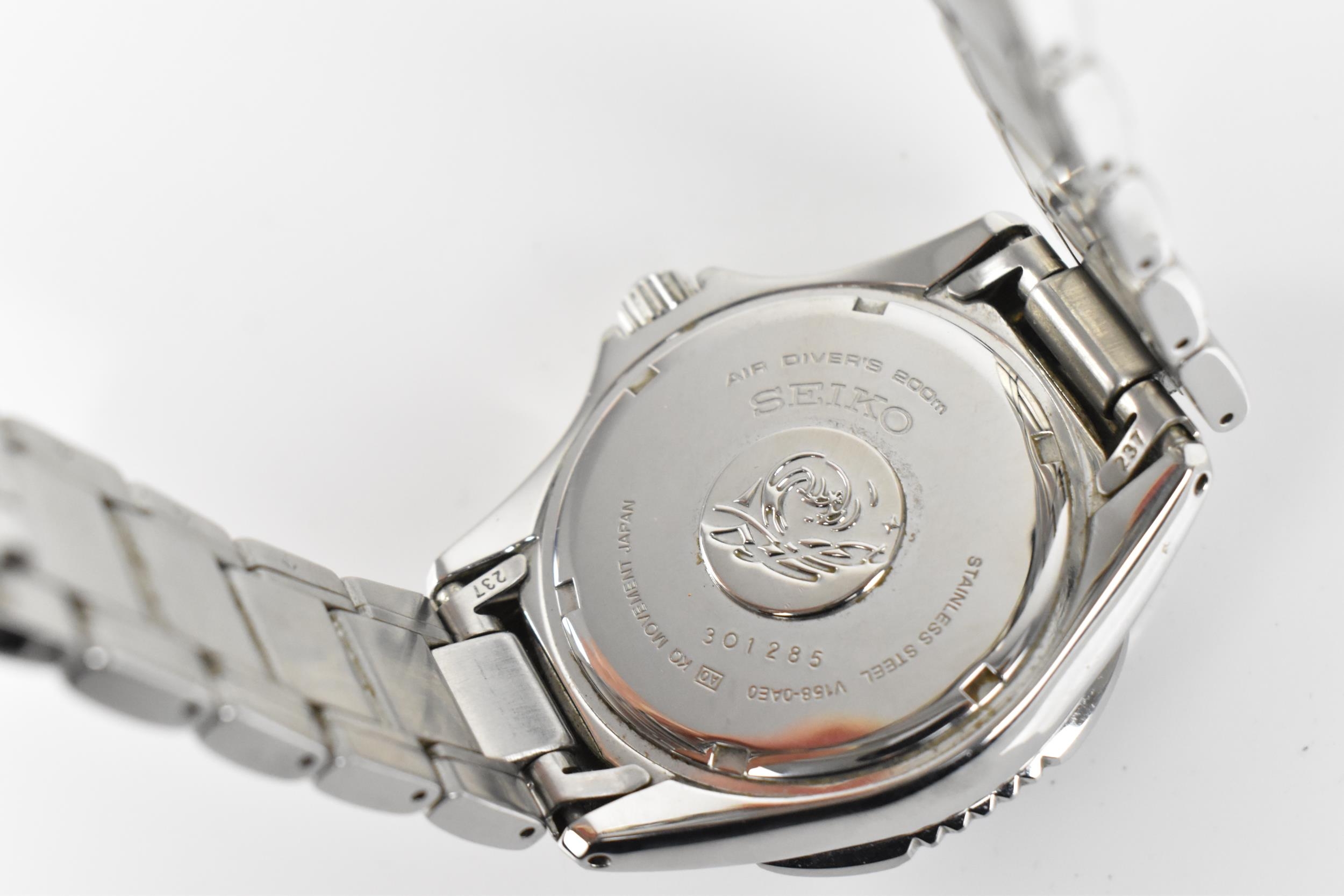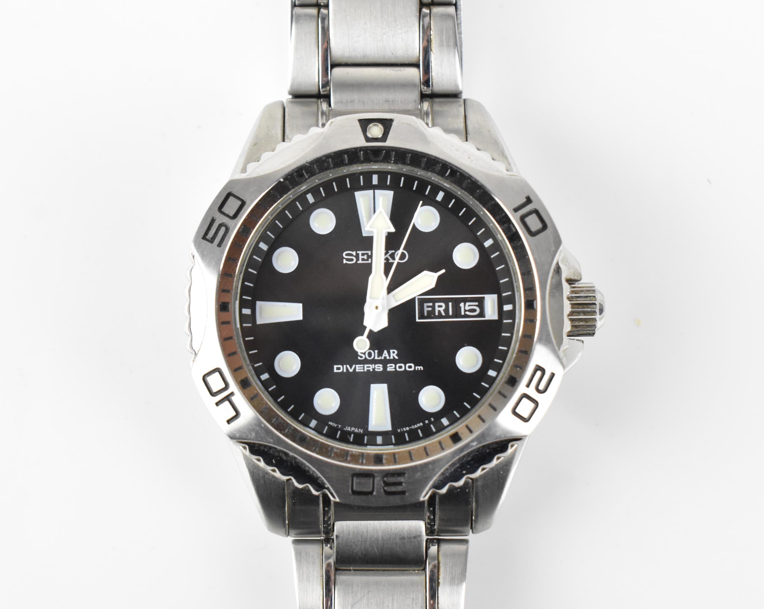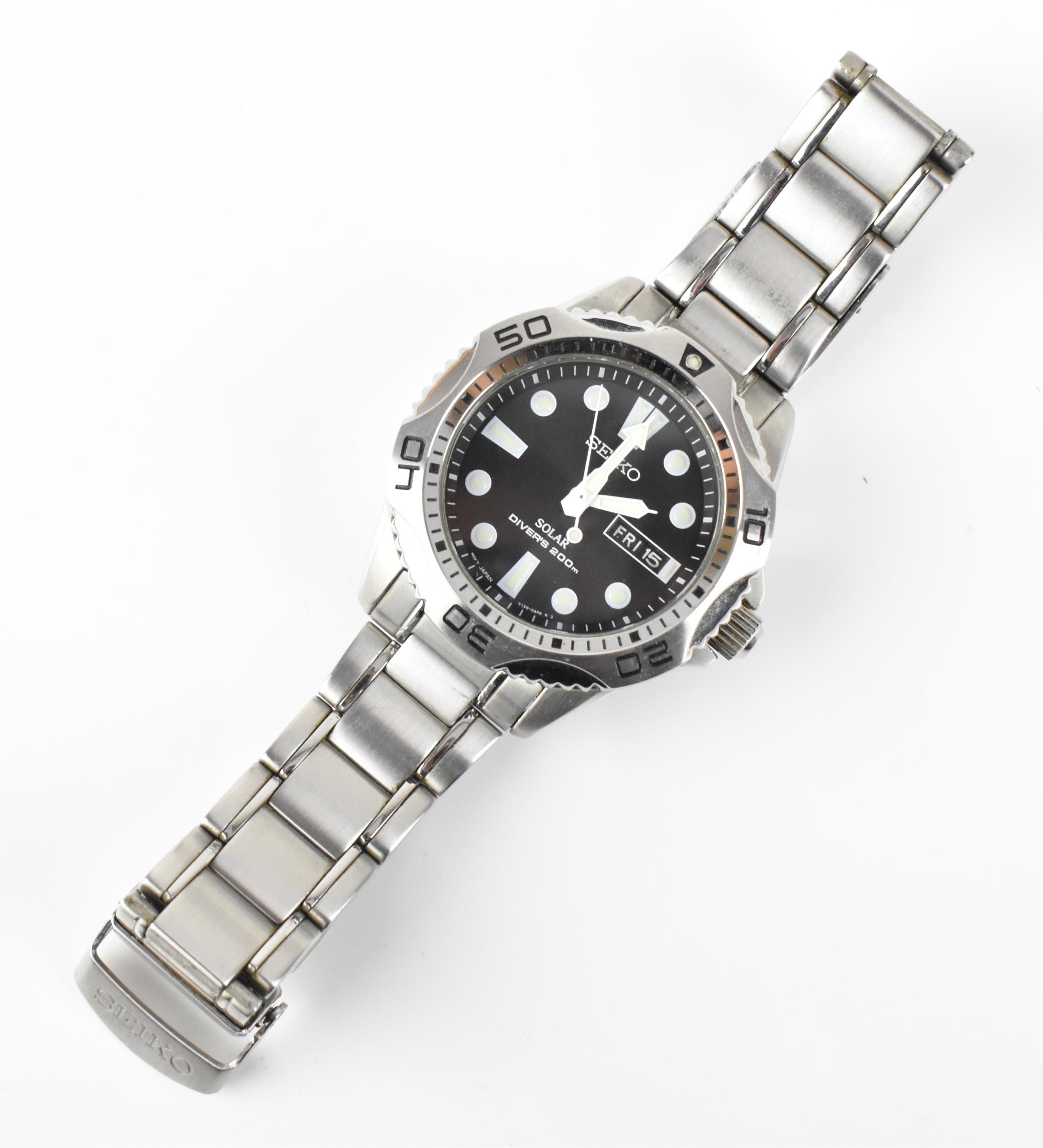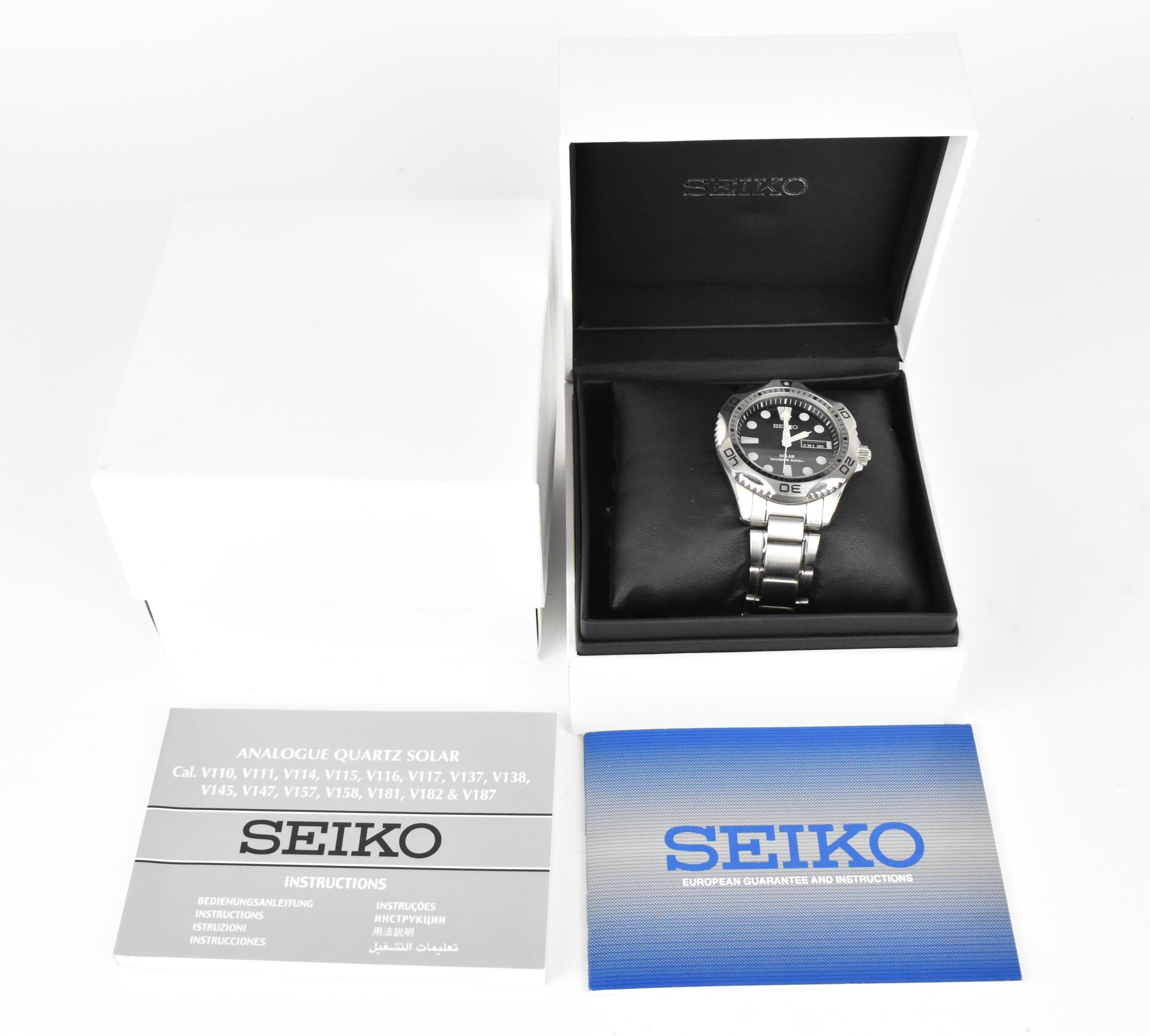 A Seiko Solar Divers 200m, gents, stainless steel wristwatch, circa 2015, serial number 301285, having a black dial with luminous markers, centre seconds, day and date aperture at '3', stainless steel bracelet, with original box and paperwork, 42mm