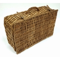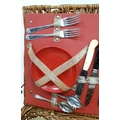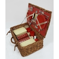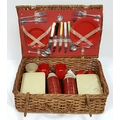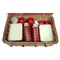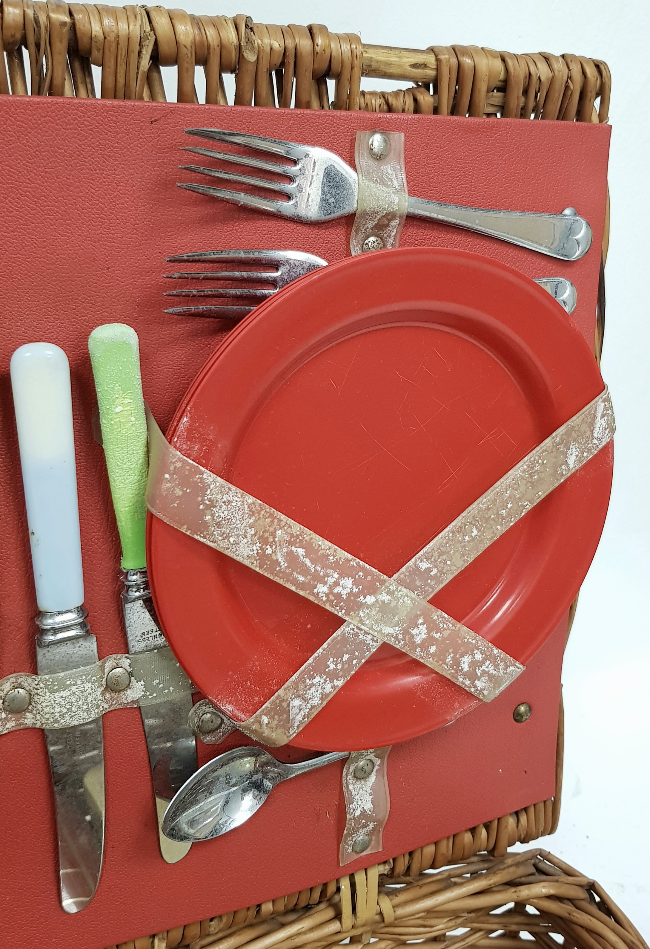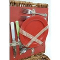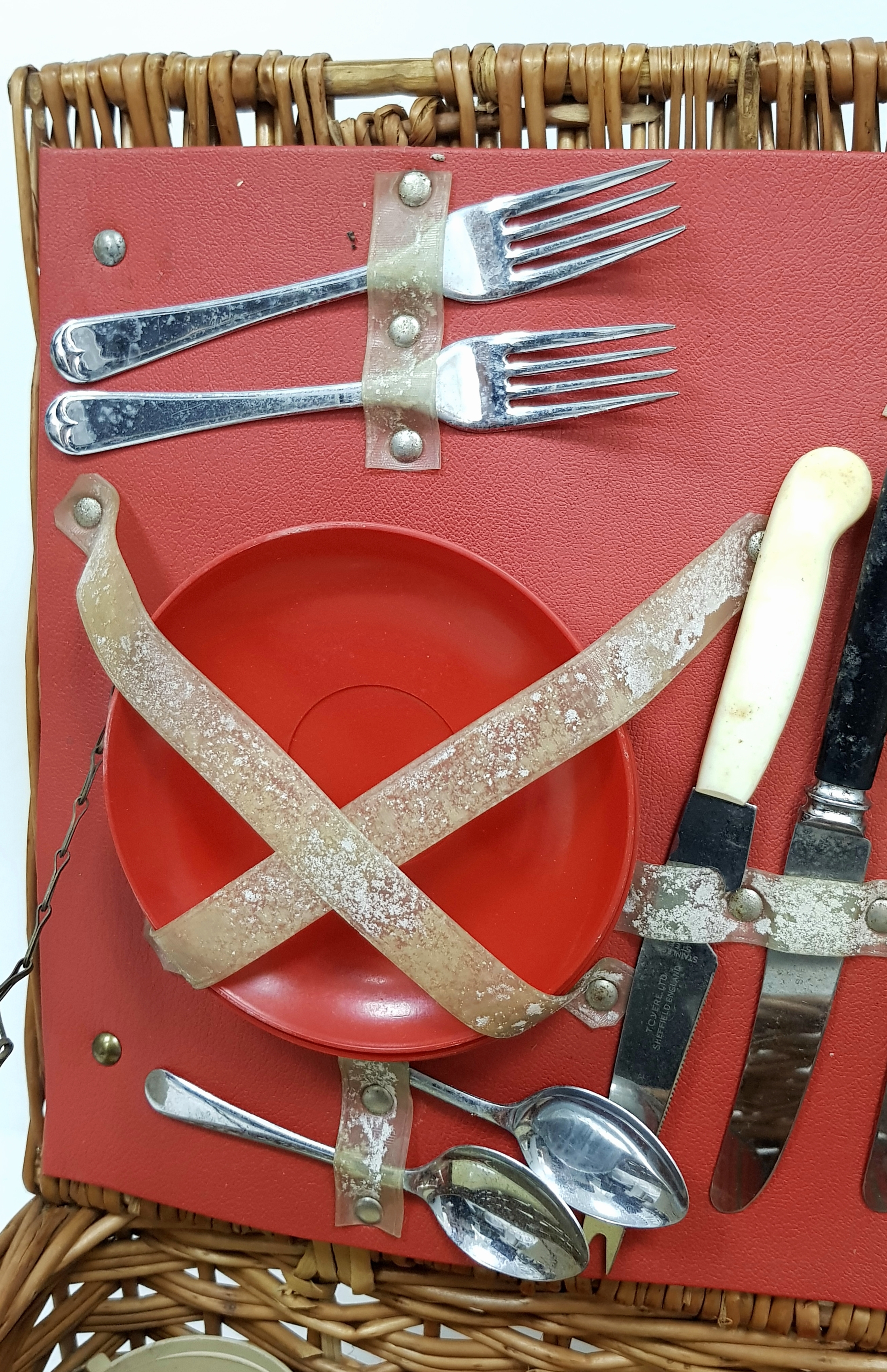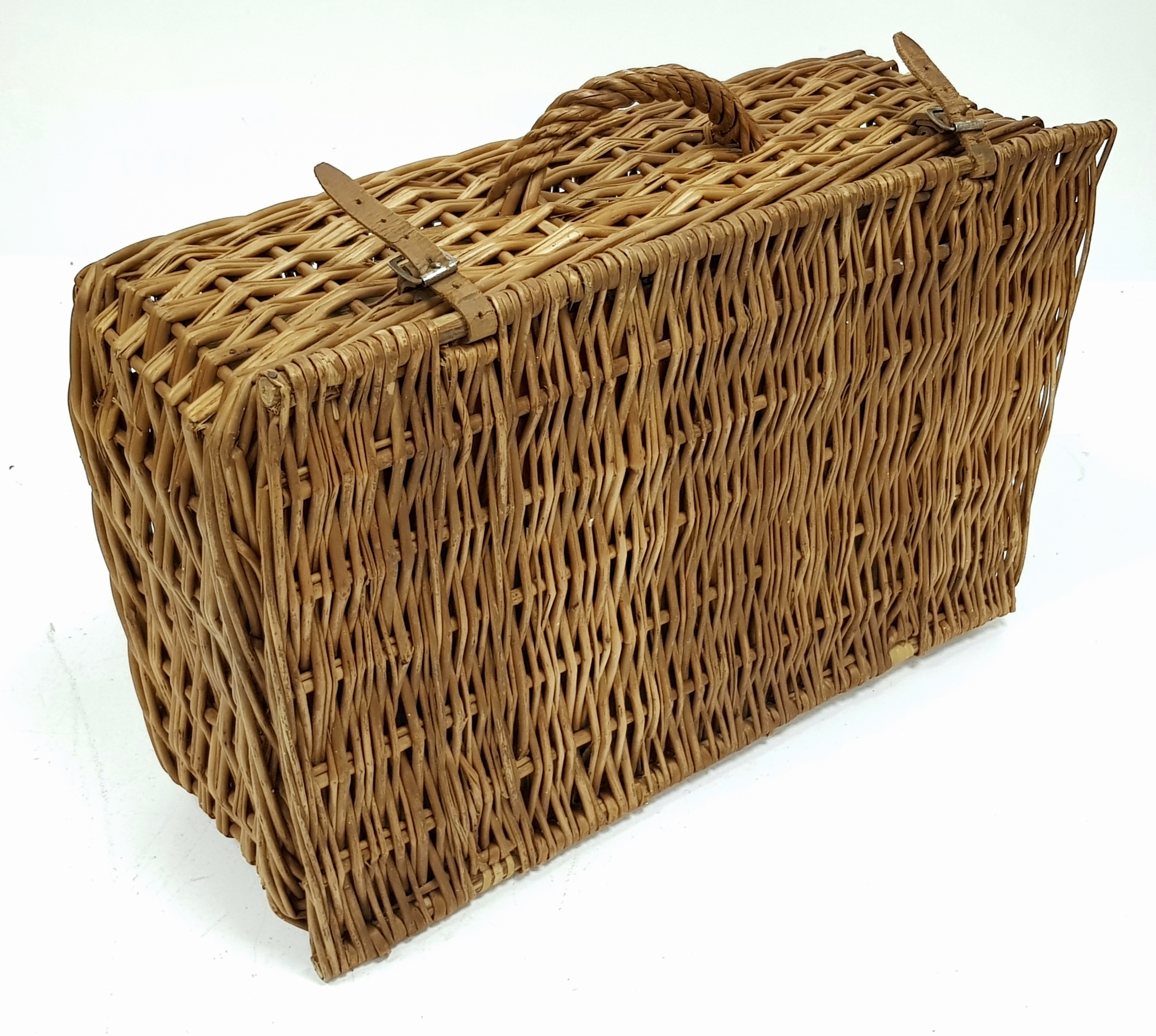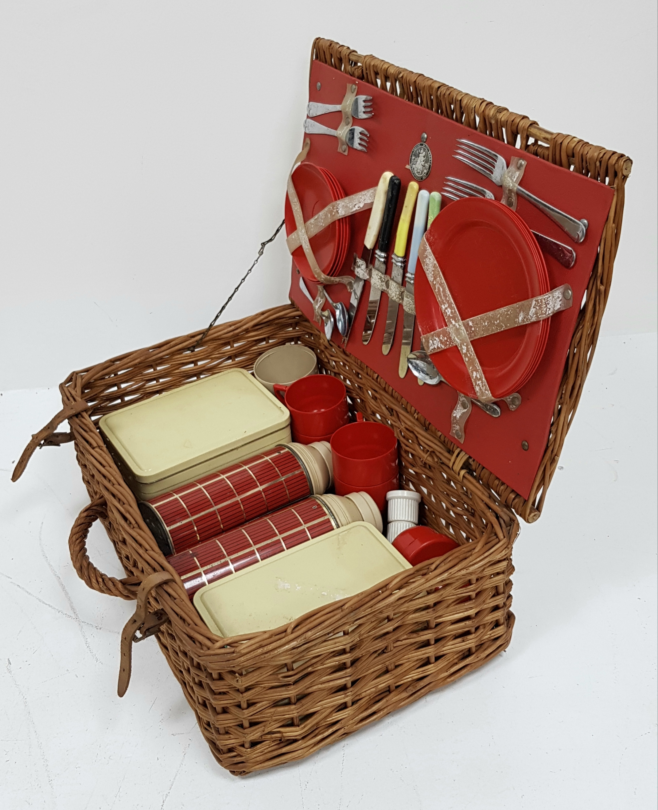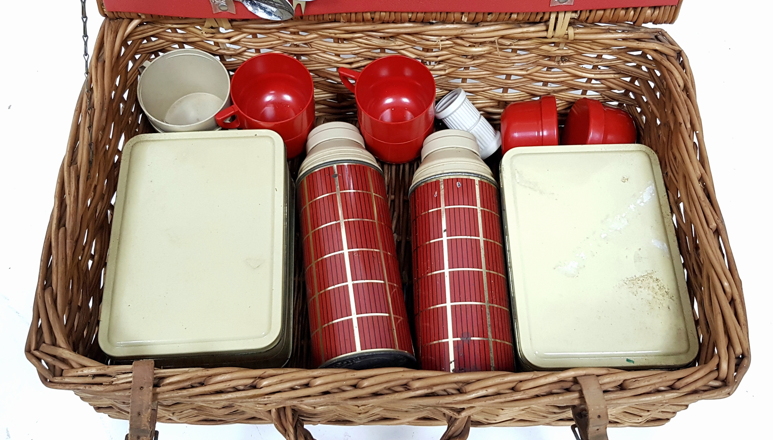 A vintage wicker picnic basket with buckle fasteners, containing two original Thermos flasks, and food containers along with the original plates and bowls. See photos for condition. Sold as found.