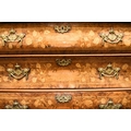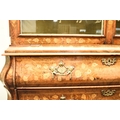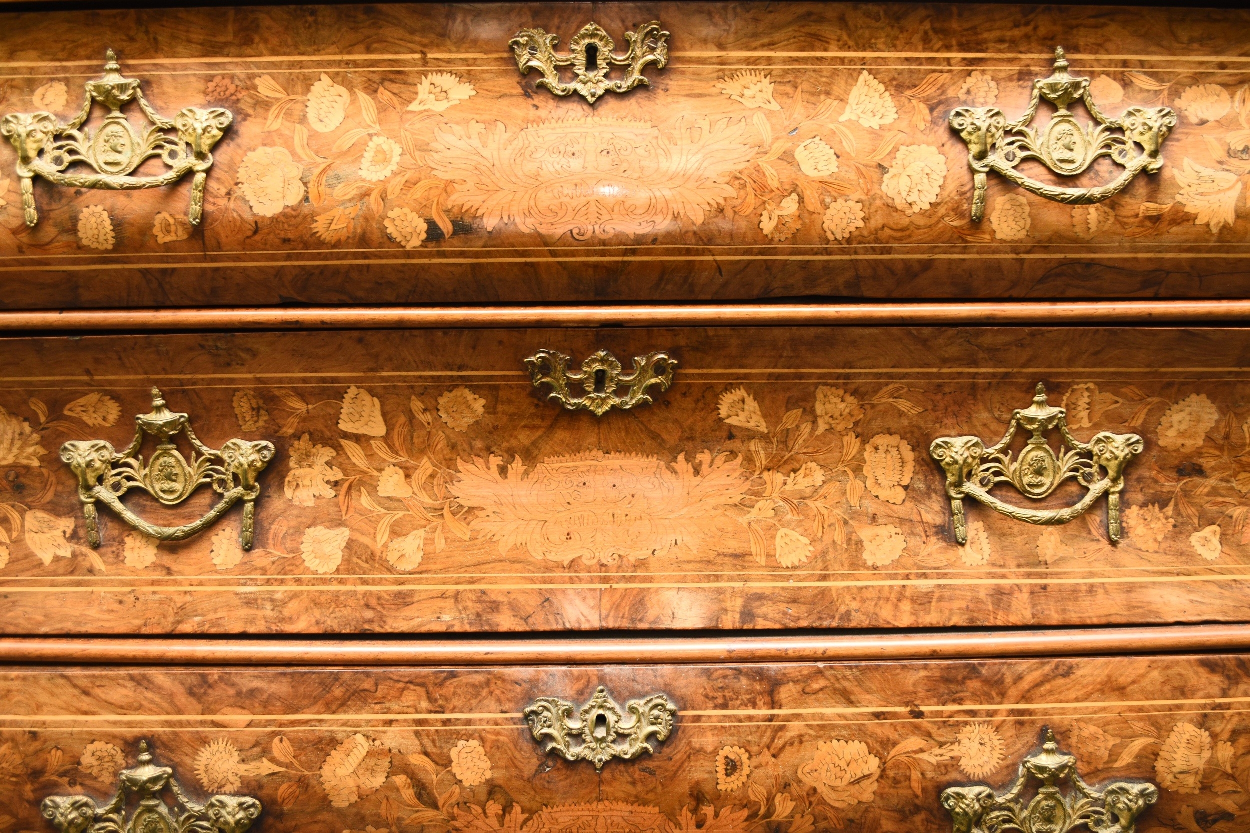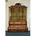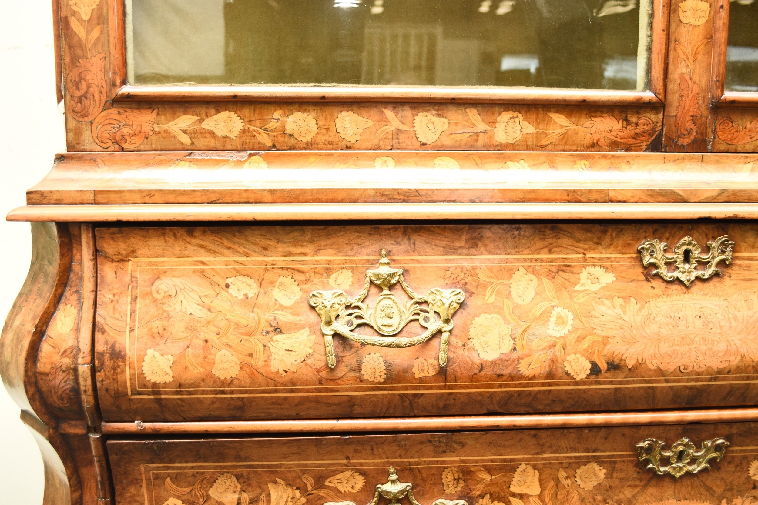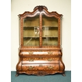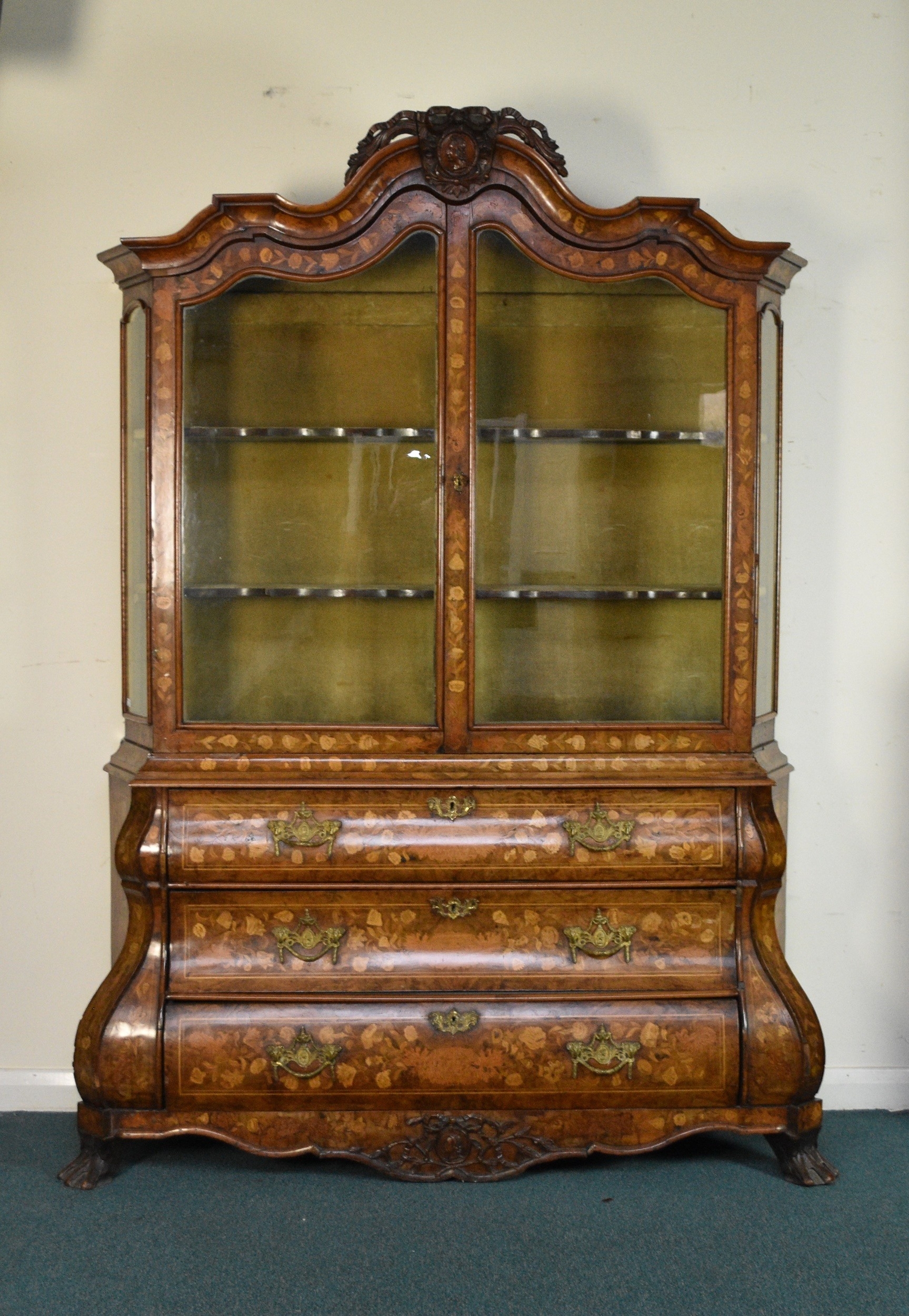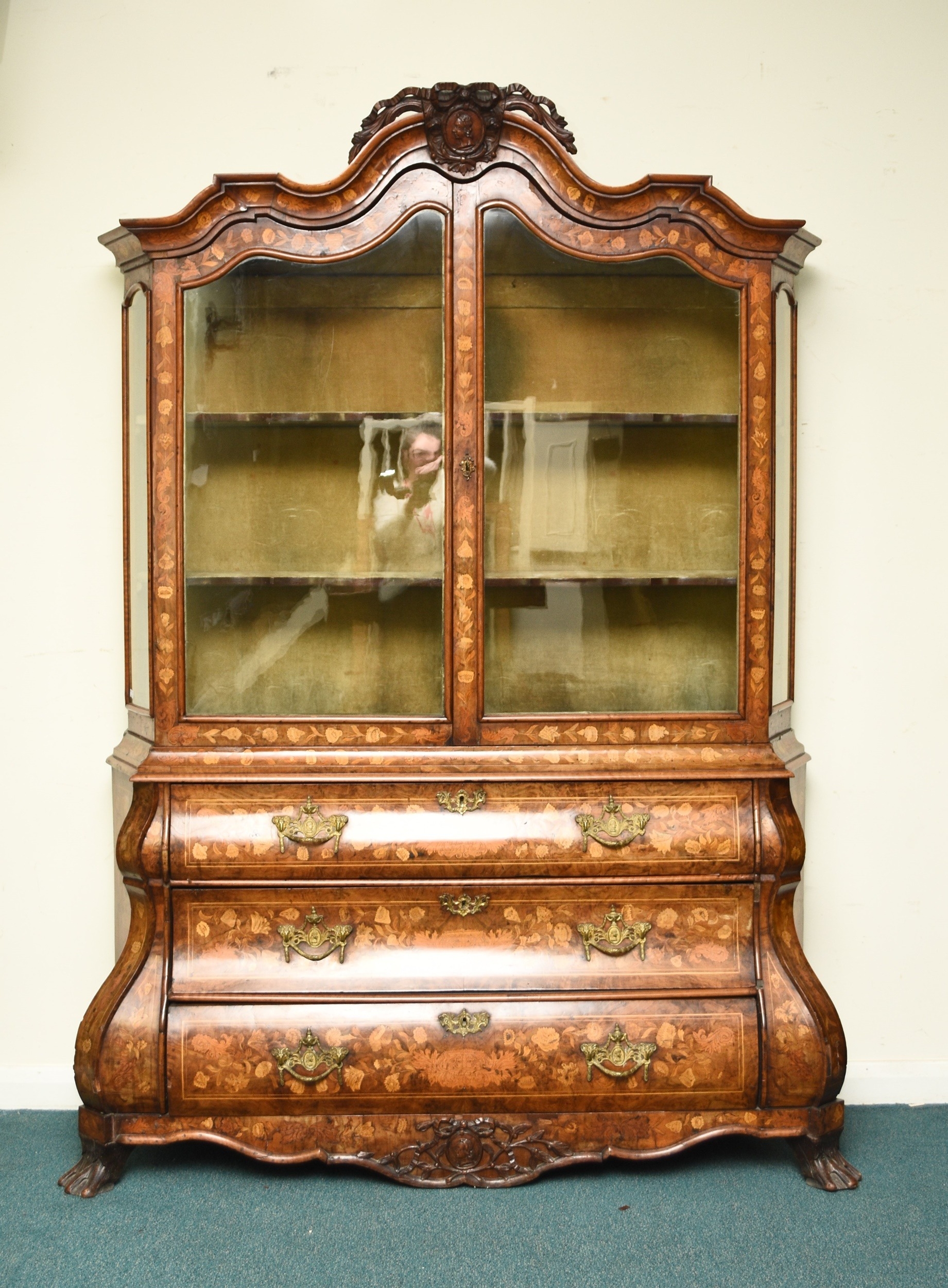 A Dutch walnut, fruitwood and marquetry bombe display cabinet, 19th century The arched top centred by a scrolling foliate and portrait cameo mount, above a pair of glazed doors, the interior fitted with two shelves, above three long drawers, inlaid with flowers and foliage on scrolling branches, the panelled sides with flowering urns, birds and branches. 160cm wide x 50cm deep x 216cm high Condition:Overall good with general signs of age and use. Some small veneer losses to the sides. Veneer splitting and slightly lifting on the side support scrolls. Minor joint shrinkage to the sides of the base. Small losses to beading on front drawer surround. Interior velour good with minor signs of age and use.