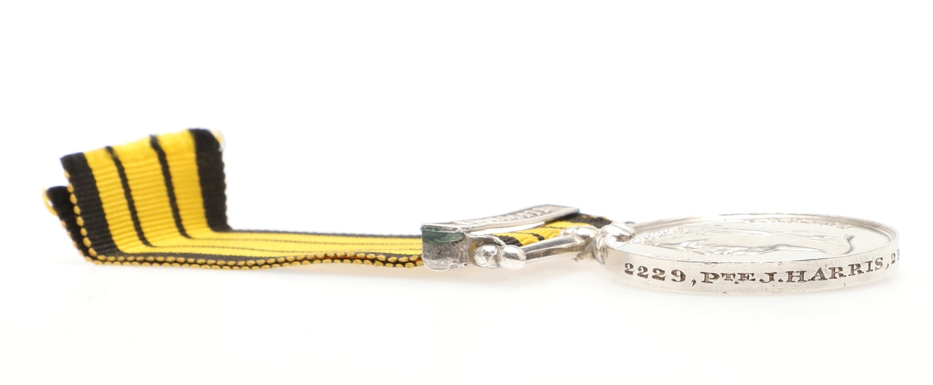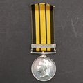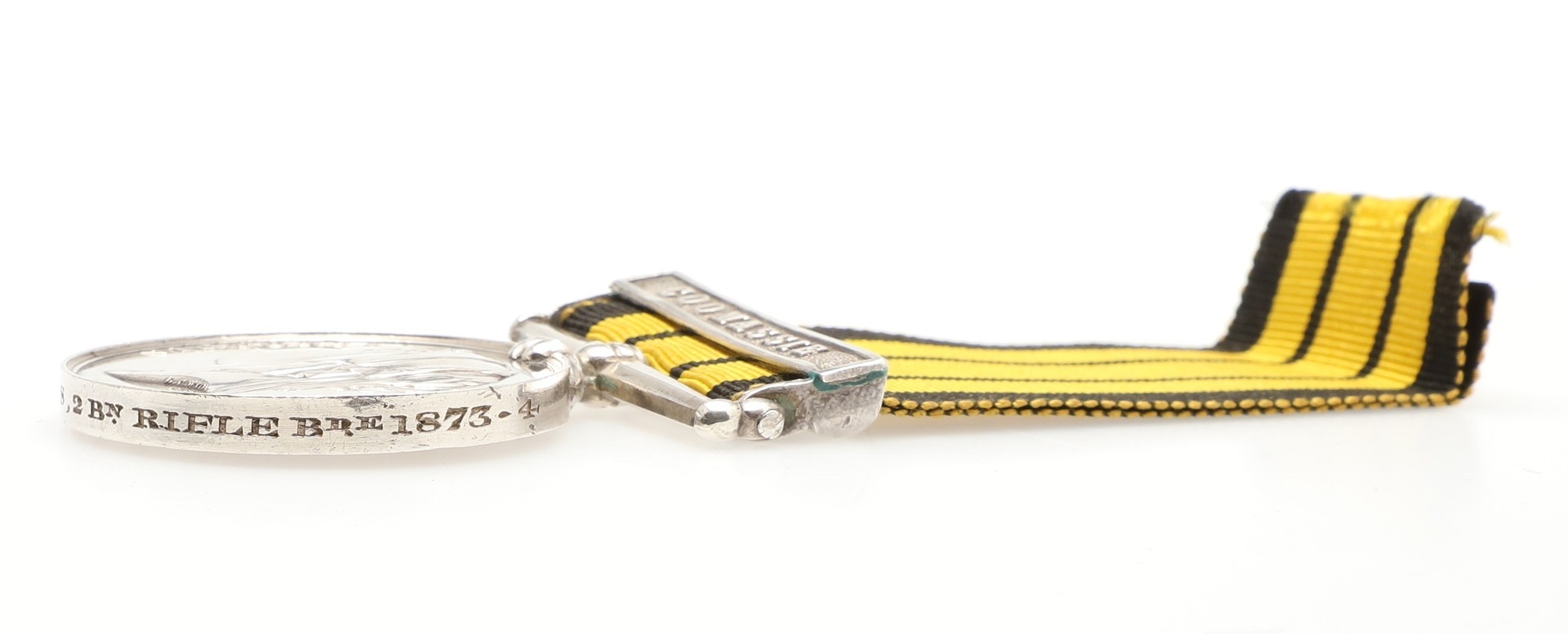 AN ASHANTEE MEDAL 1873-74 WITH COOMASSIE CLASP TO THE RIFLE BRIGADE. An Ashantee Medal with Coomassie clasp named to 2229 Pte J. Harris 2 Bn Rifle Bde 1873-4. One of 621 Ashantee medals with clasp to the 2nd Battalion of the Rifle brigade. With copied roll extract confirming the entitlement to this clasp.