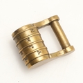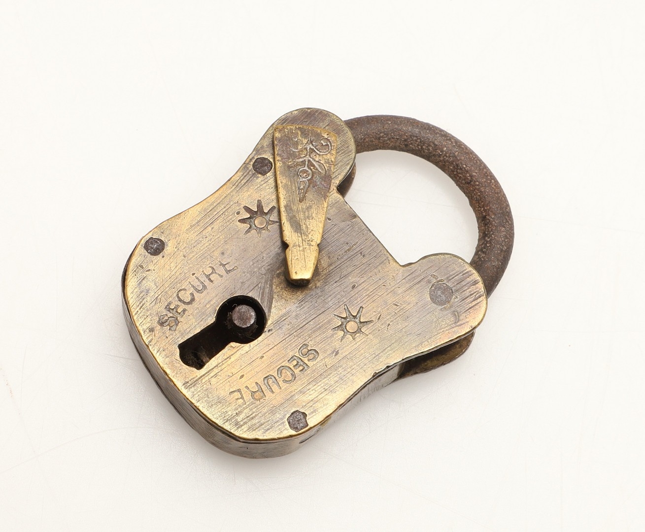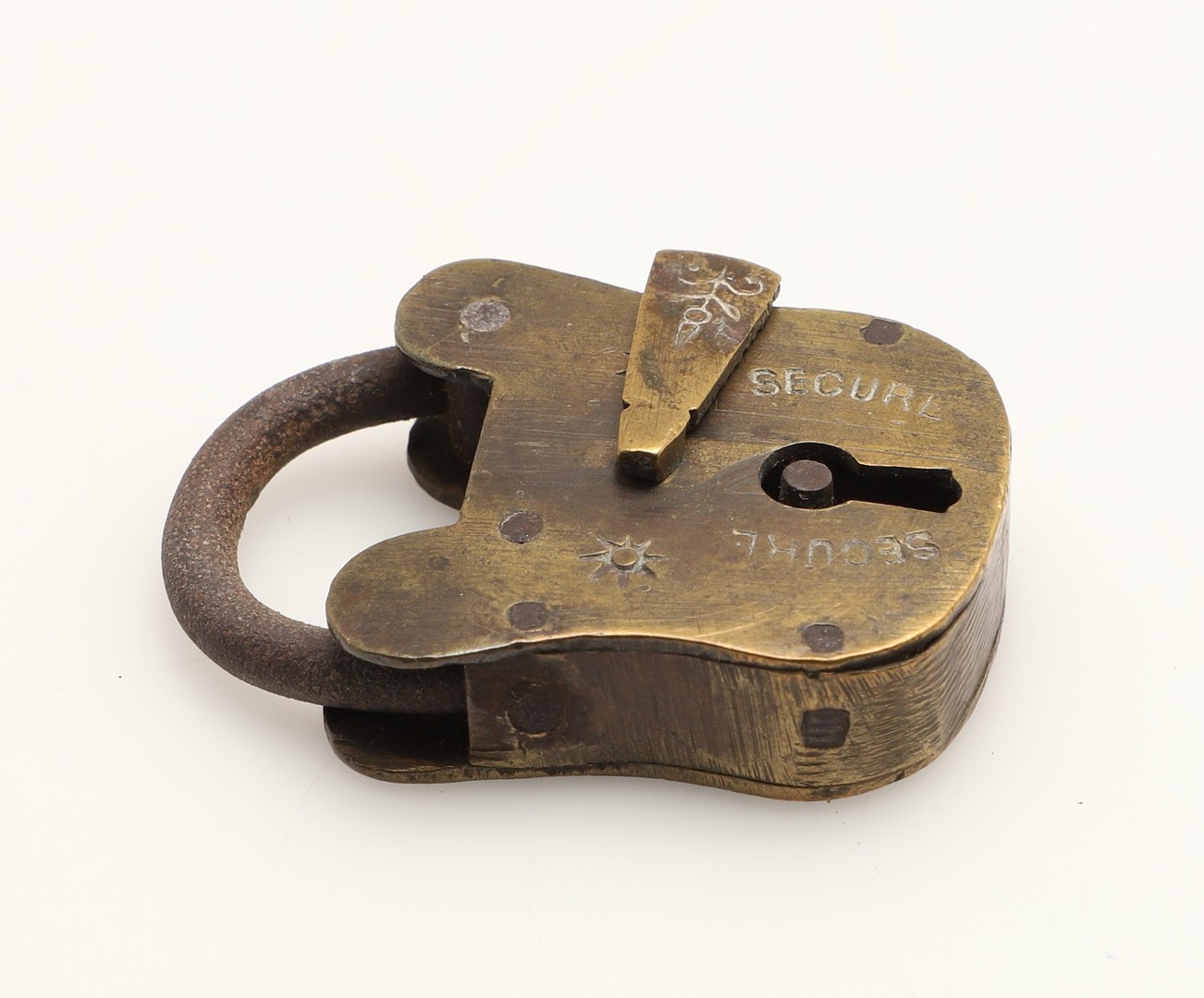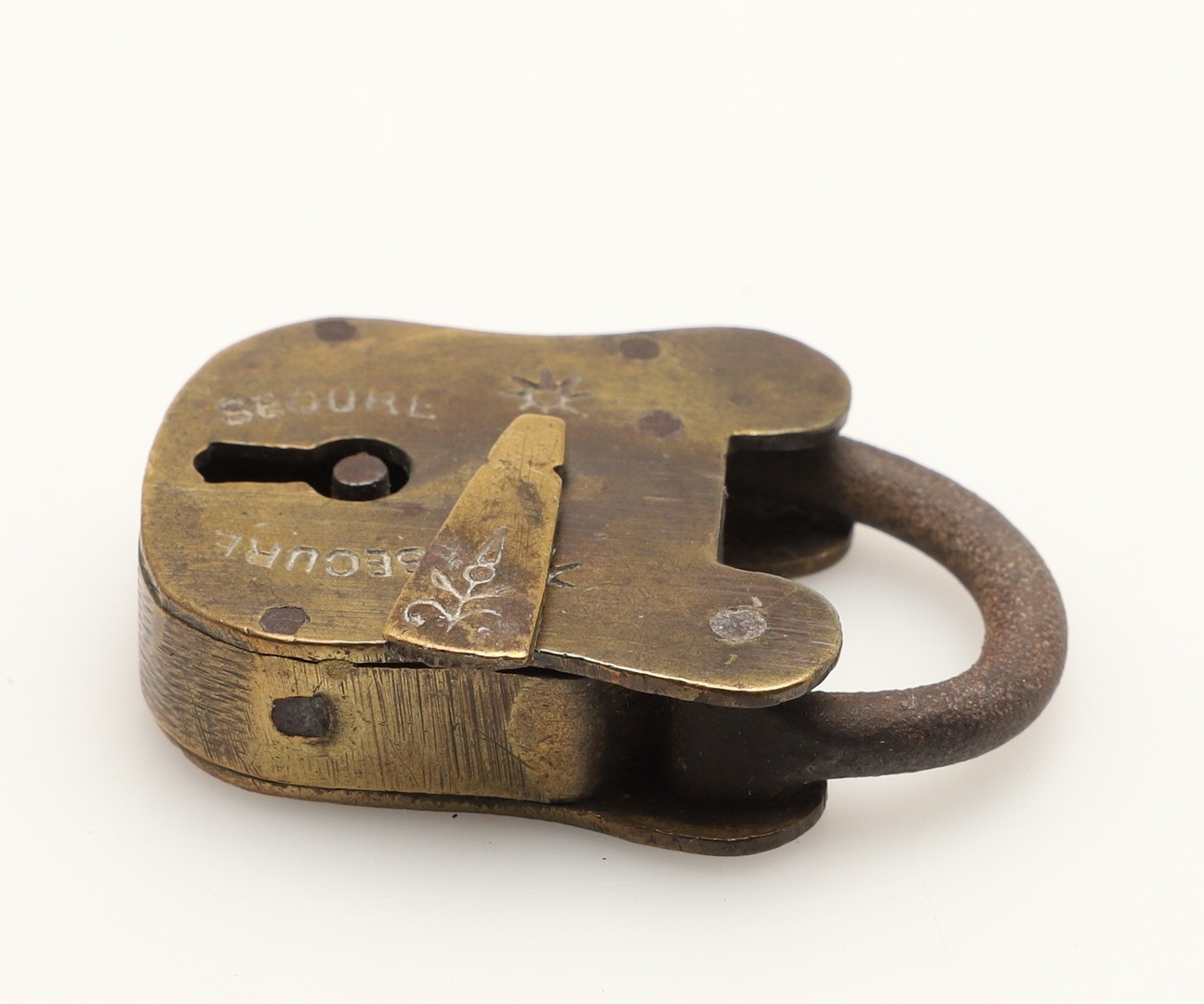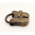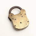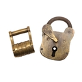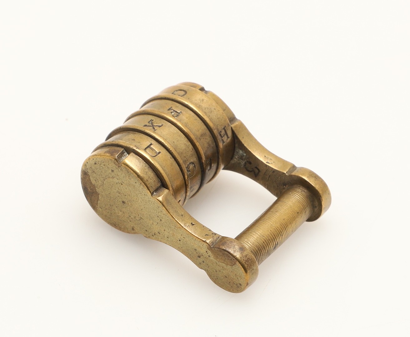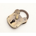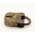 A RARE VICTORIAN BRASS COMBINATION ALPHABET LOCK. with four rotating rings, 2cm wide, together with a late 19th/early 20th century brass padlock, 3cm x 4.5cm.