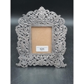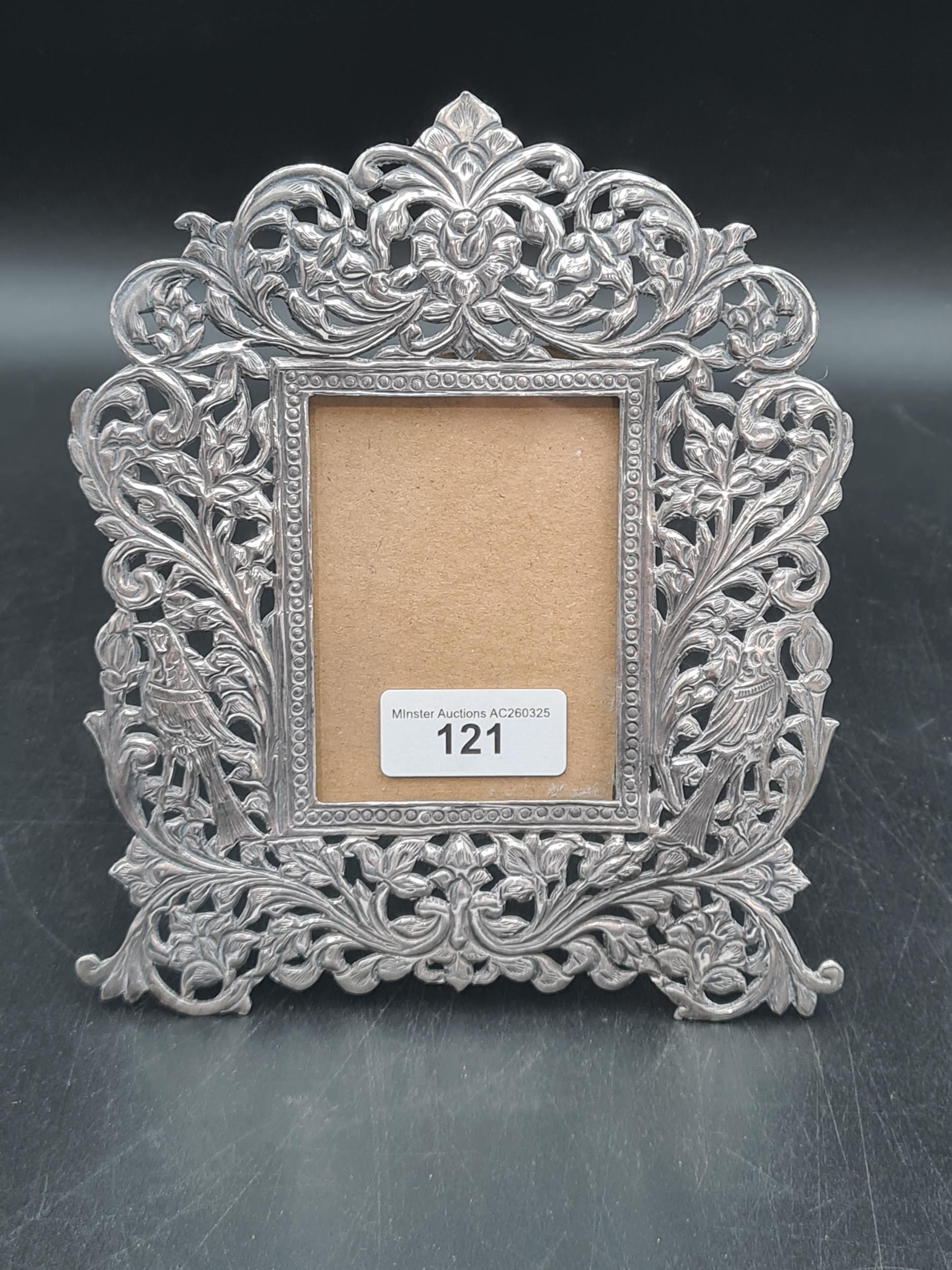 A white metal Photograph Frame with pierced bird and leafage scroll design, 7 x 6in