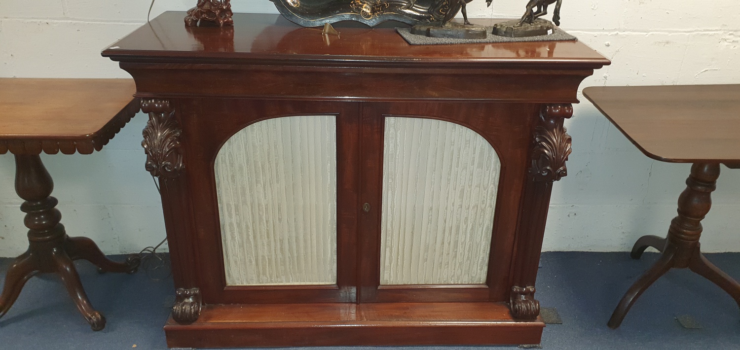 A 19th century mahogany chiffonier, with single drawer over glazed doors between acanthus leaf scroll supports -