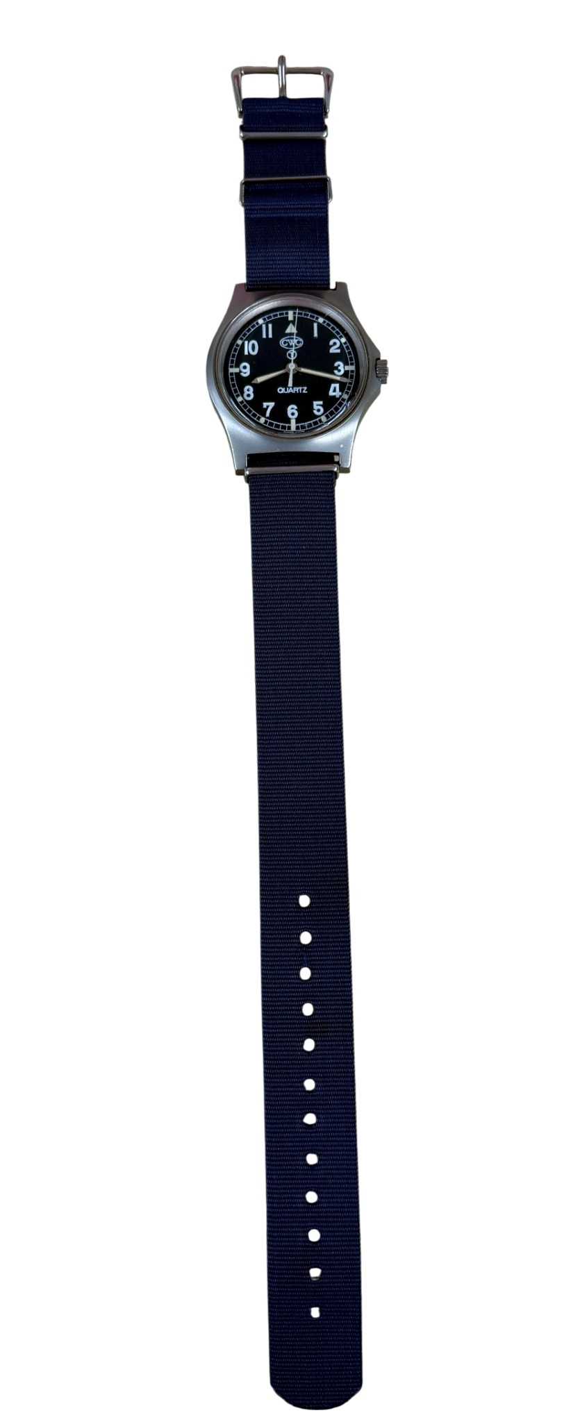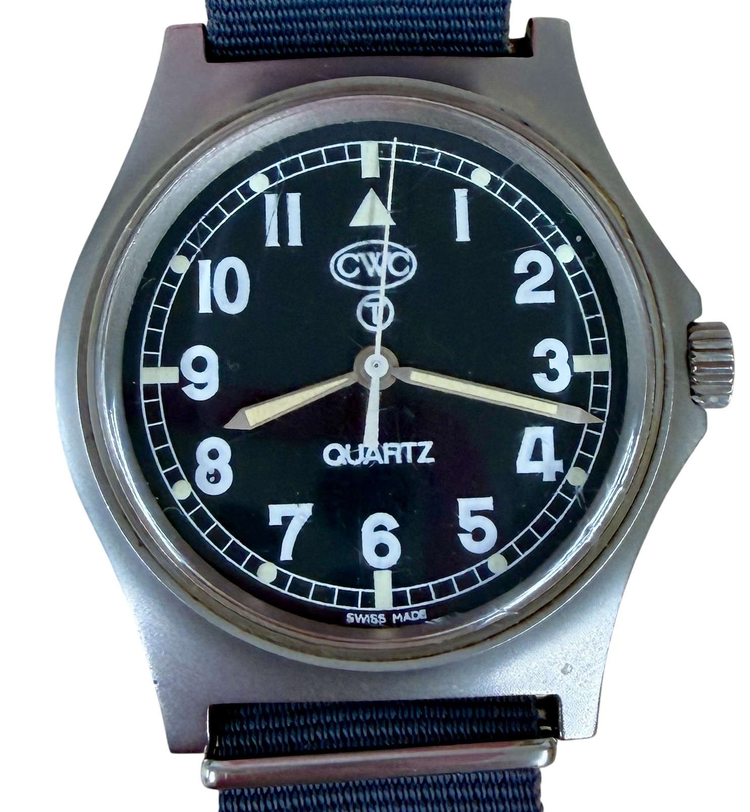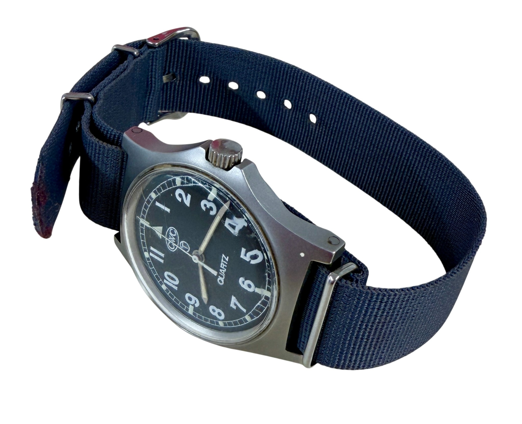 swiss made quartz movement, black dial with arabic numerals, luminous hands and markers, centre seconds, signed CWC dial.
