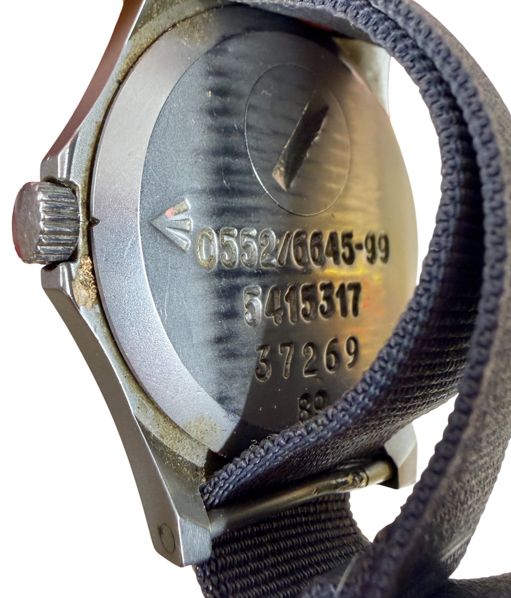Matte military case with fixed bar straps, screw down case back engraved with broad arrow and MoD issue number.