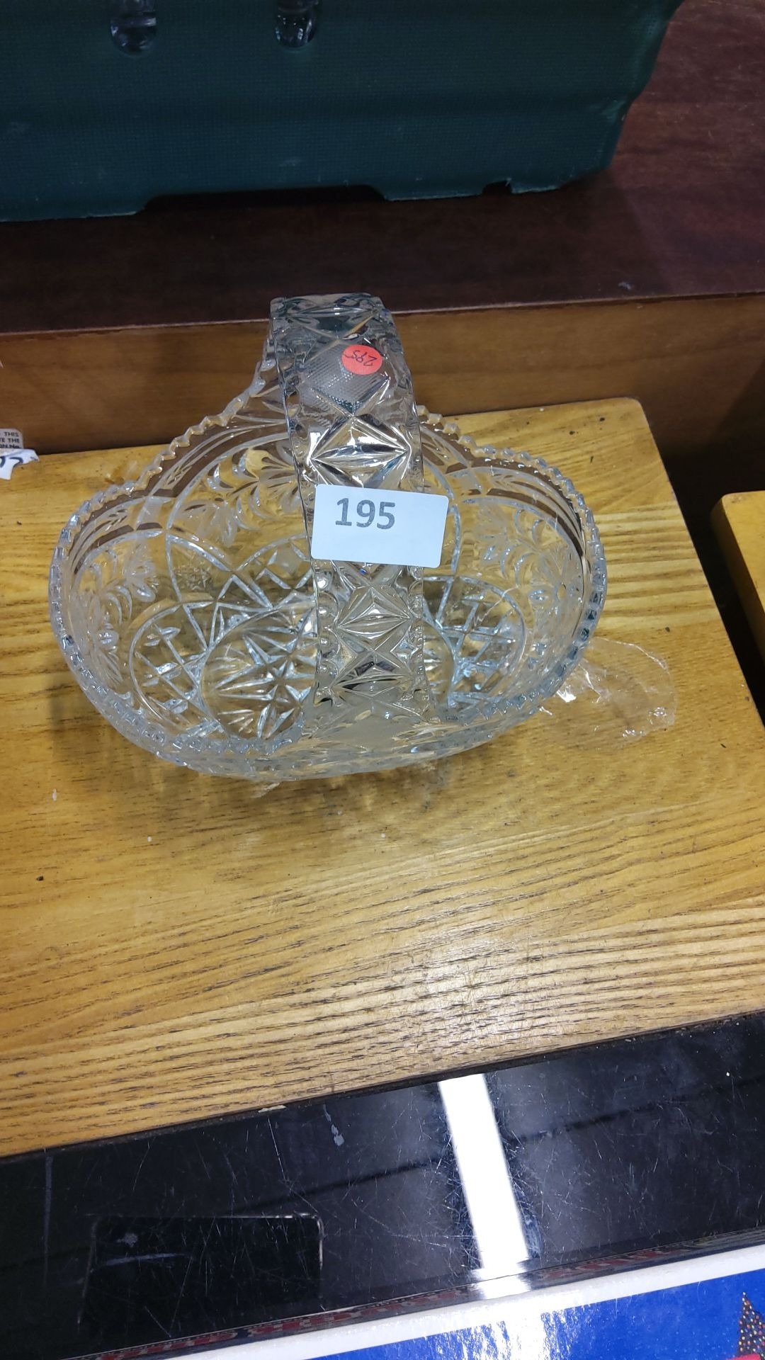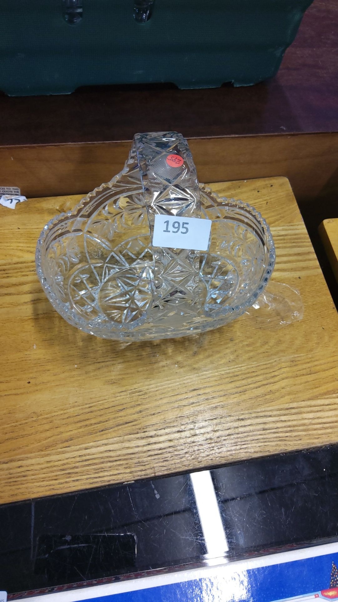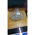 Cut glass basket with intricate floral patterns, featuring a decorative handle.