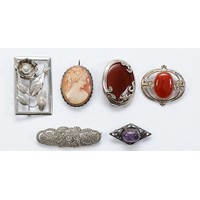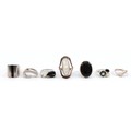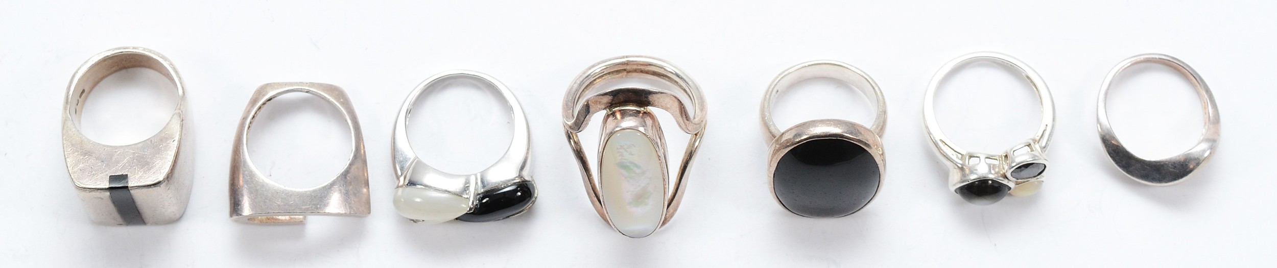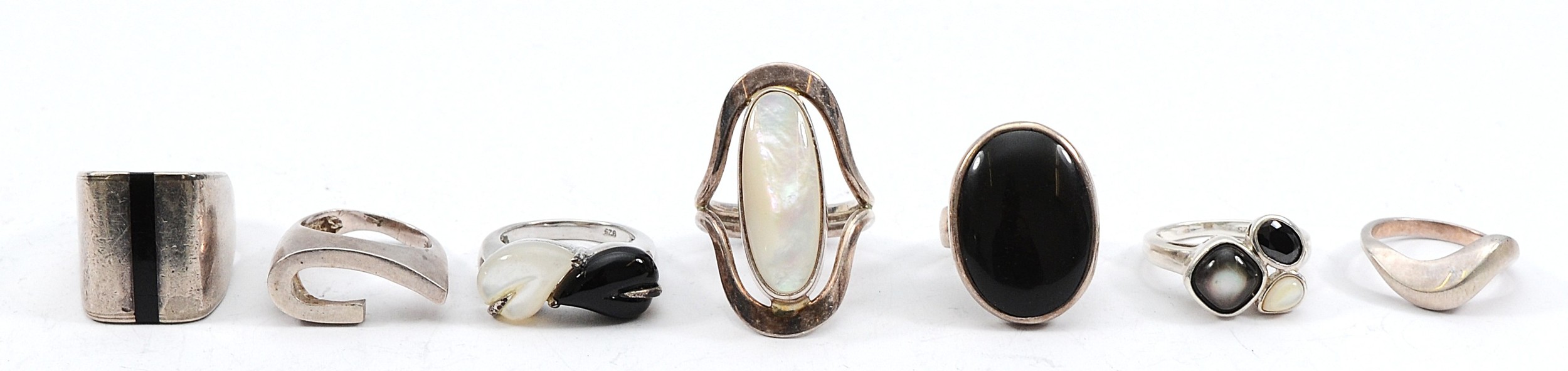 A silver signet ring, London 1972, M, with six 925 silver rings, N-T, 67g