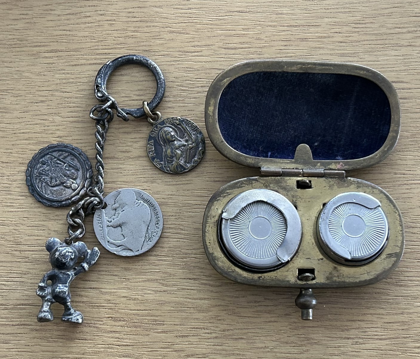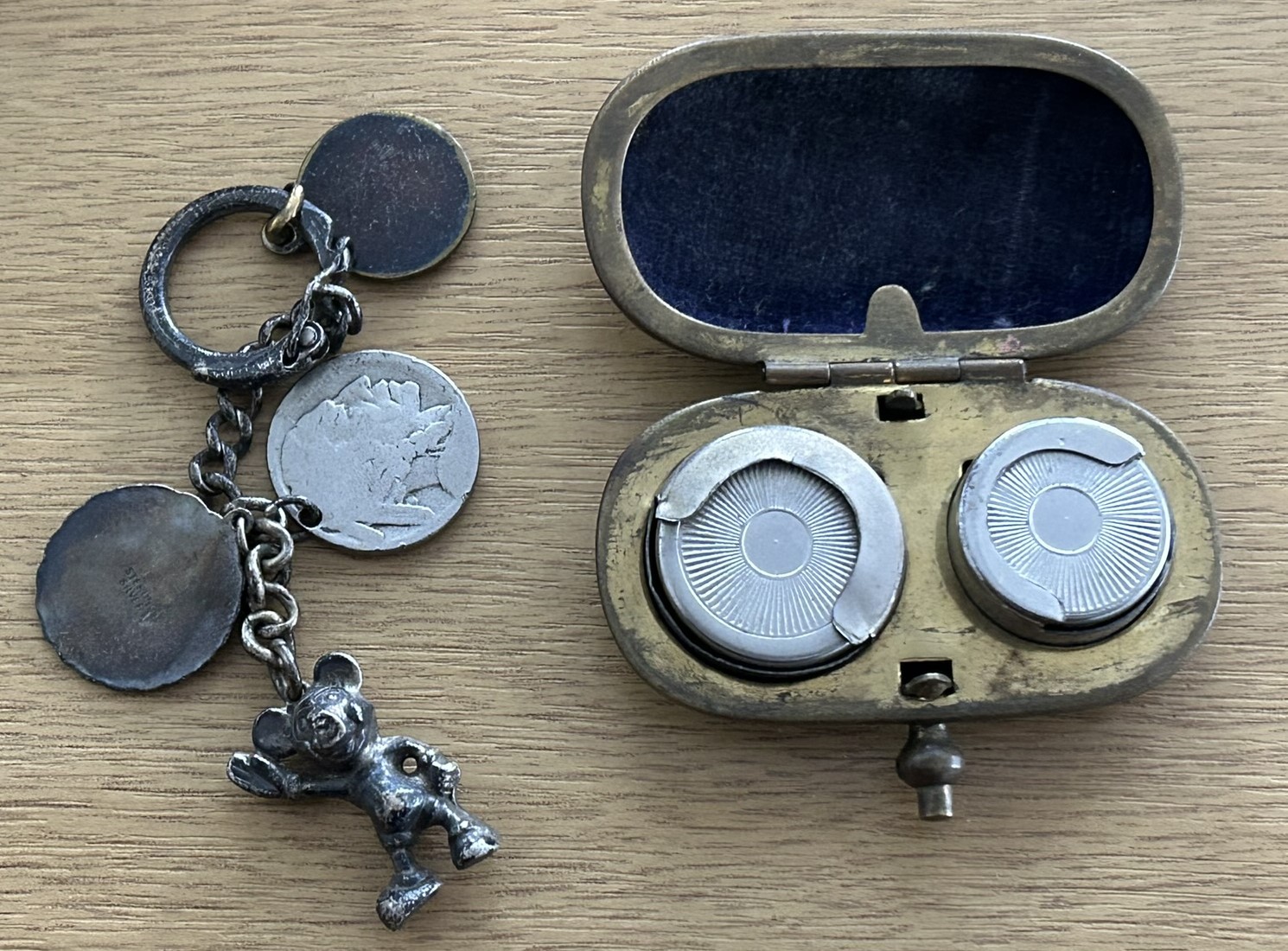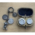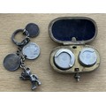 A Small Silver Keyring with three additional charms (one a silver five Cents Buffalo Coin and another in silver, Also a Vintage Sovereign Holder