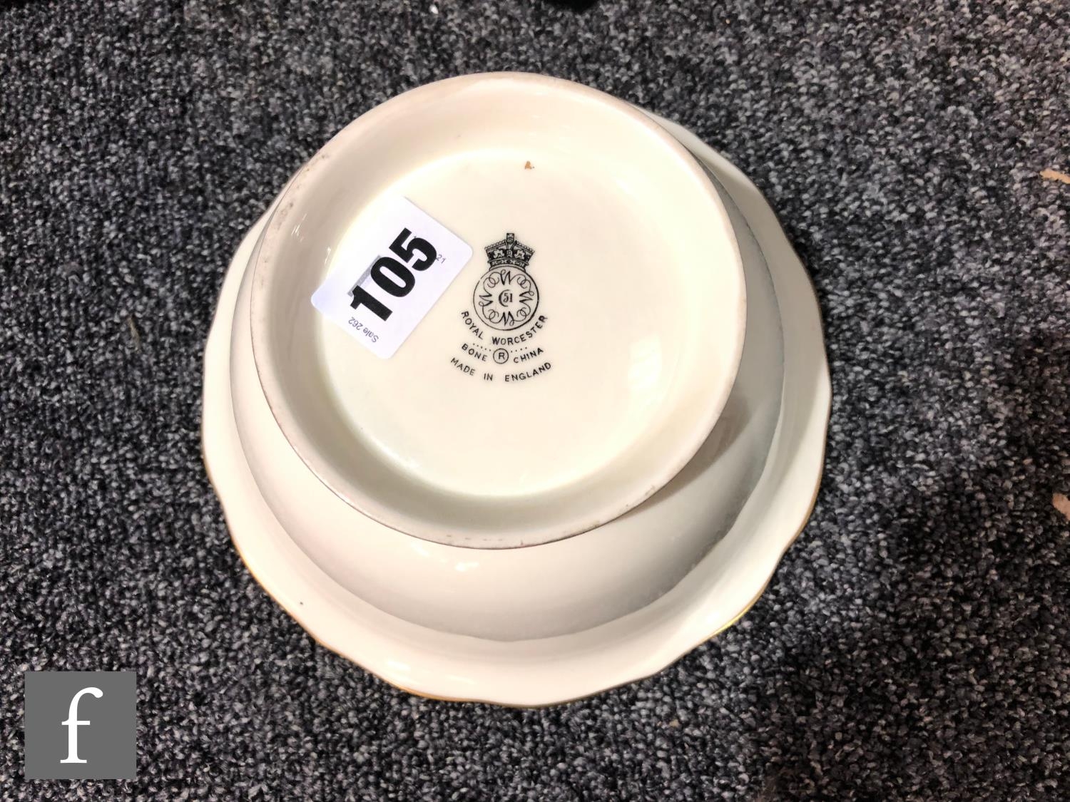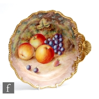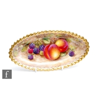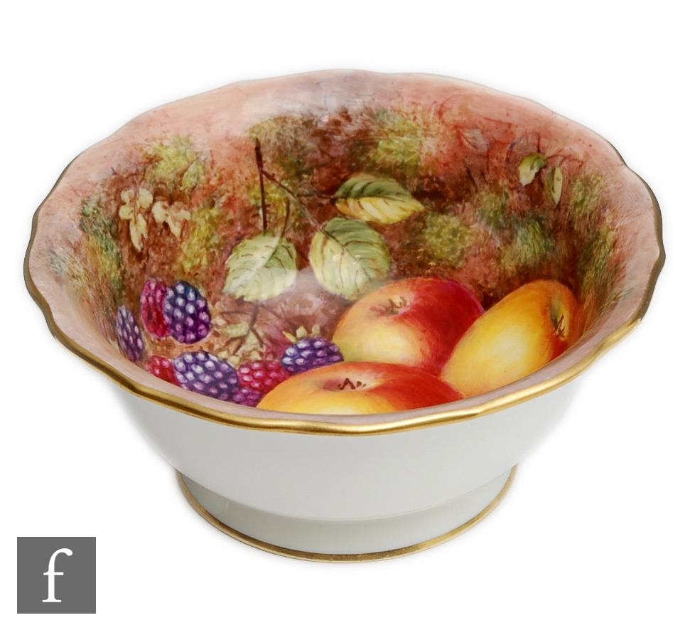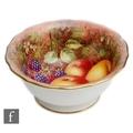 A Royal Worcester Fallen Fruits high sided bowl decorated to the interior by Freeman with hand painted apples and blackberries, the exterior in white, signed, black printed mark with date code for 1959, diameter 18cm, height 8cm.