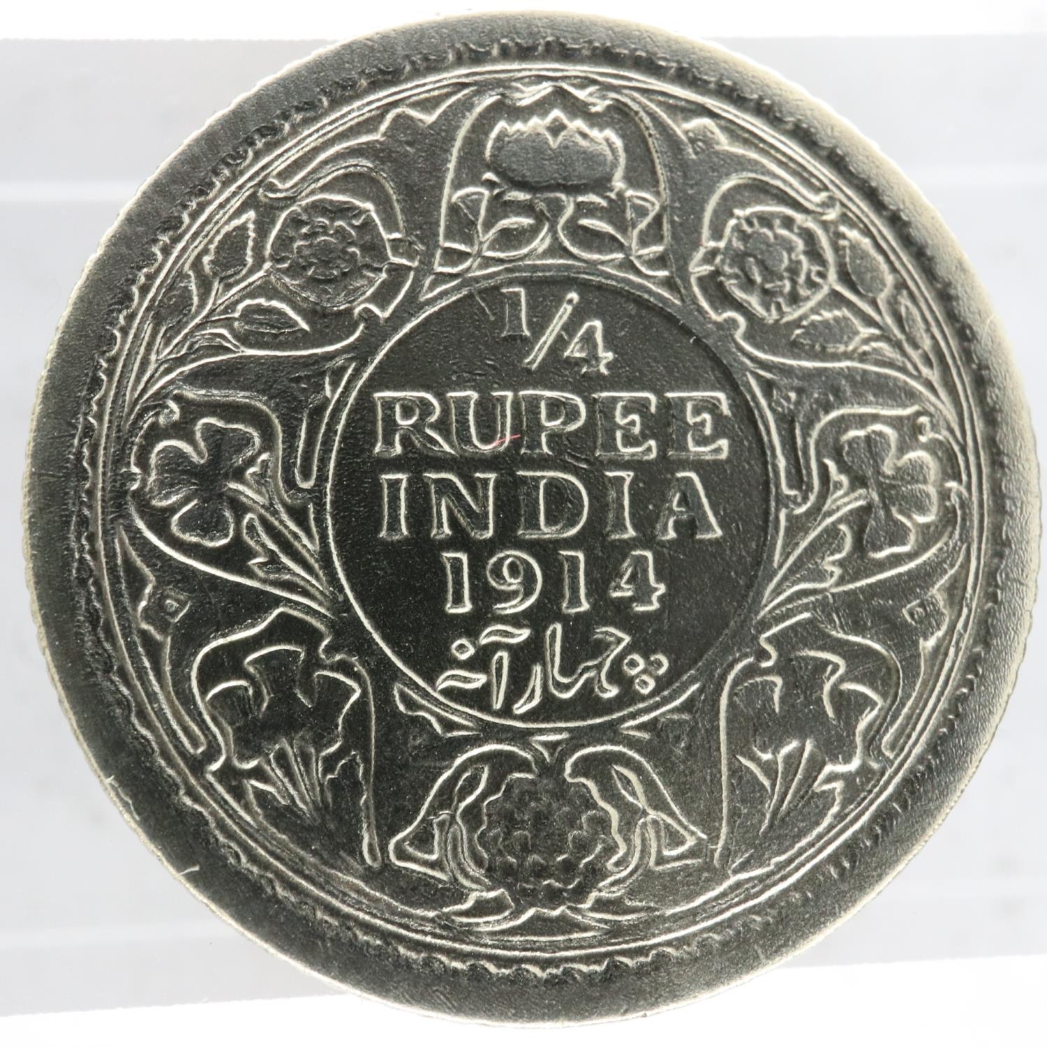 1914 silver Quarter Rupee of George V. UK P&P Group 0 (£6+VAT for the first lot and £1+VAT for subsequent lots)