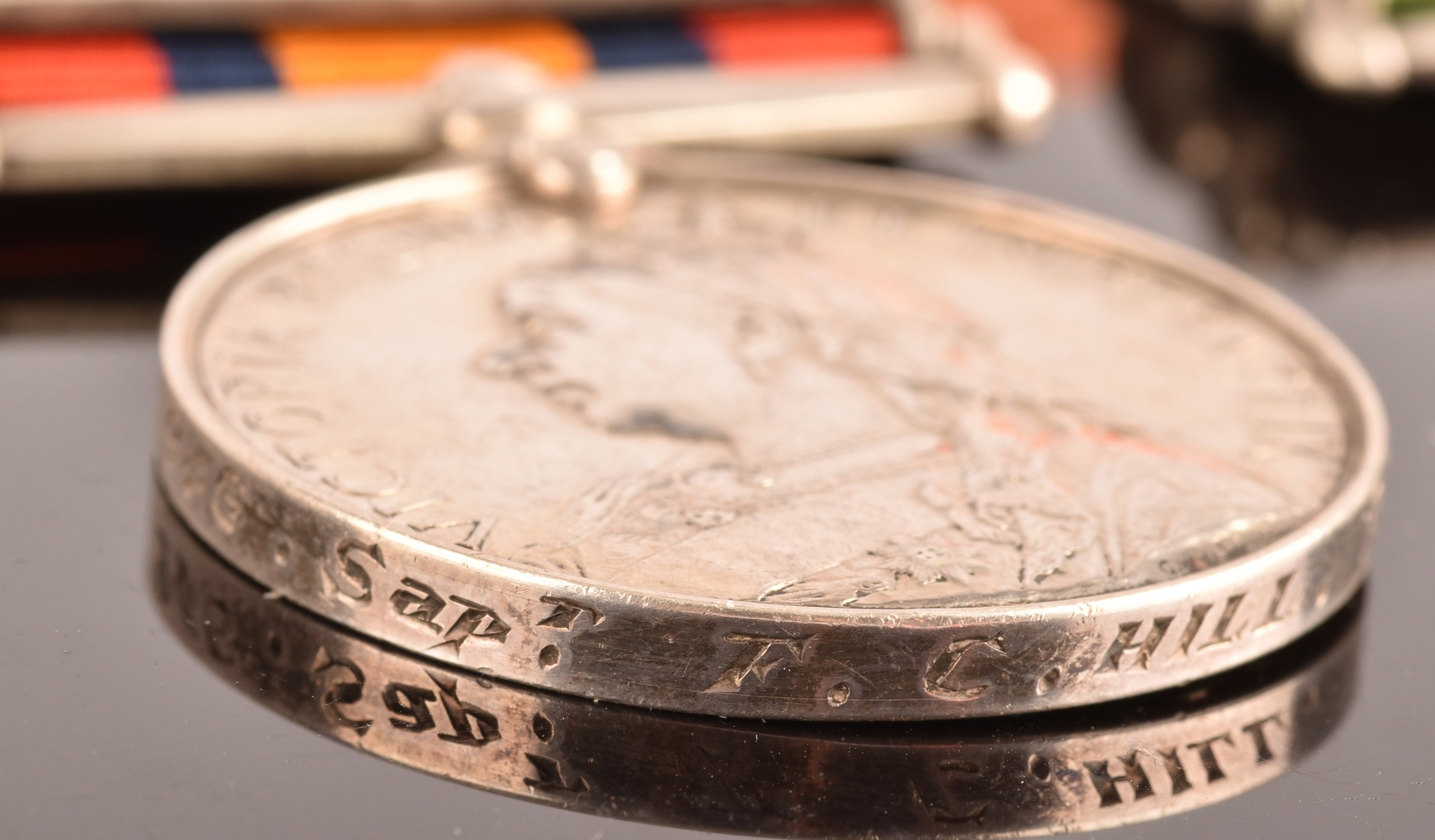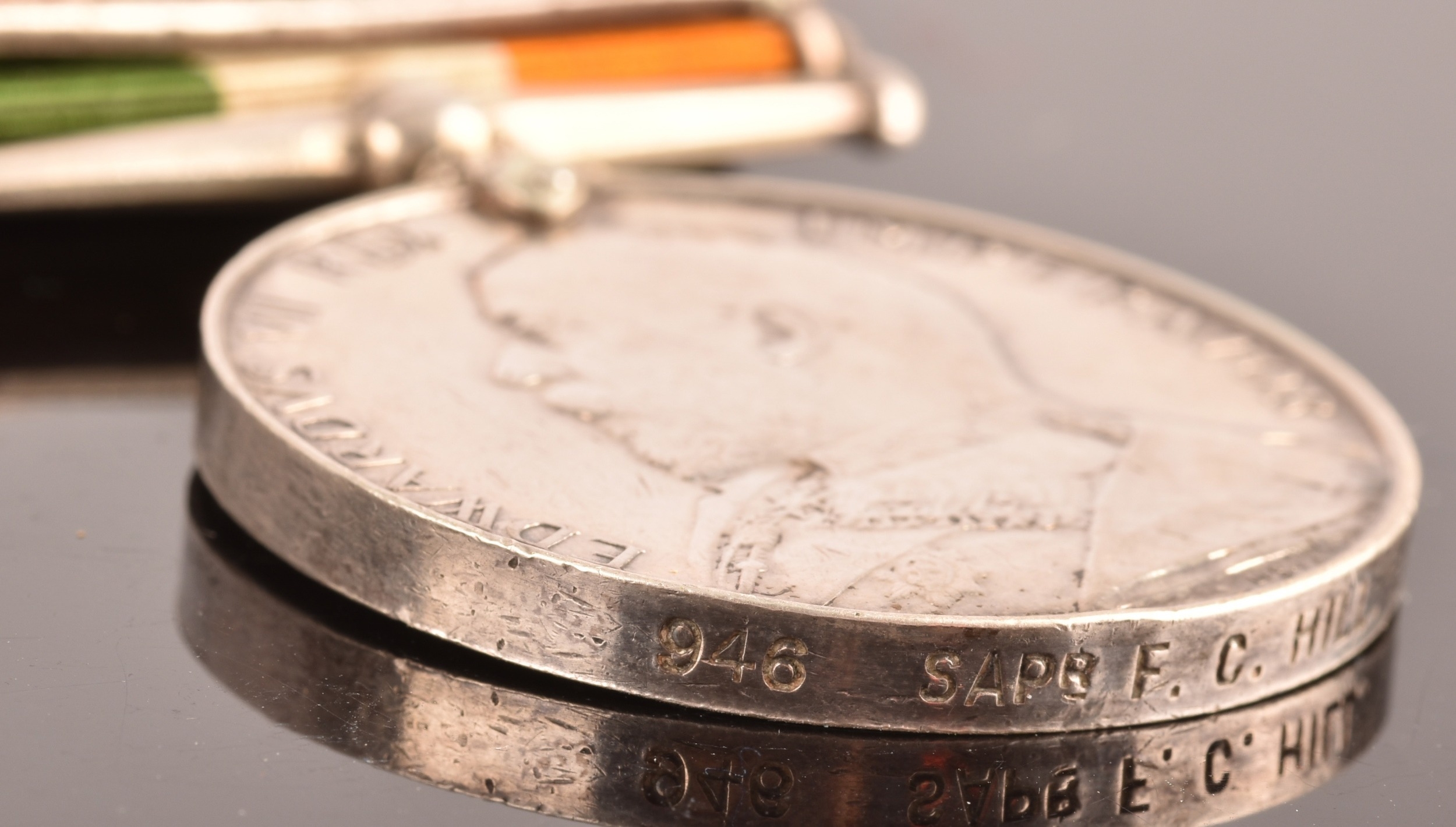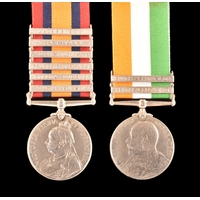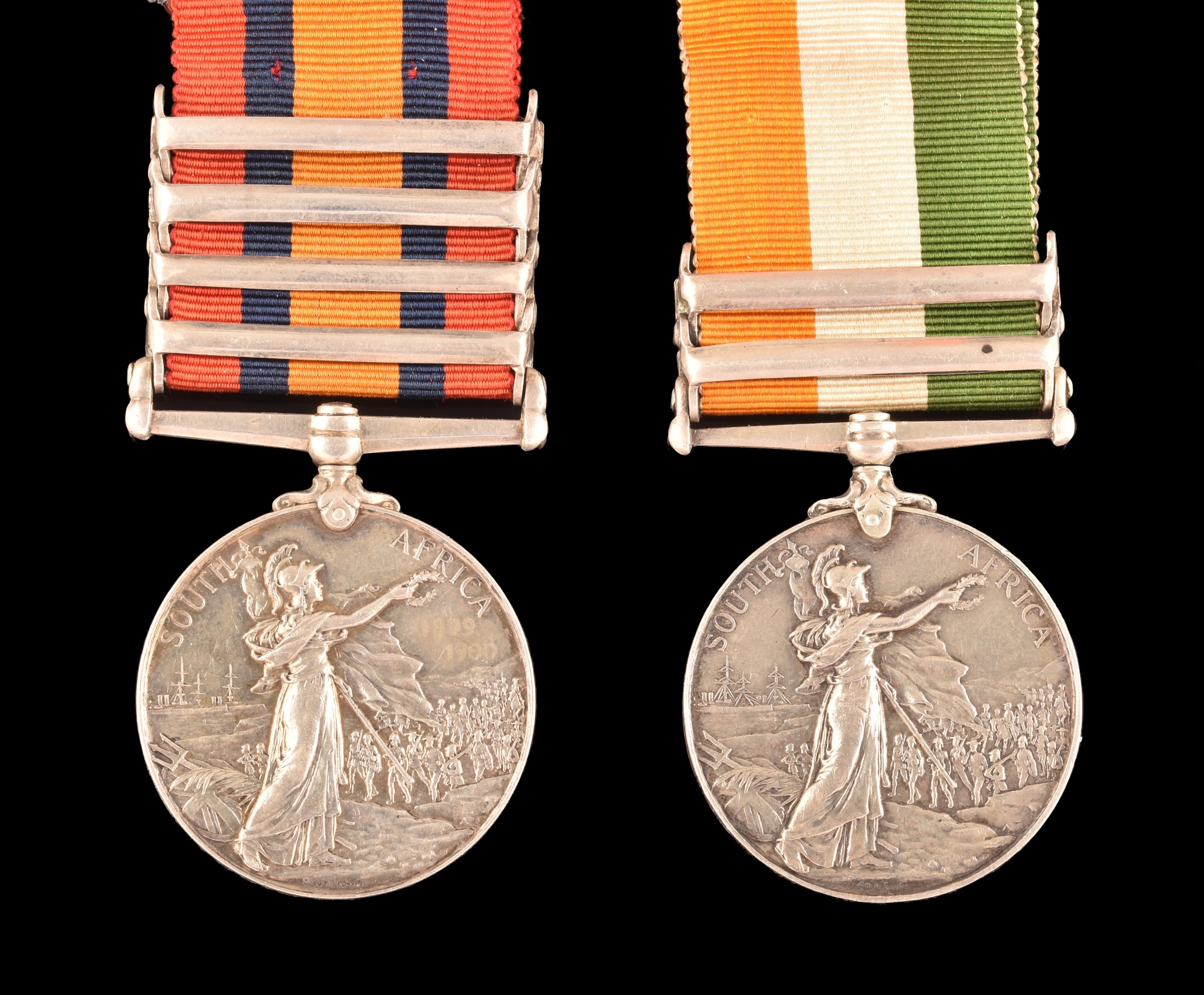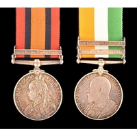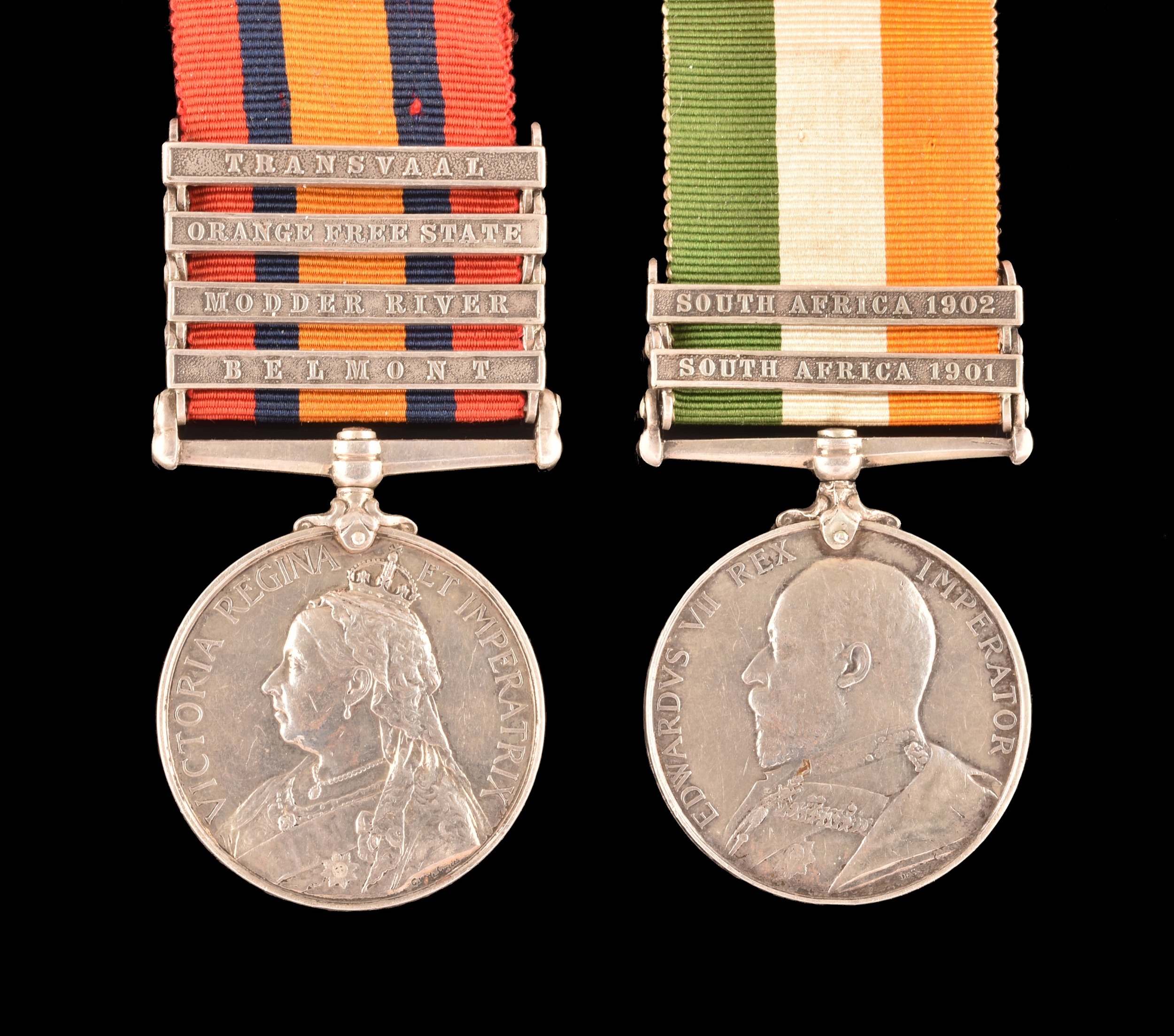A Boer War medal pair awarded to: 946 Sapper F. C. Hill, Royal Engineers. Comprising: a QSA Queen’s South Africa medal with 4 clasps Belmont, Modder River, Orange Free State, Transvaal (946 Sapr. F. C. Hill, R.E.); and a KSA King's South Africa medal with 2 clasps South Africa 1901 and South Africa 1902 (946 Sapr. F. C. Hill, R.E.).