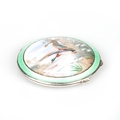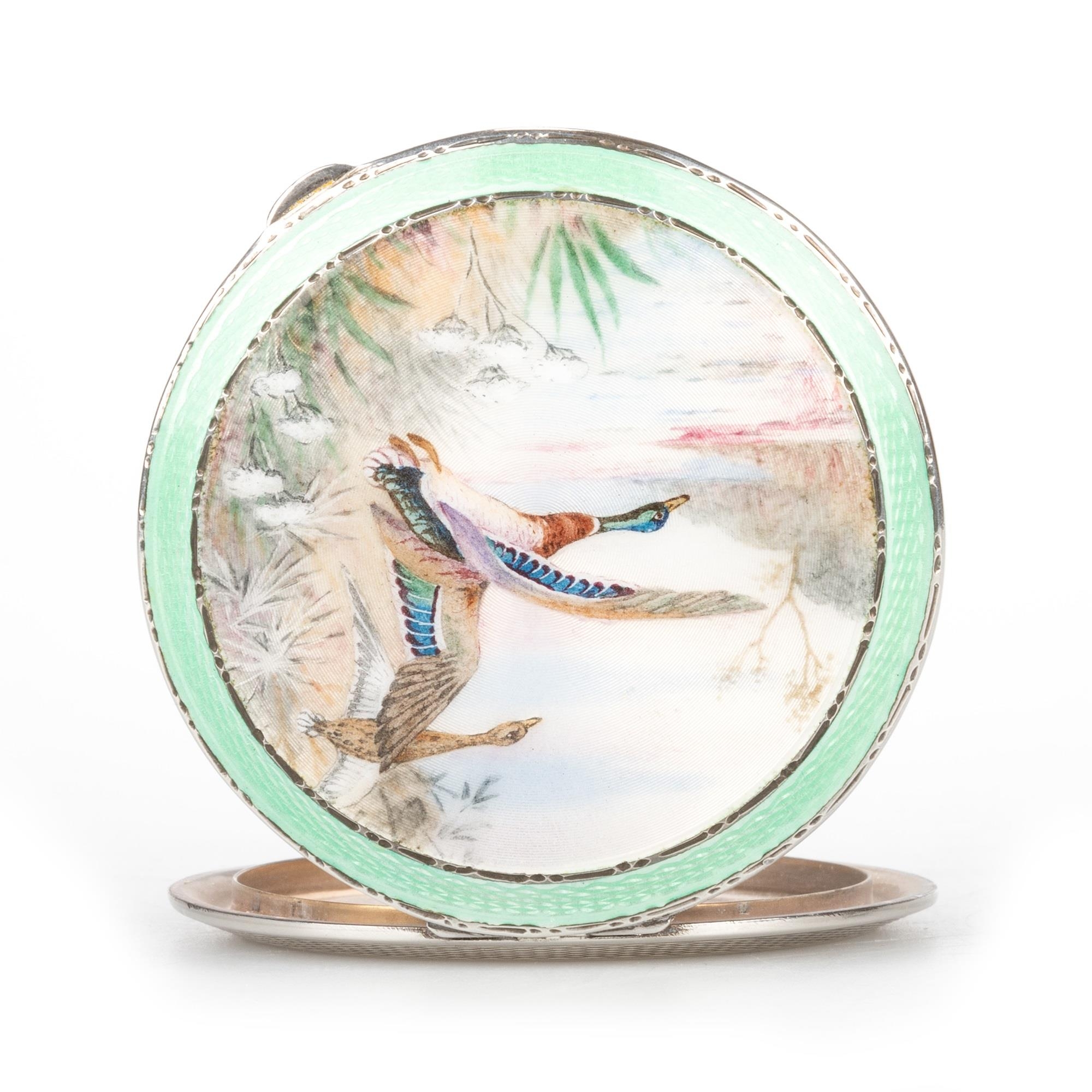 by Henry Clifford Davis, Birmingham 1937, painted depicting mallards in flight in a river landscape, to a guilloche enamel ground and within a green guilloche enamel and rope border. 7cm diameter, 2.6 troy ounces