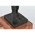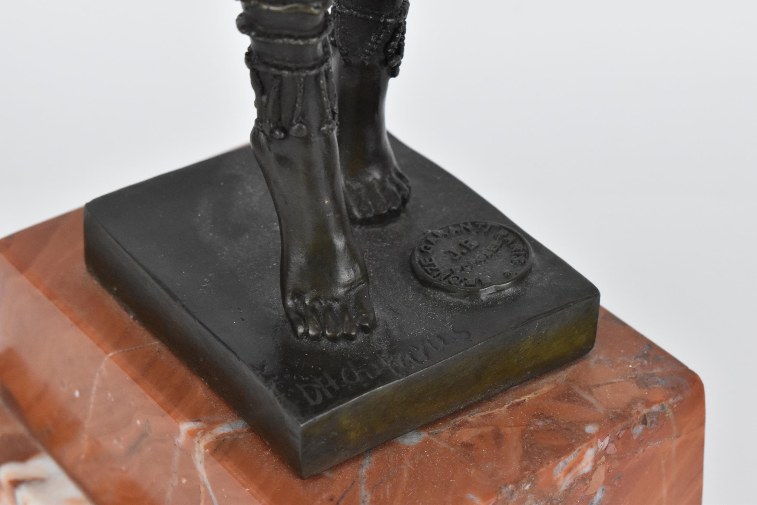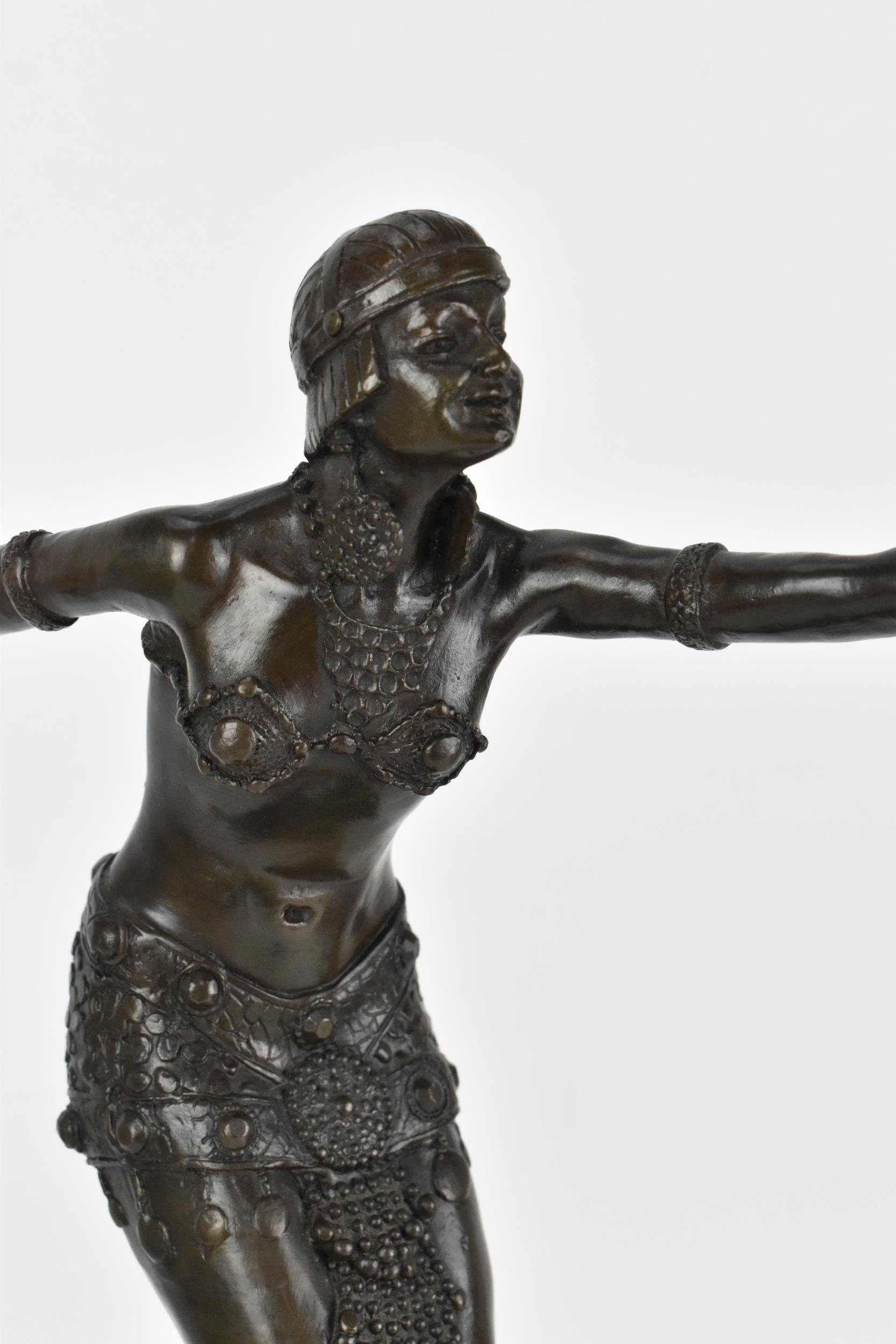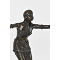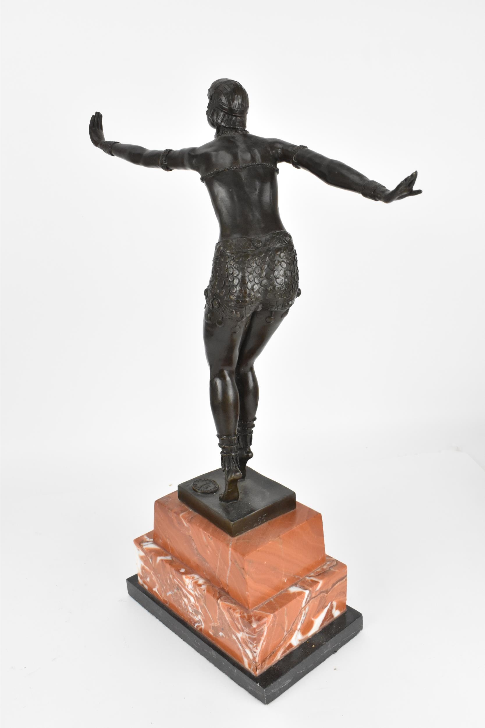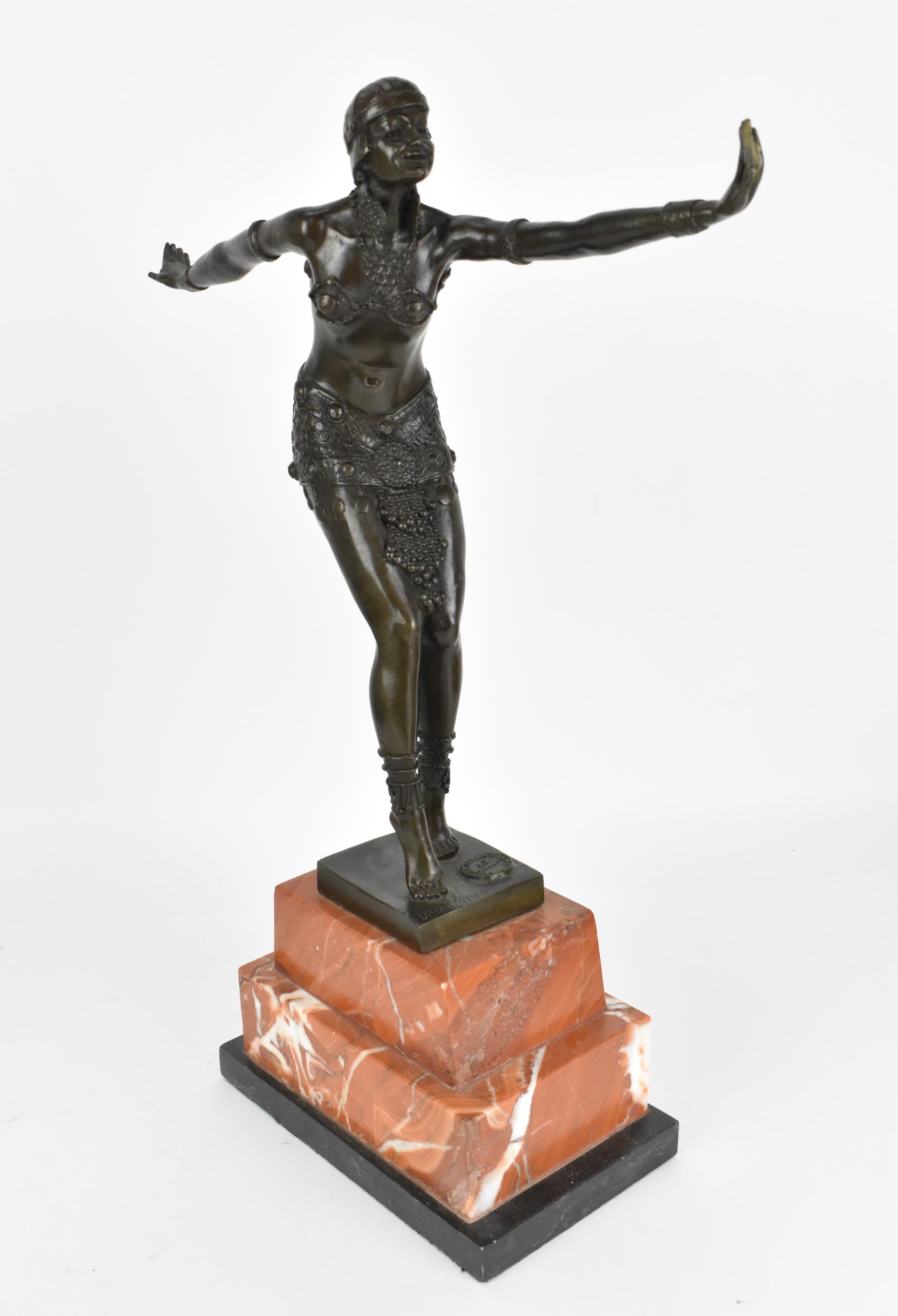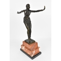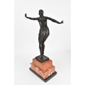 After Demétre H. Chiparus (1886-1947), an Art Deco style bronze dancer on stand, with each arm stretched out in opposite directions, signed to the base, raised on a graduated stepped rouge marble stand with bronze platform, 48 cm high