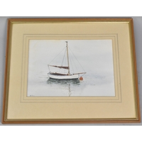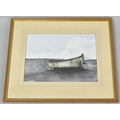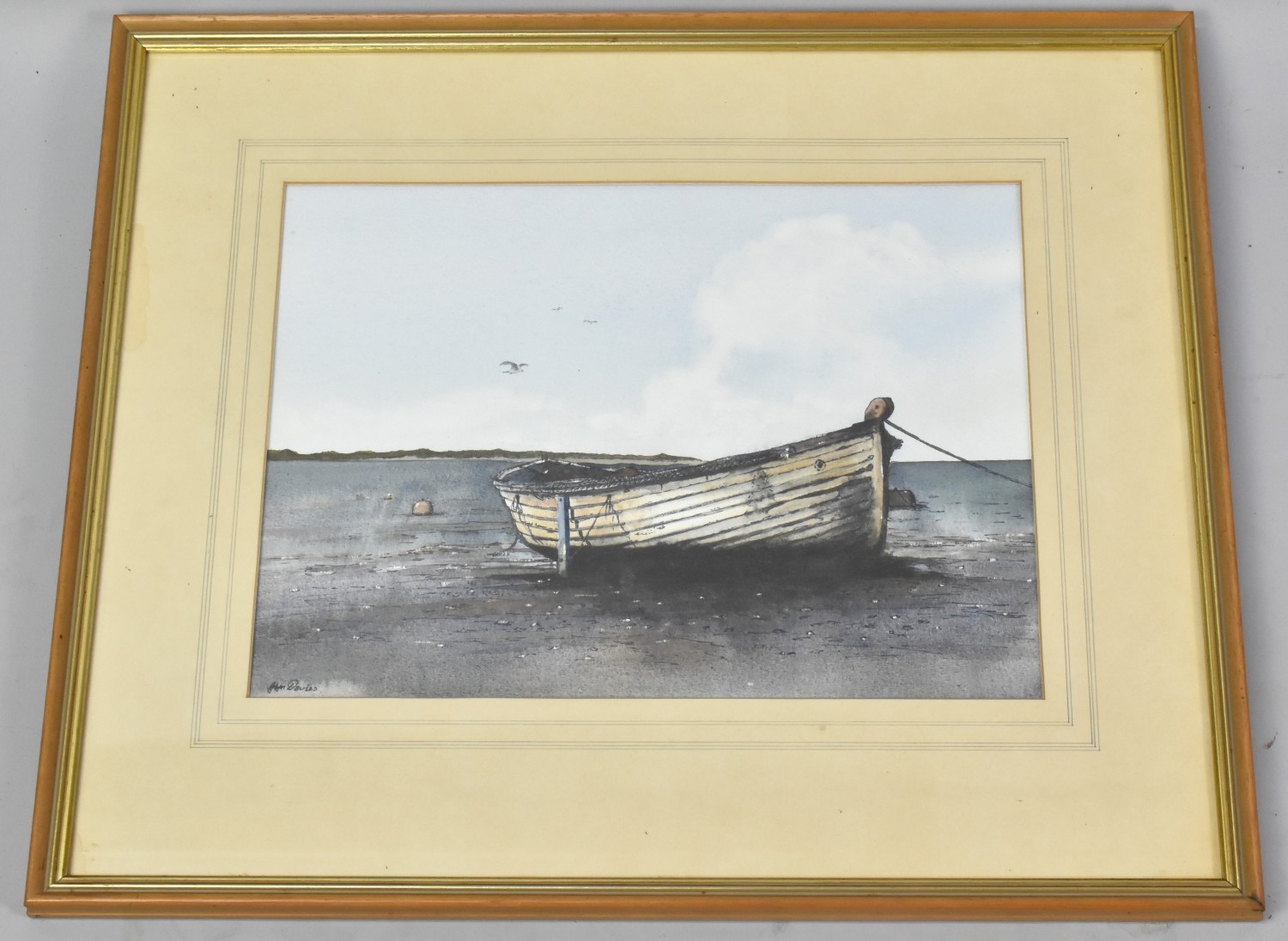 A Framed Watercolour Depicting Lobster Boat Beached at Low Tide by Glyn Davies, 35x26cms