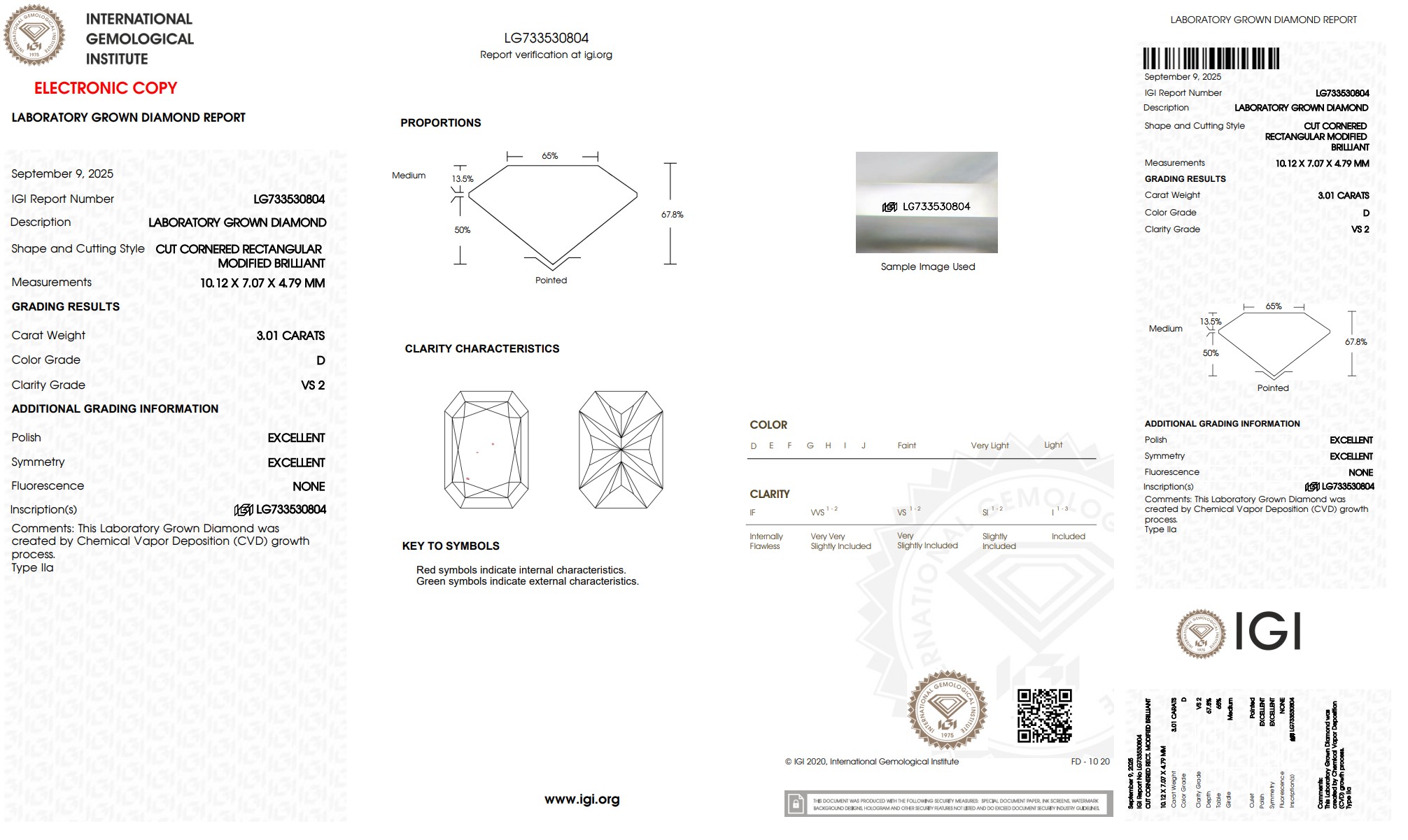 A 3.01ct Radiant Cut Lab-Grown Diamond. Colour D, clarity VS2. IGI certified. Cert no: LG733530804. Measurements: 10.12X7.07X4.79 mm.