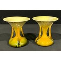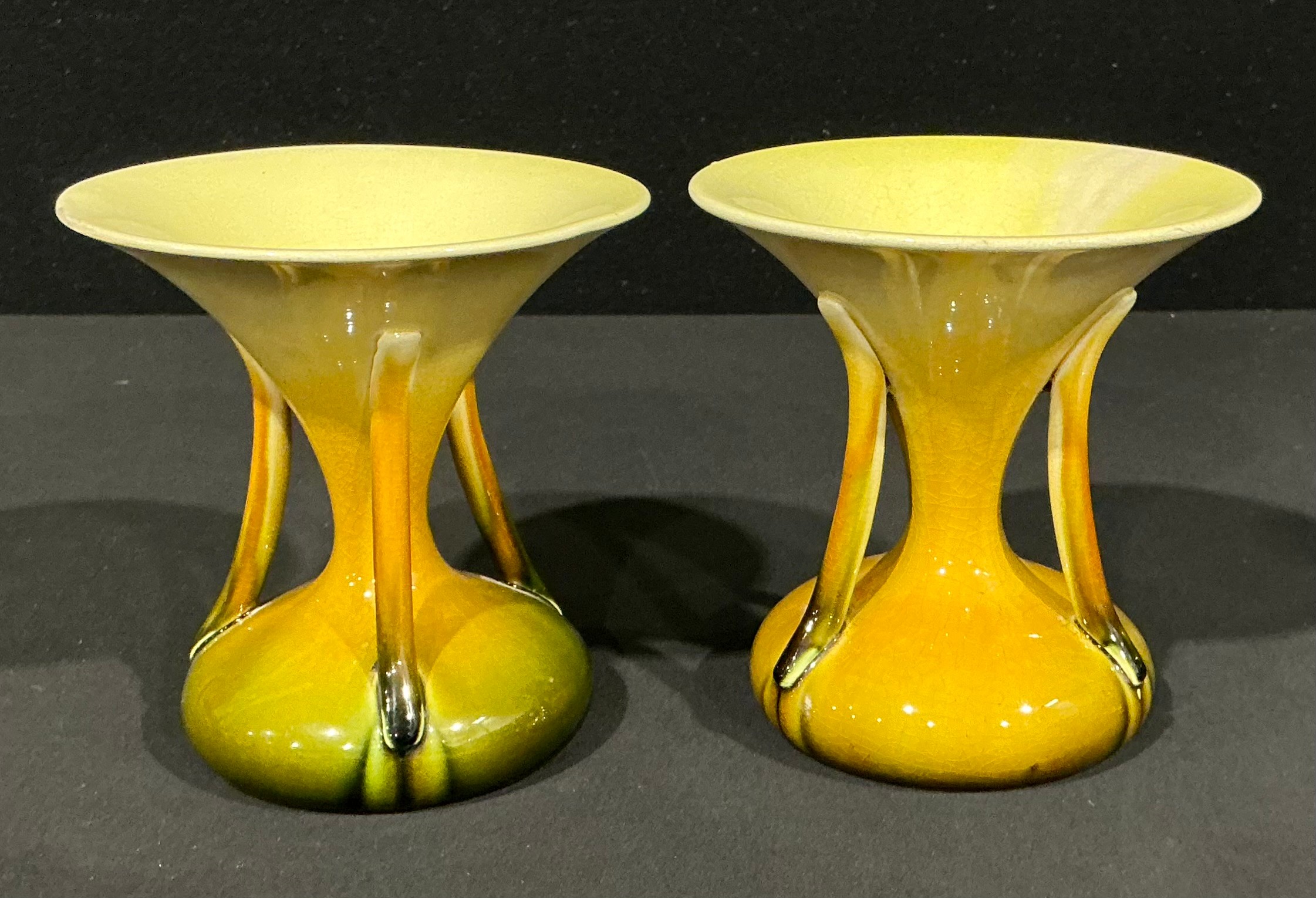 A pair of Bretby Pottery hourglass shaped vases, each with three sinuous supports, glazed in ombre shades of gloss yellow and green, in the manner of Christopher Dresser, 15cm, impressed sunbursts marks, c.1890