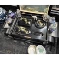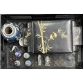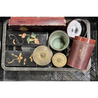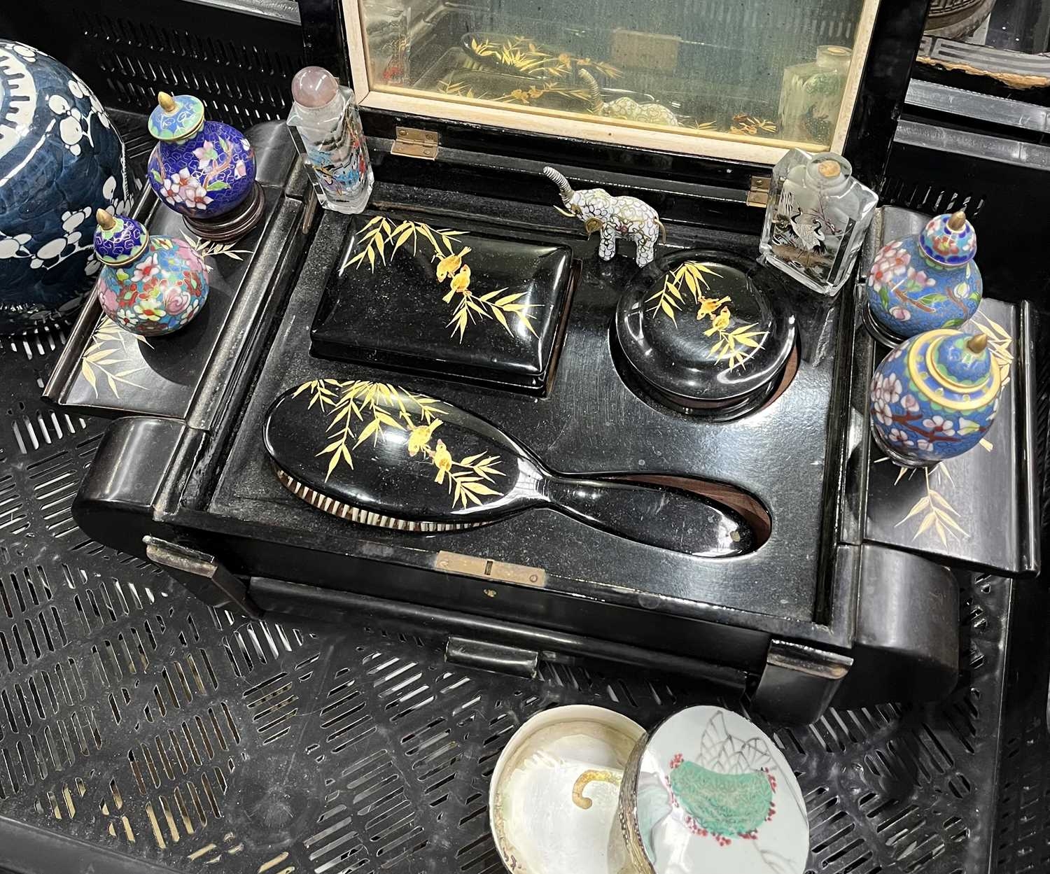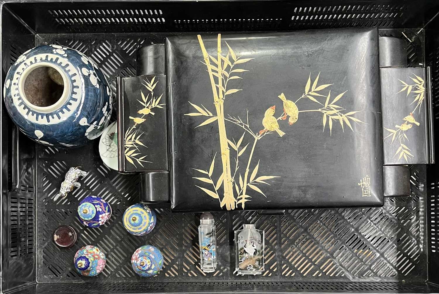 Two Chinese reverse-painted glass snuff bottles, four miniature cloisonne vases with lids and stands, a ginger jar with a cherry blossom pattern, an enamelled porcelain plaque, mounted in white metal, a box and a lacquered dressing table box with fittings, signed (1 tray)