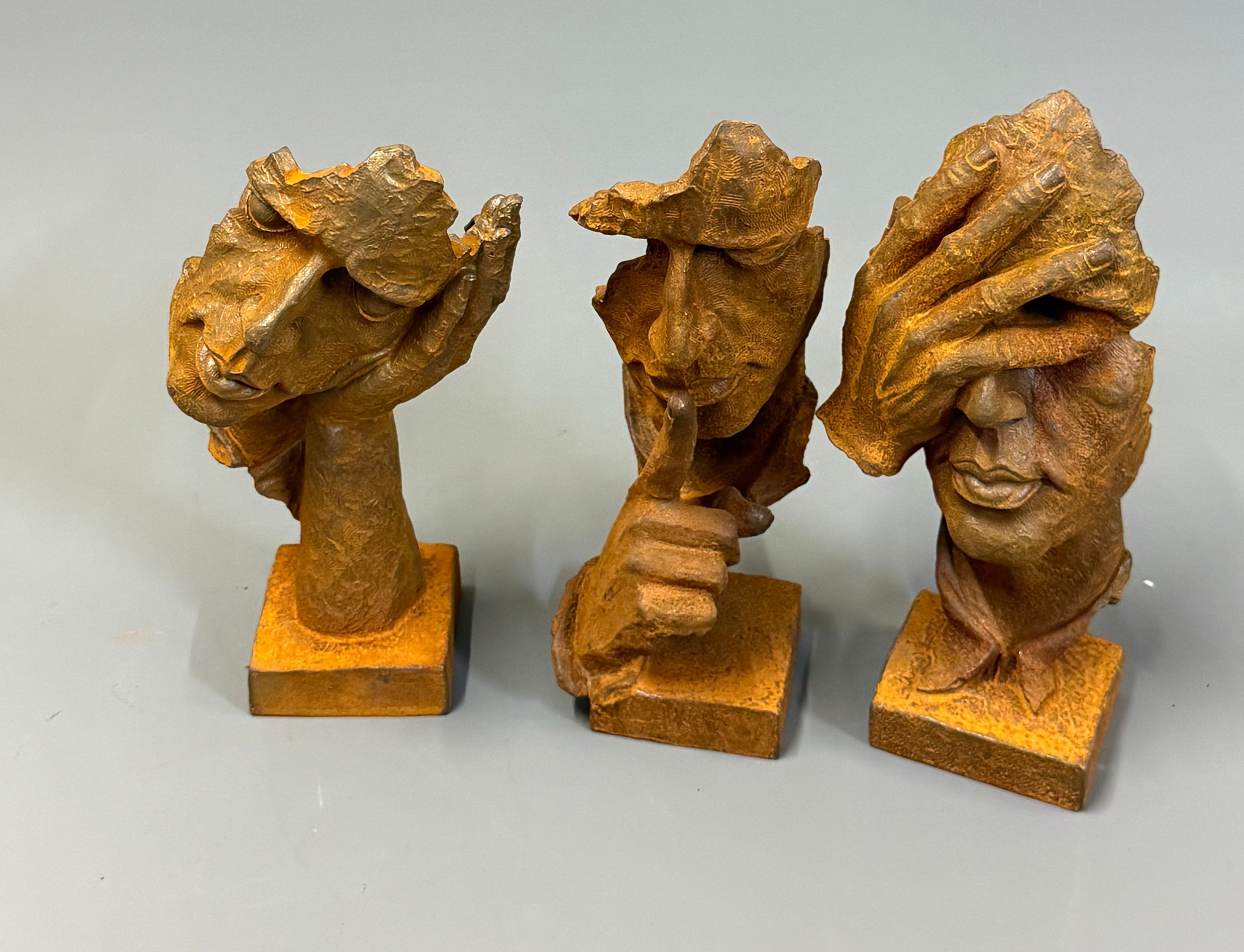Three Cast Iron Garden Figures In The Form Of Hear No Speak No See No Evil. 30 cms High (3)