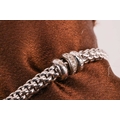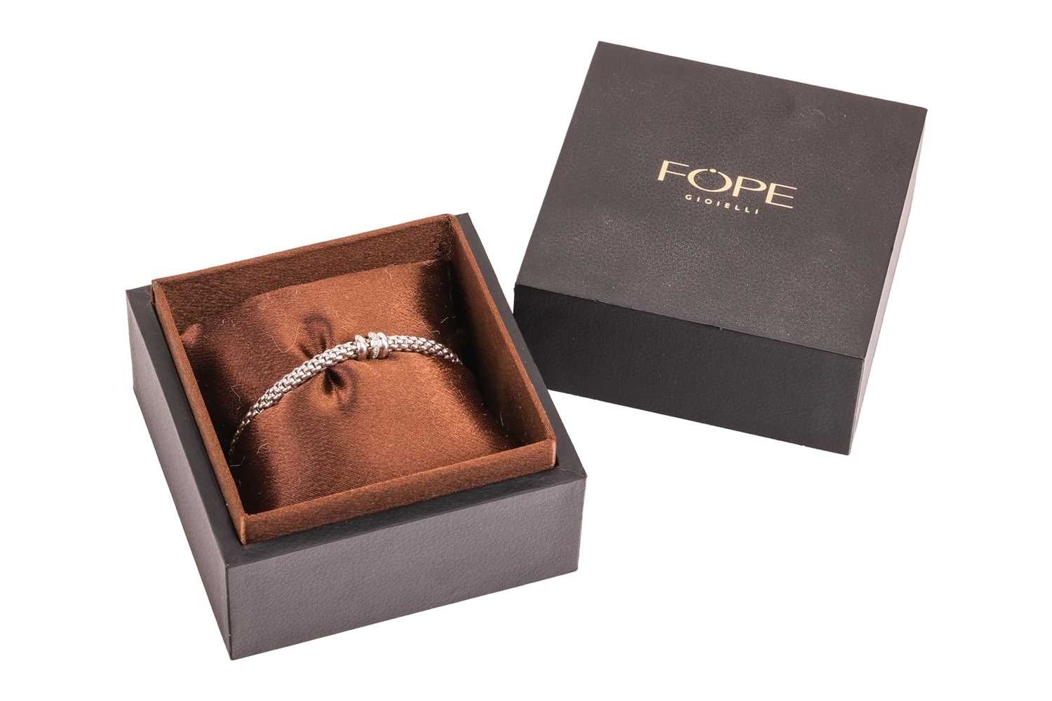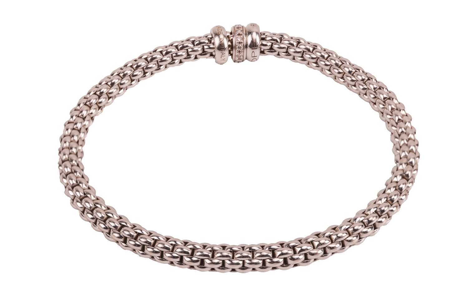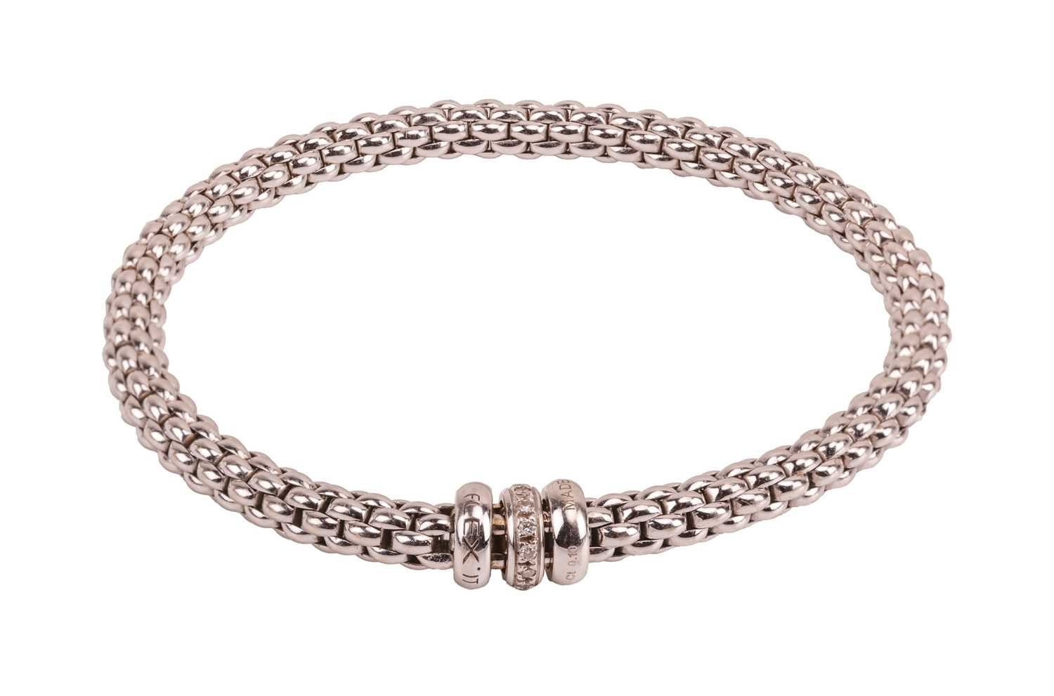 Fope - a diamond-set Solo Flex'It bracelet, the flexible tubular links centred with three roundels, one set with a row of diamond accents, white metal signed and stamped with Italian assay marks for 18ct, inner circumference 17.0cm, cased, 16.9 grams.