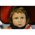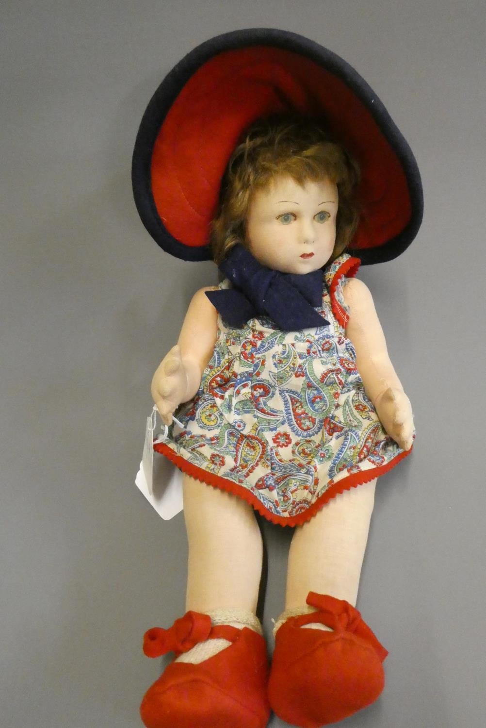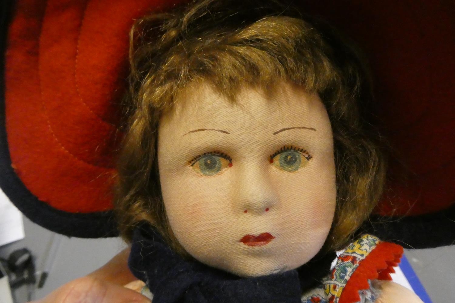 A Lenci girl doll, with fabric construction, painted features, original dress, felt shoes and hat, 15 3/4" long
