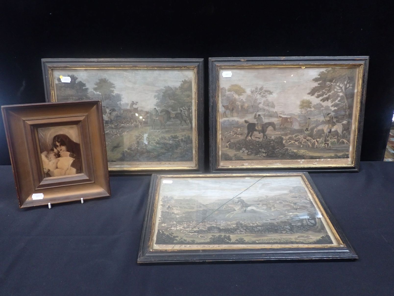 THREE 18TH CENTURY EBONISED PICTURE FRAMES containing (damaged) sporting prints 26.5 x 36.5cm aperture, and a small Edwardian crystoleum