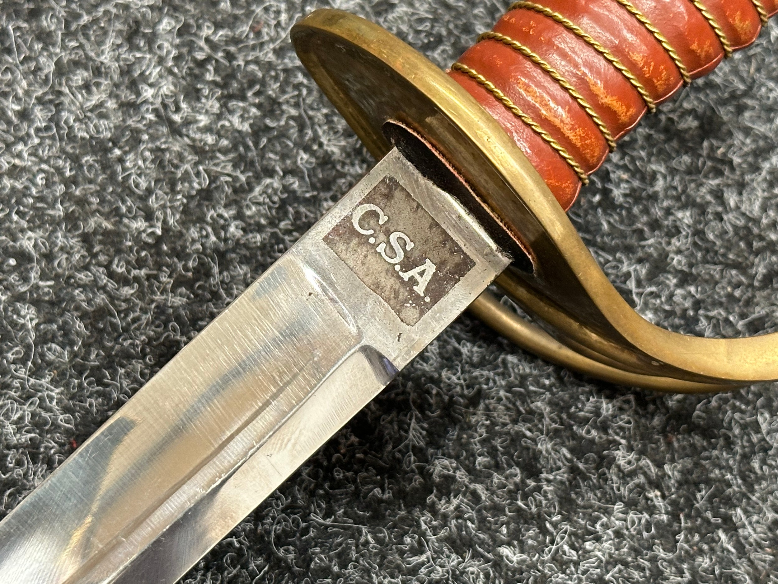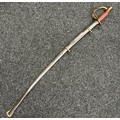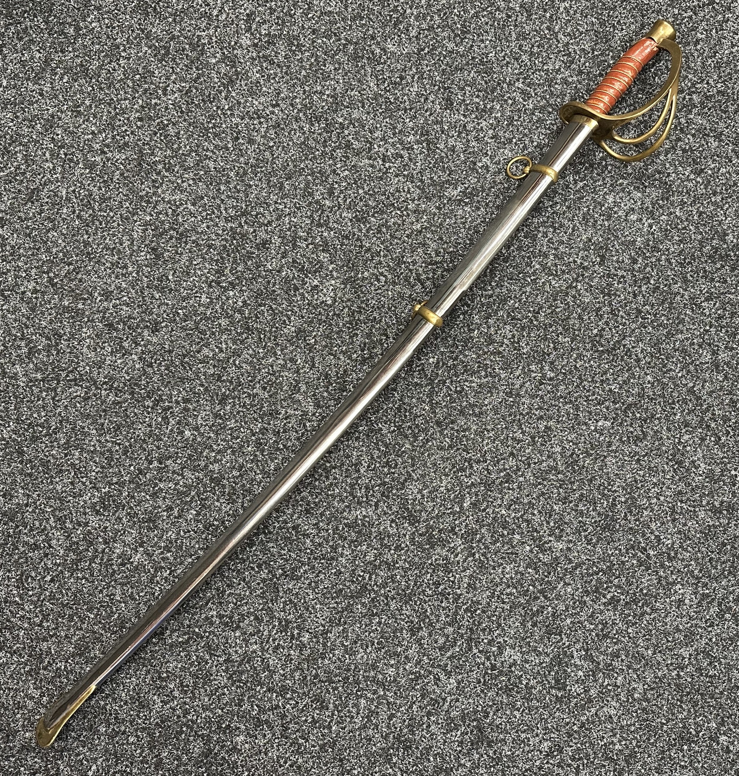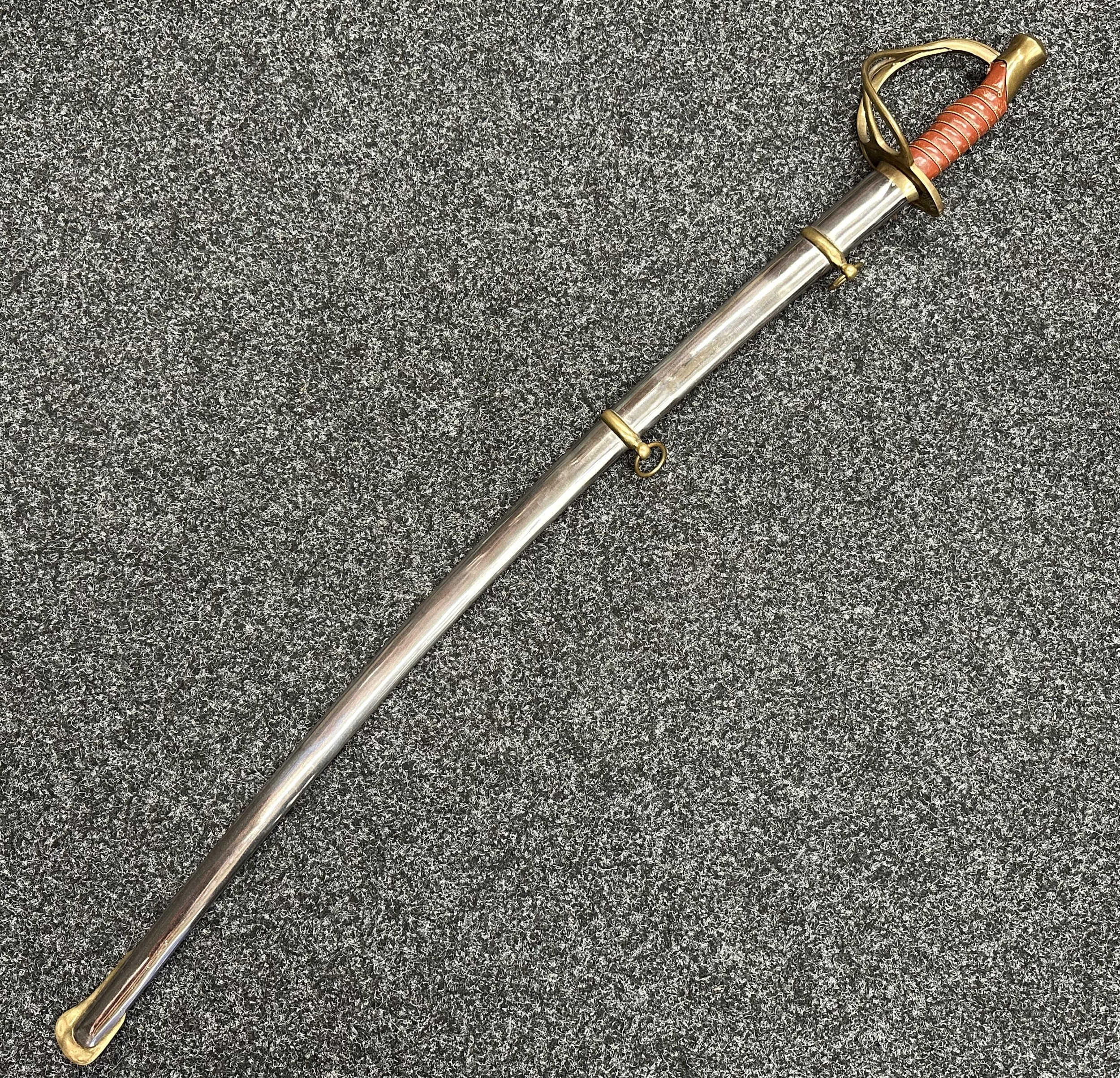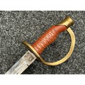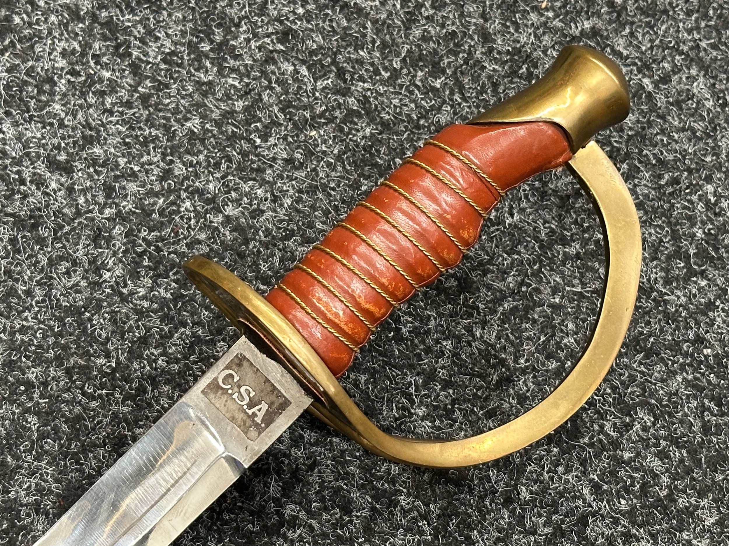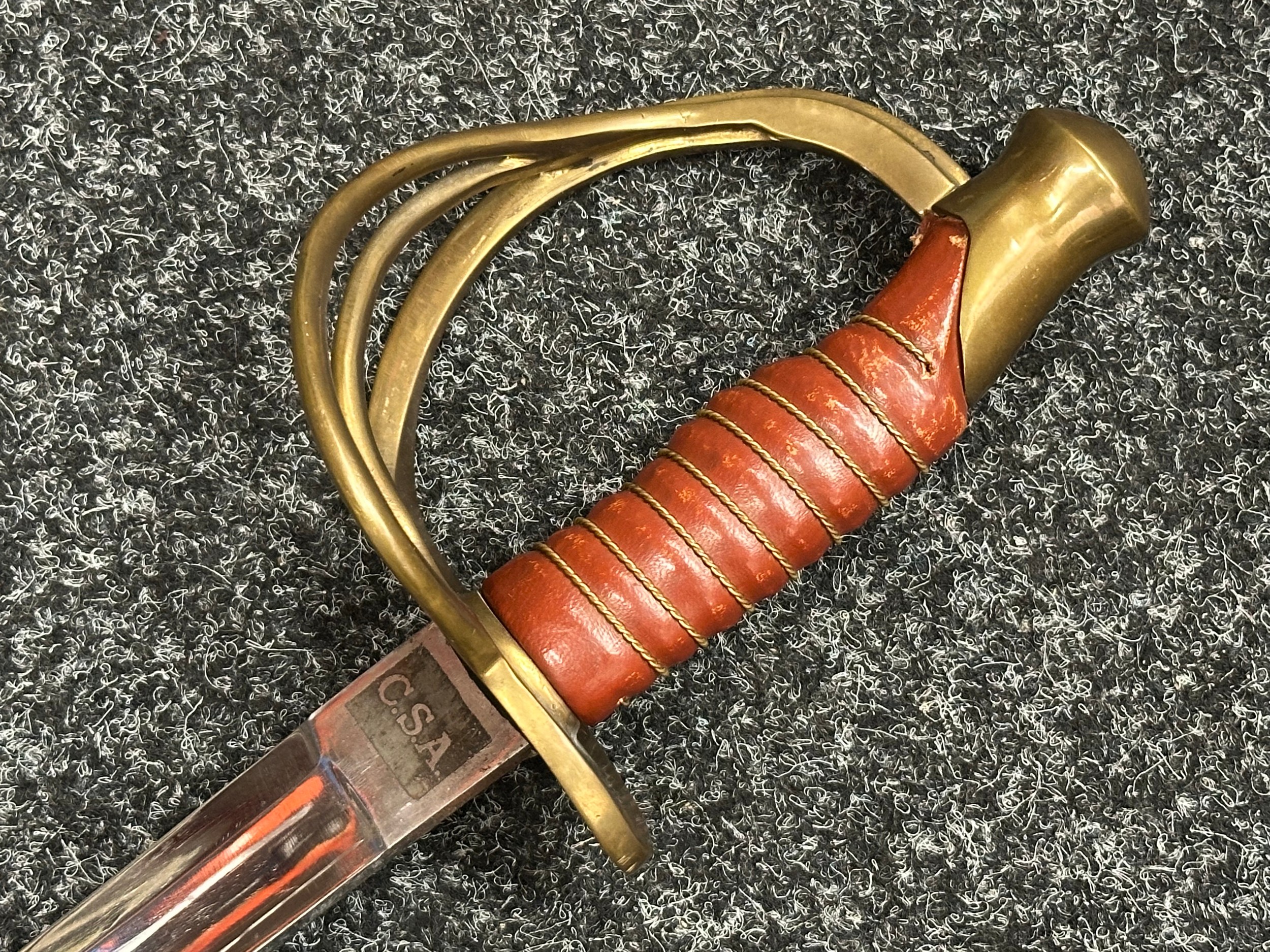 Reproduction American Civil War CSA Sabre with curved fullered single edged blade 900mm in length with etched panels "CSA". Wire bound leather grip and brass guard. Overall length 106cm. Complete with scabbard with twin brass suspension rings and brass drag.