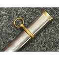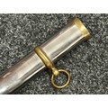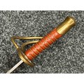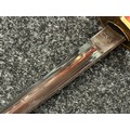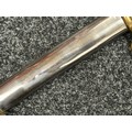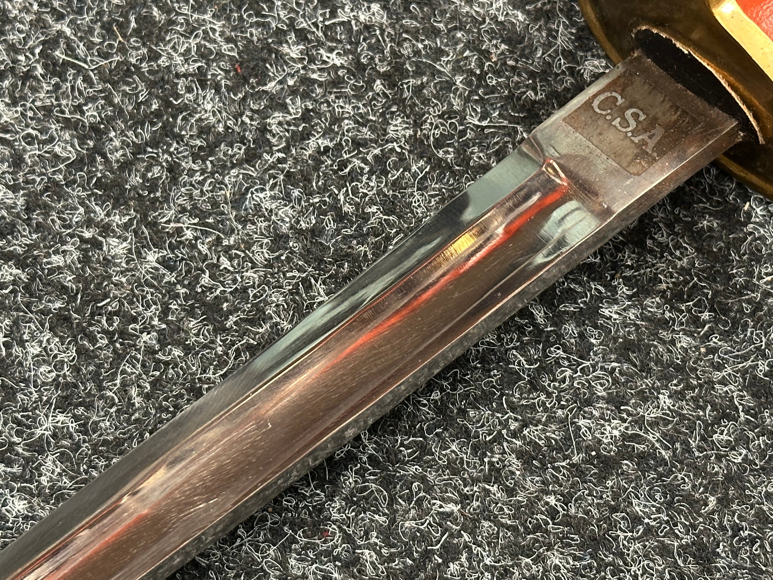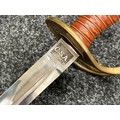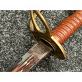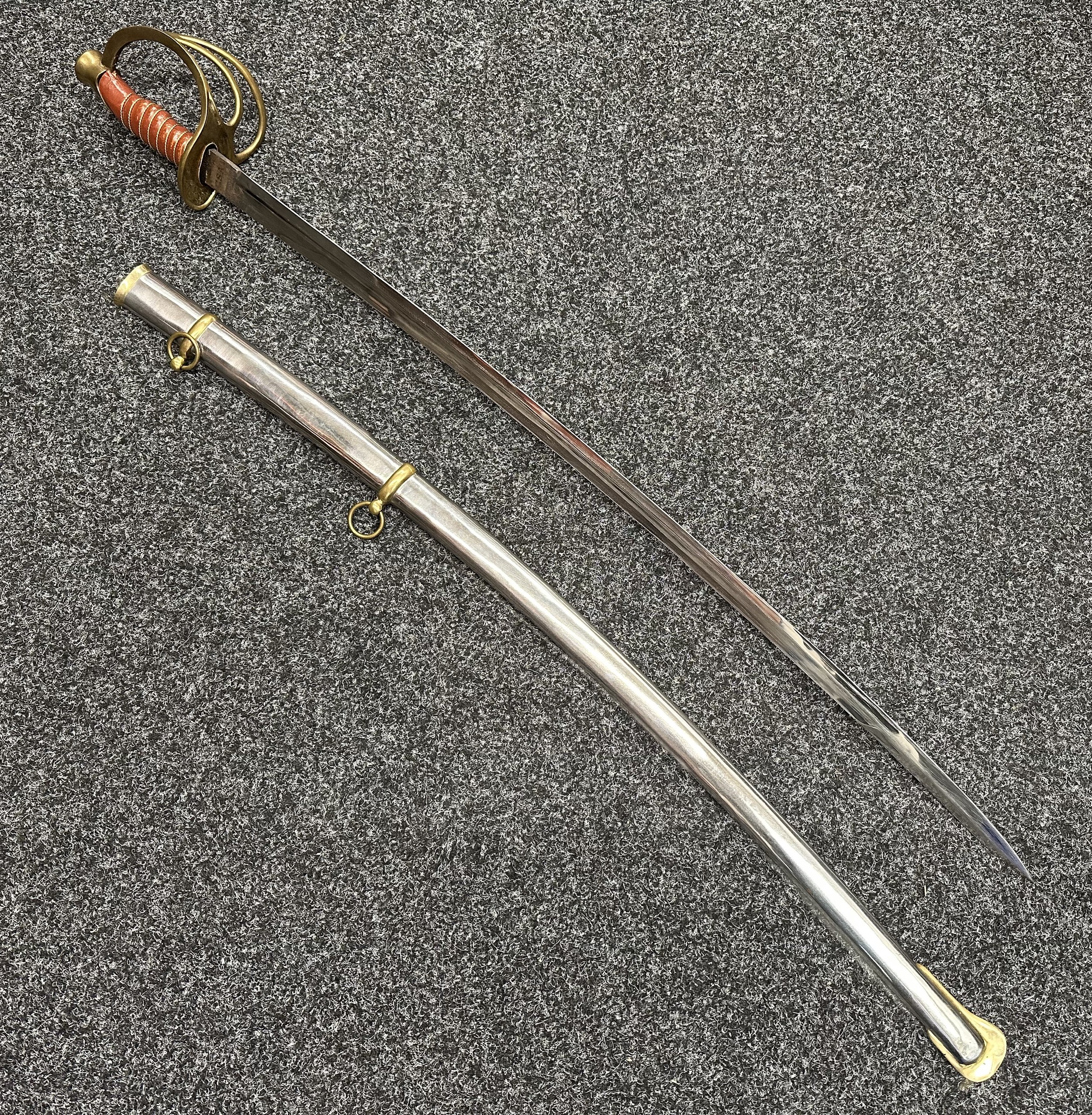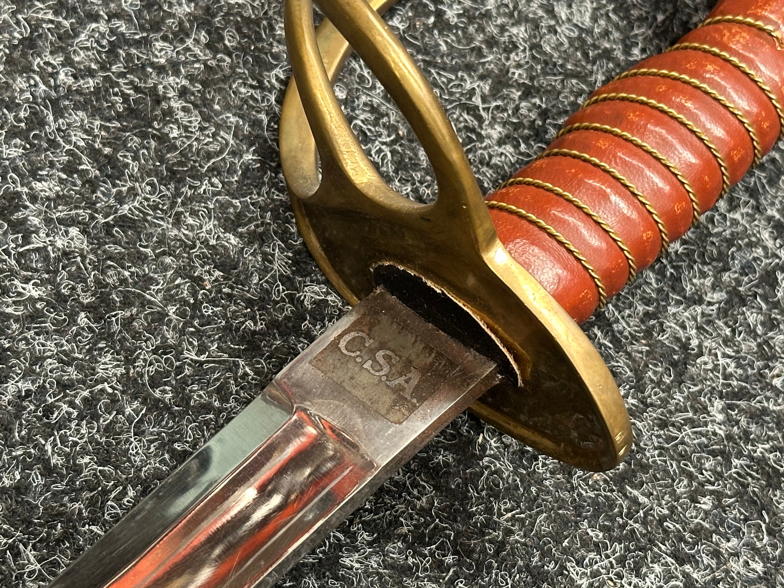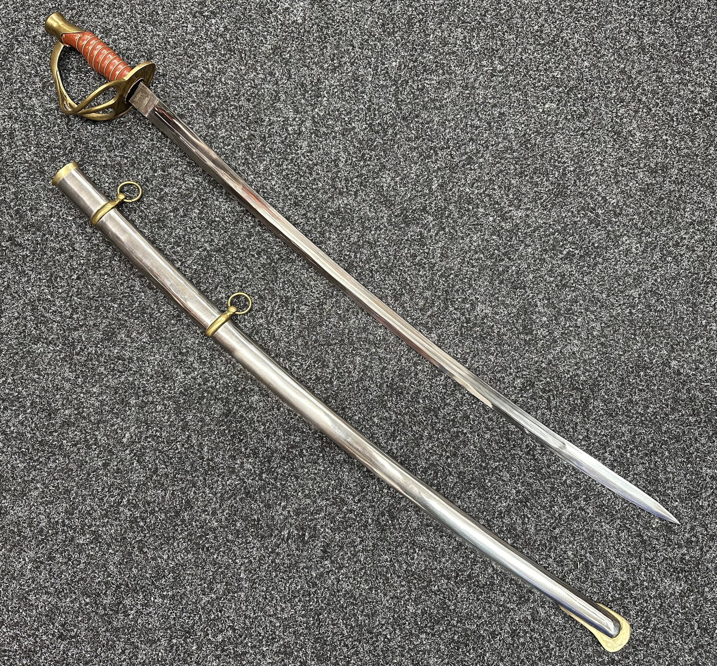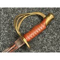 Reproduction American Civil War CSA Sabre with curved fullered single edged blade 900mm in length with etched panels "CSA". Wire bound leather grip and brass guard. Overall length 106cm. Complete with scabbard with twin brass suspension rings and brass drag.
