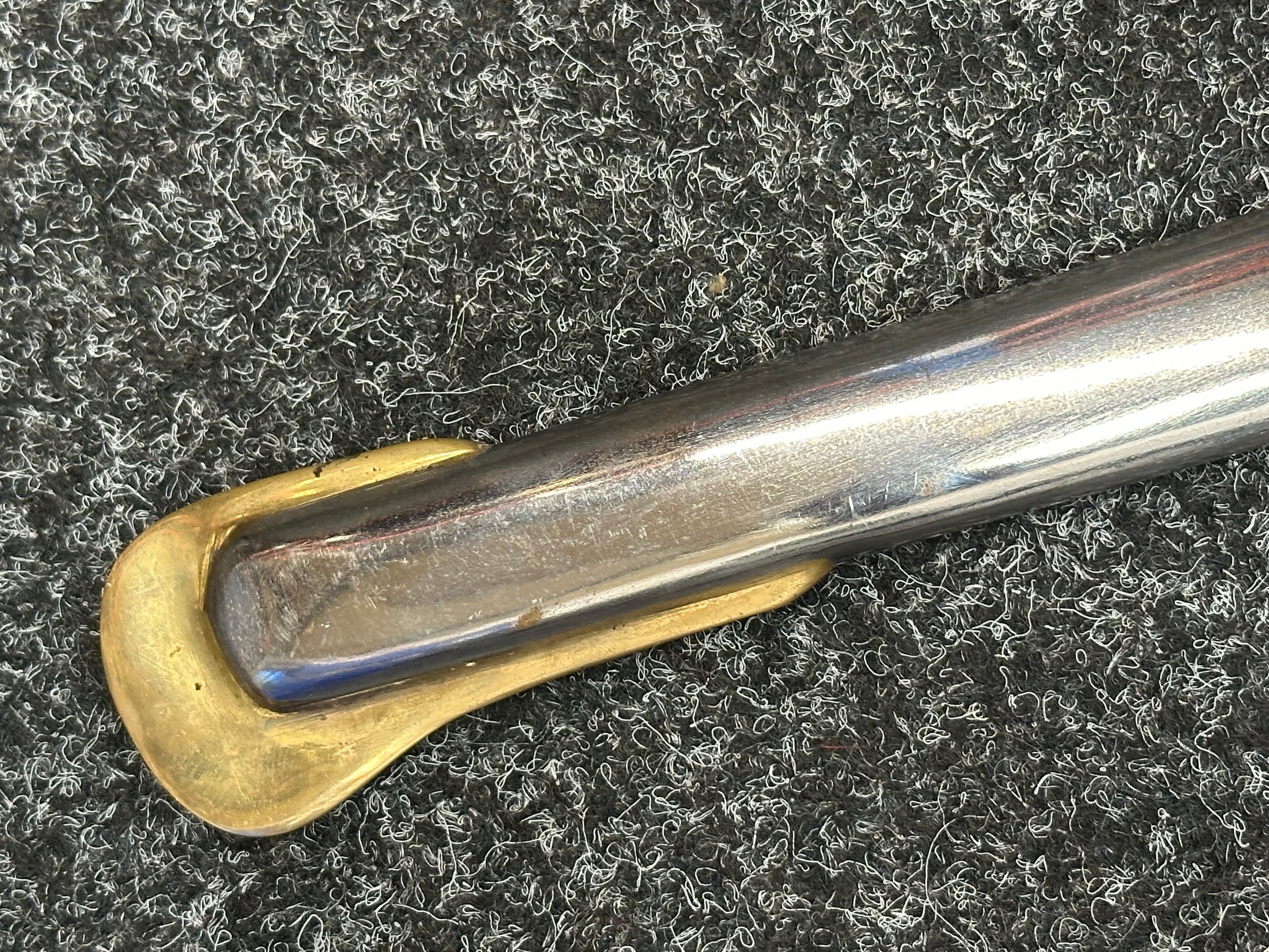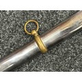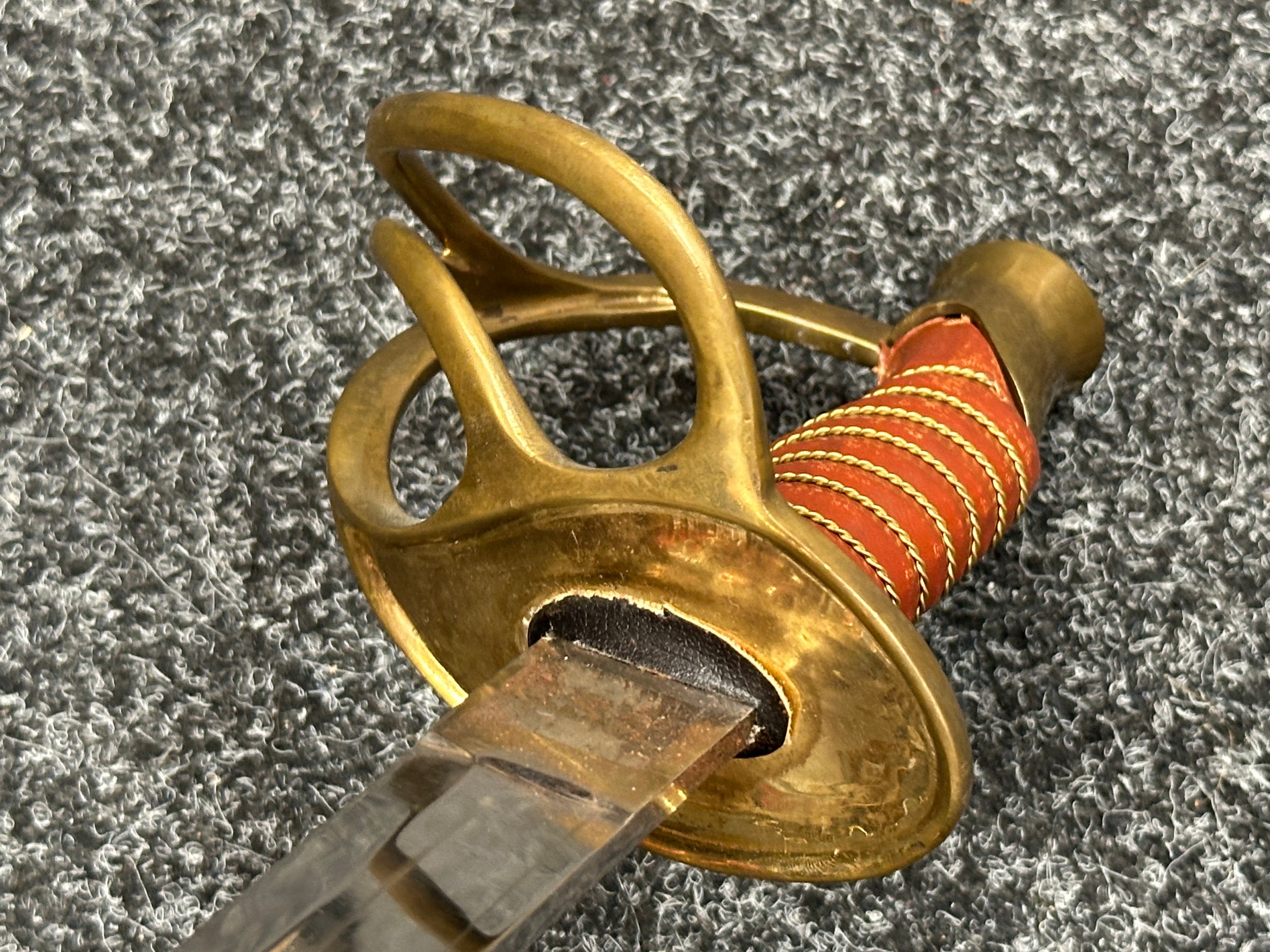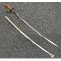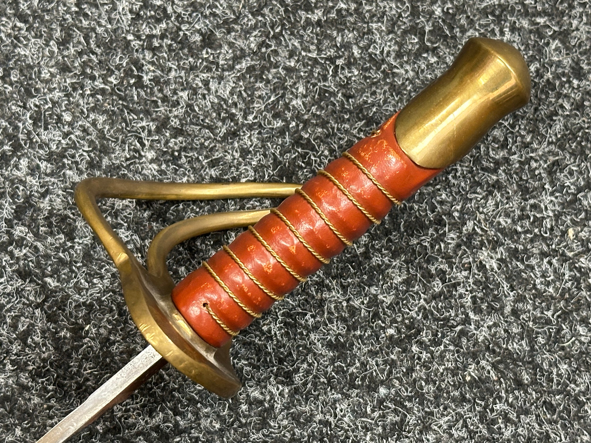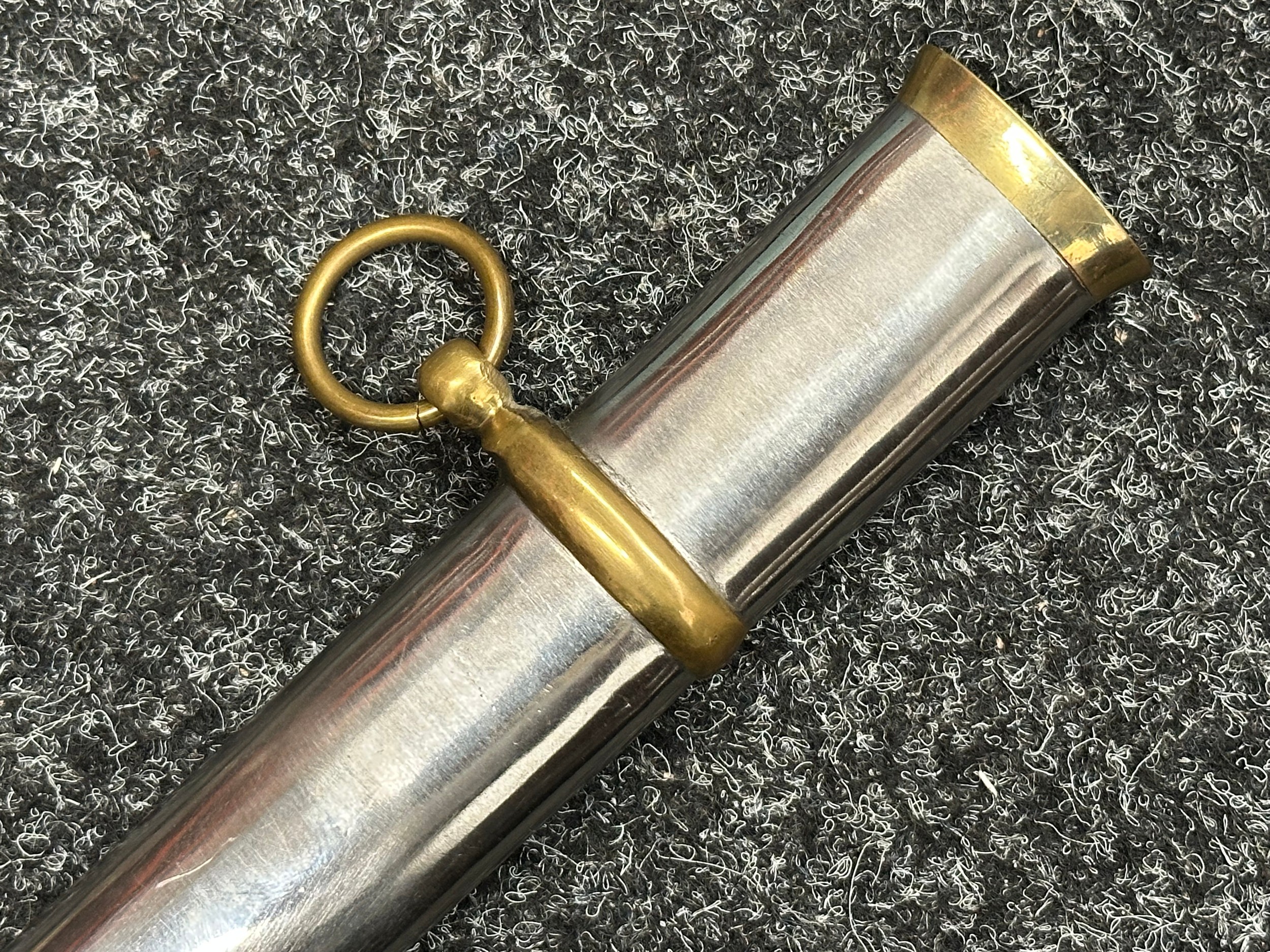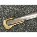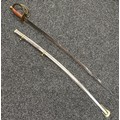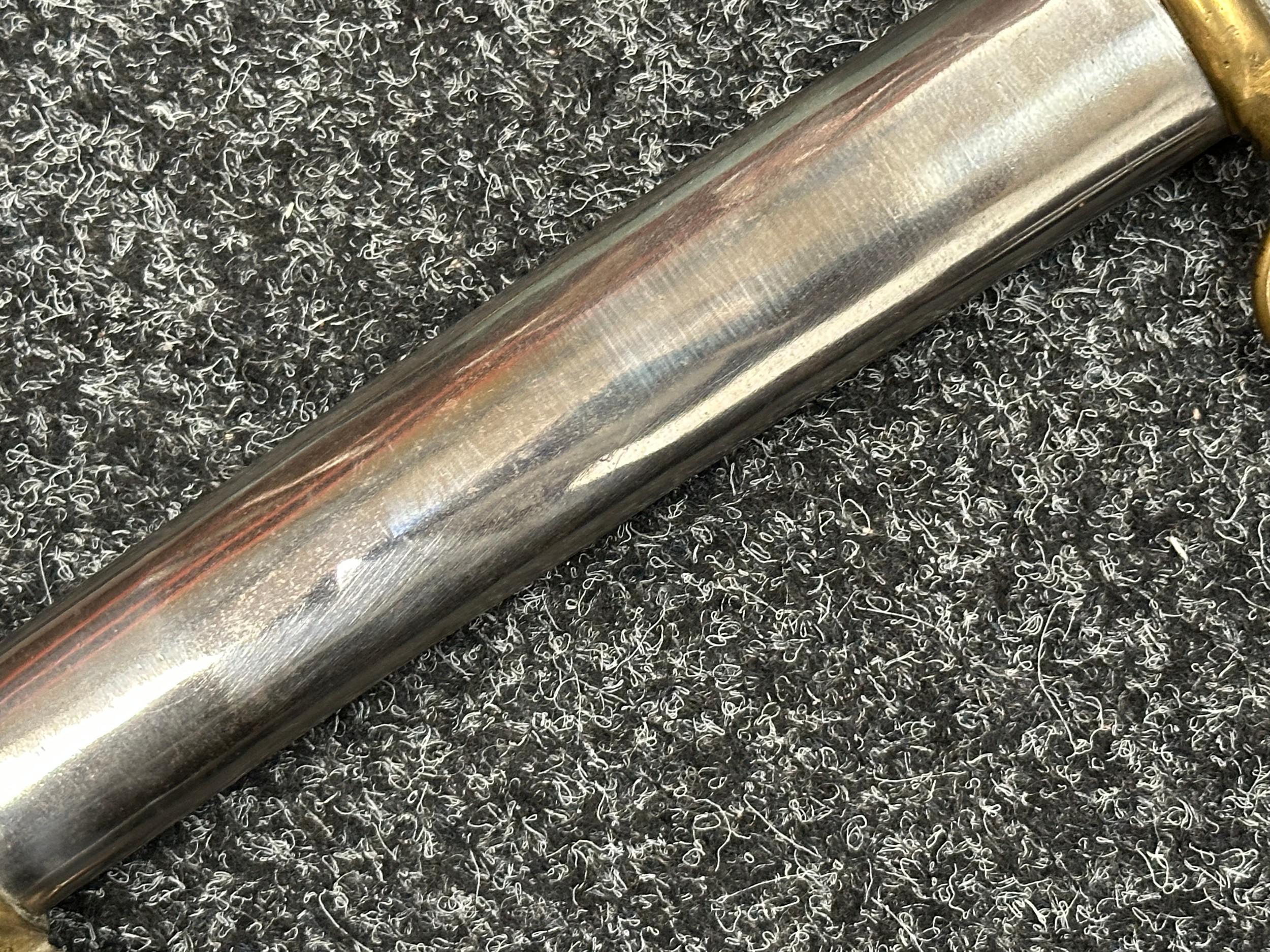 Reproduction American Civil War CSA Sabre with curved fullered single edged blade 900mm in length with etched panels "CSA". Wire bound leather grip and brass guard. Overall length 106cm. Complete with scabbard with twin brass suspension rings and brass drag.