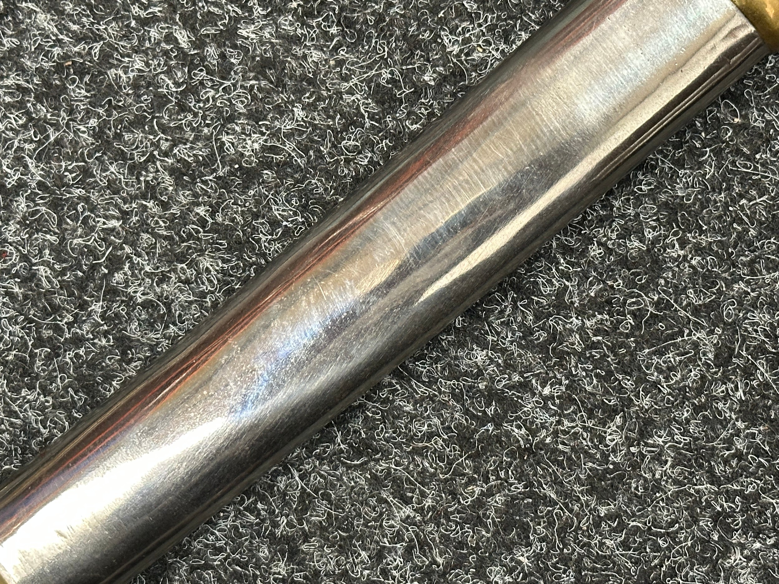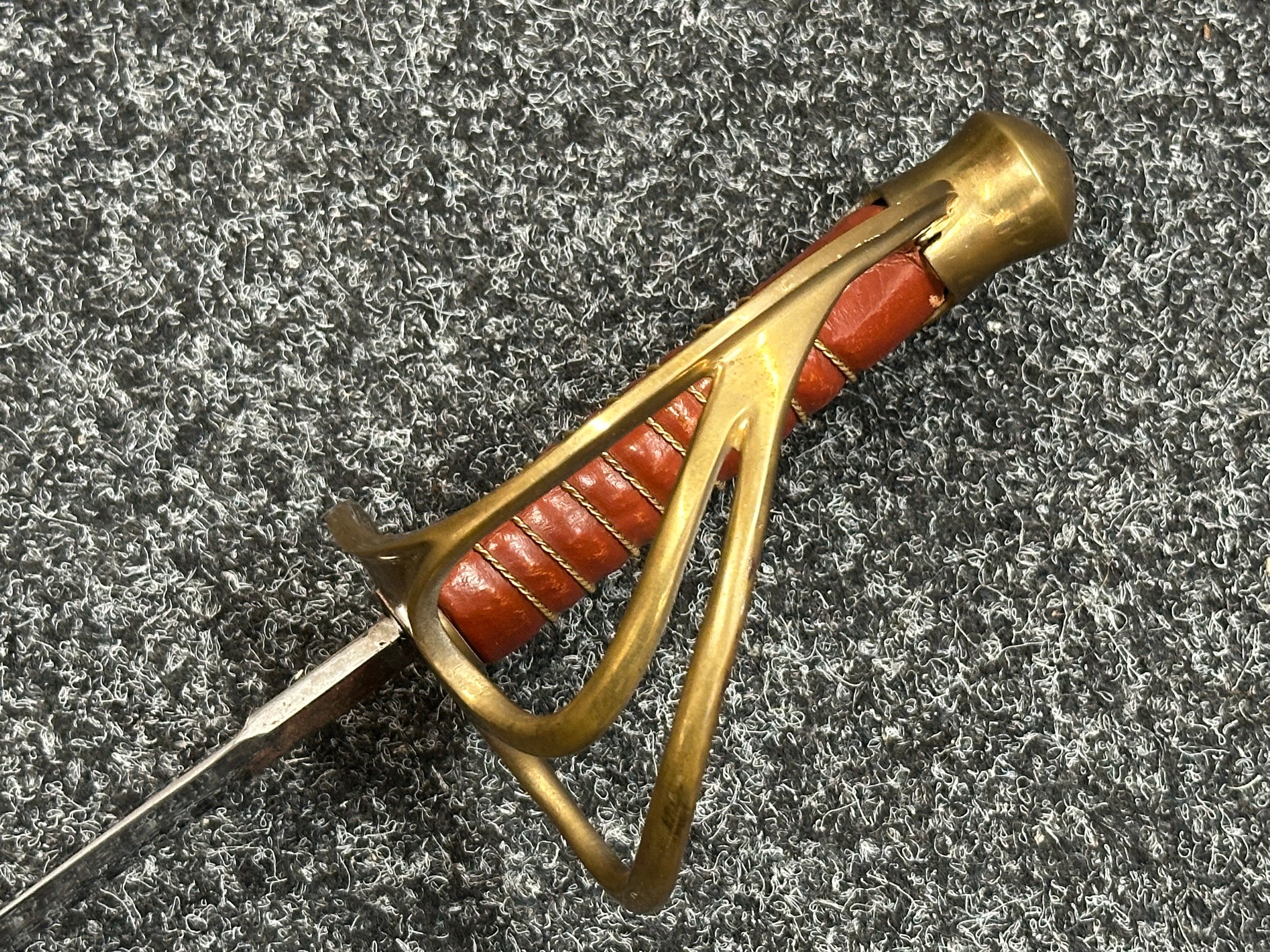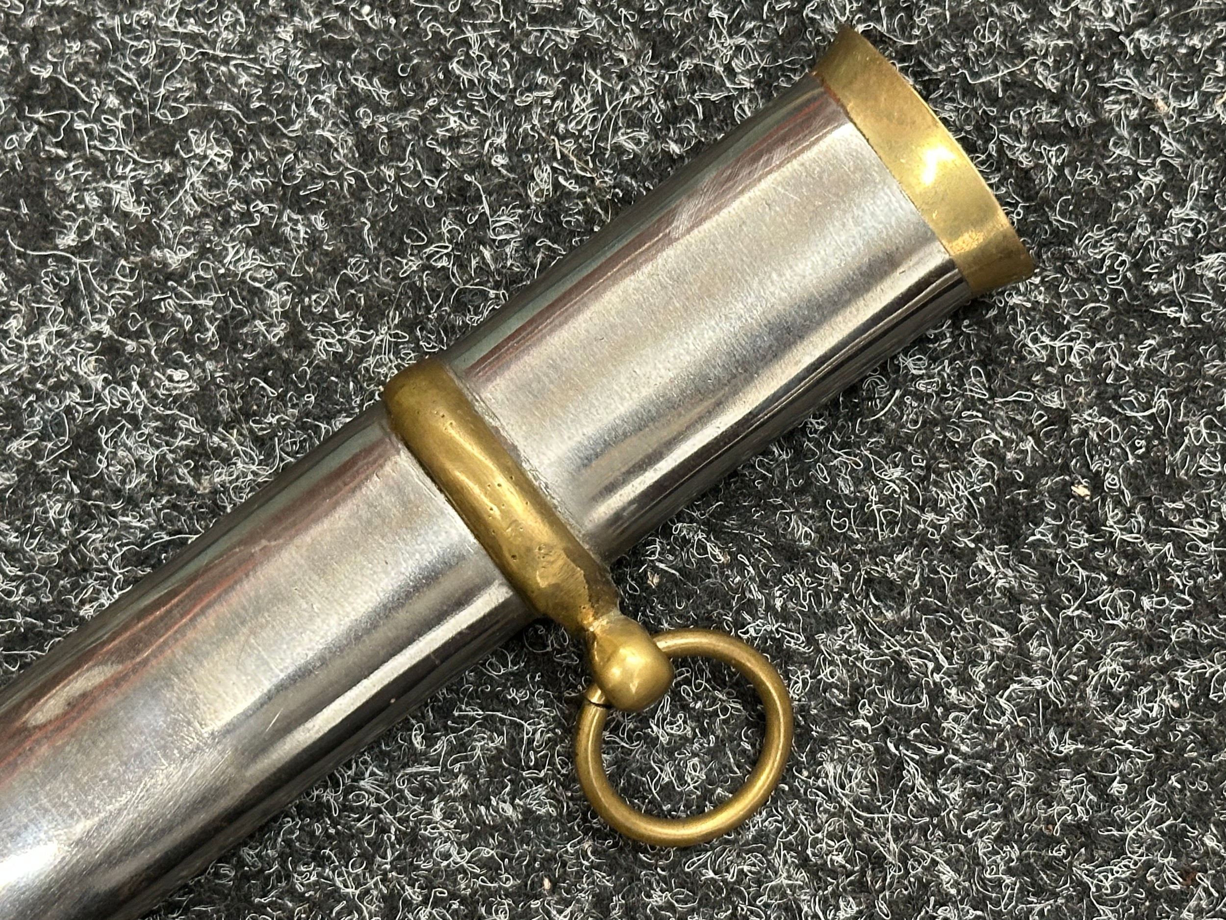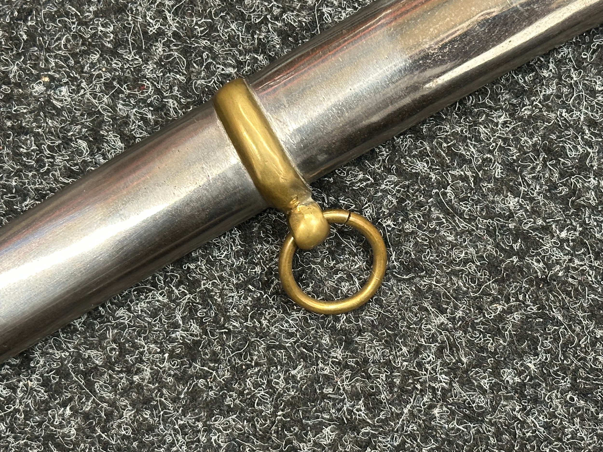 Reproduction American Civil War CSA Sabre with curved fullered single edged blade 900mm in length with etched panels "CSA". Wire bound leather grip and brass guard. Overall length 106cm. Complete with scabbard with twin brass suspension rings and brass drag.
