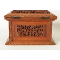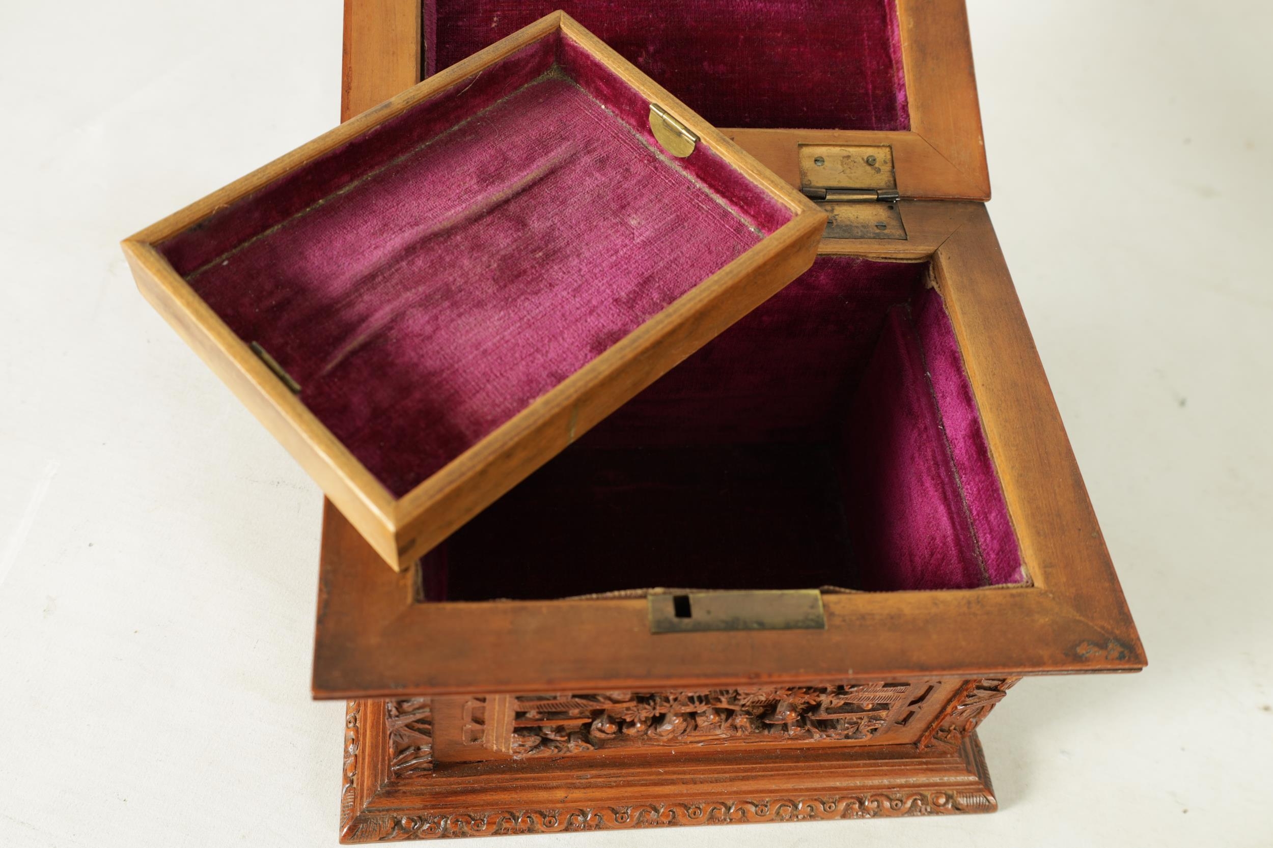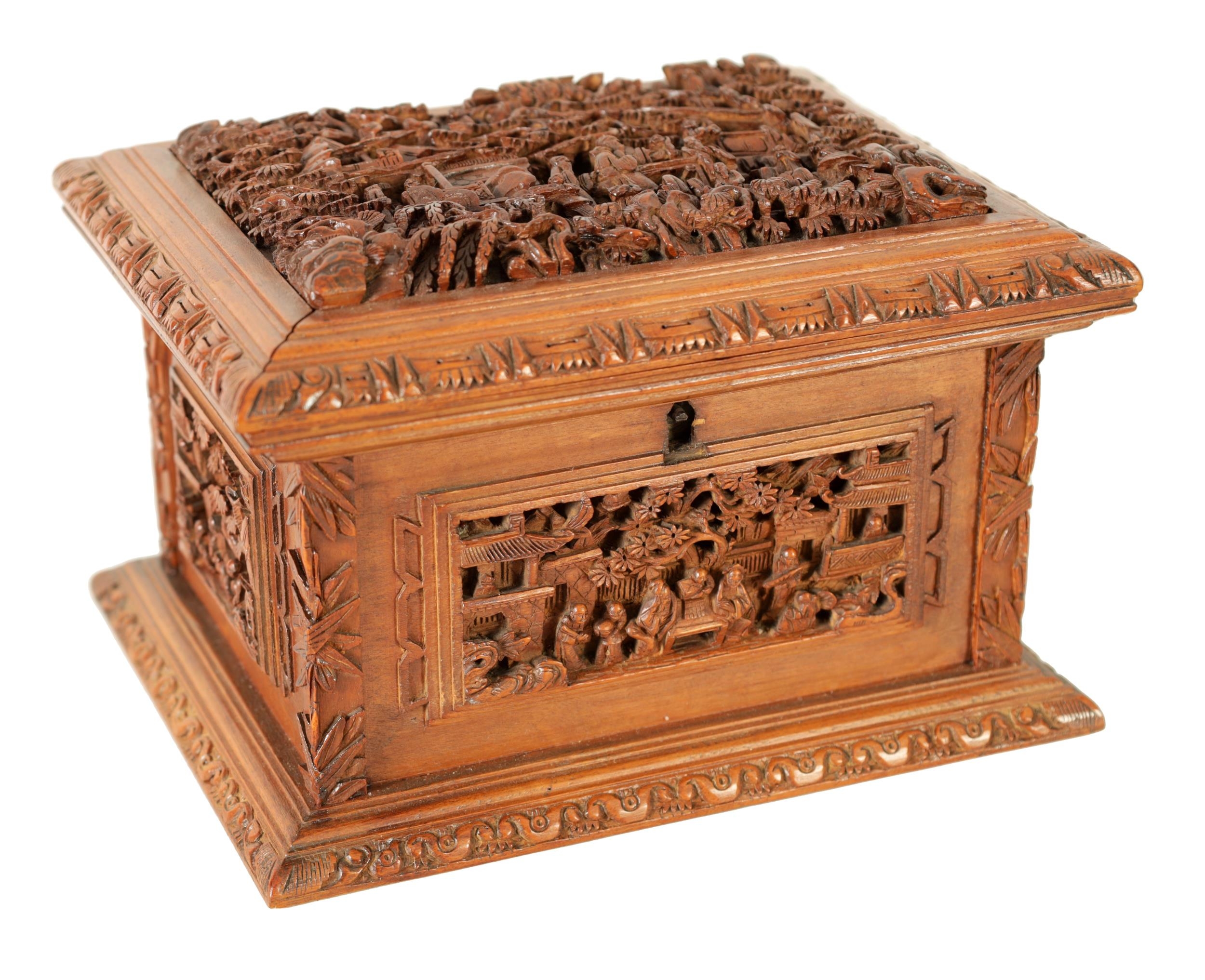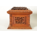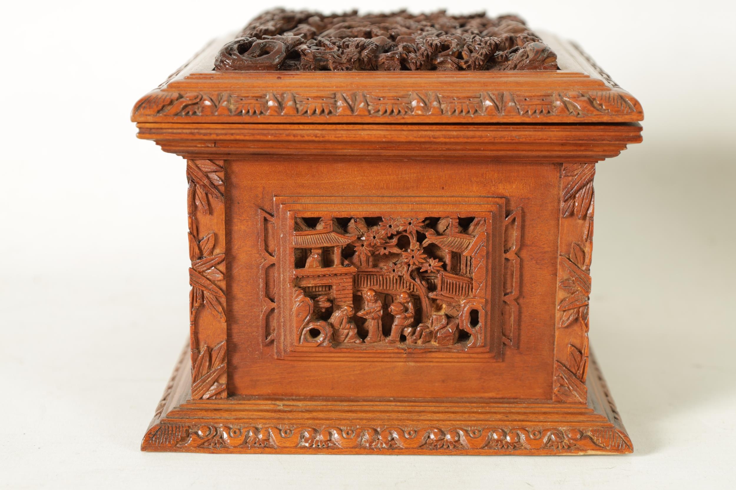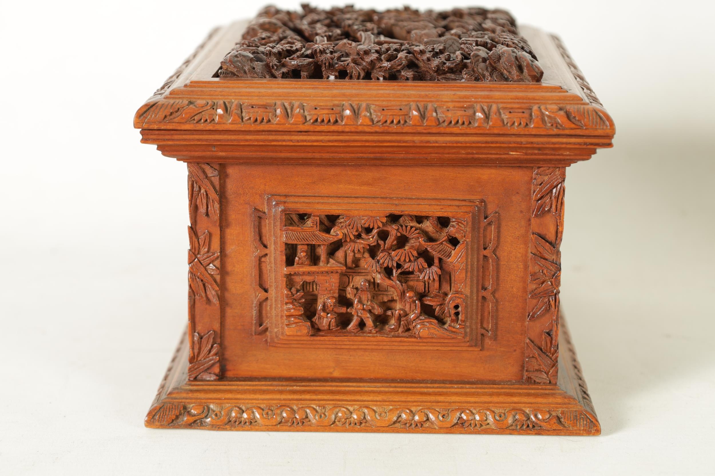 A LATE 19TH CENTURY CHINESE CARVED SANDALWOOD LIDDED JEWELLERY BOX profusely carved with landscape figural scenes and with lined interior. (19cm wide 15cm deep 12cm high )