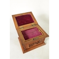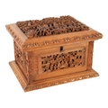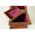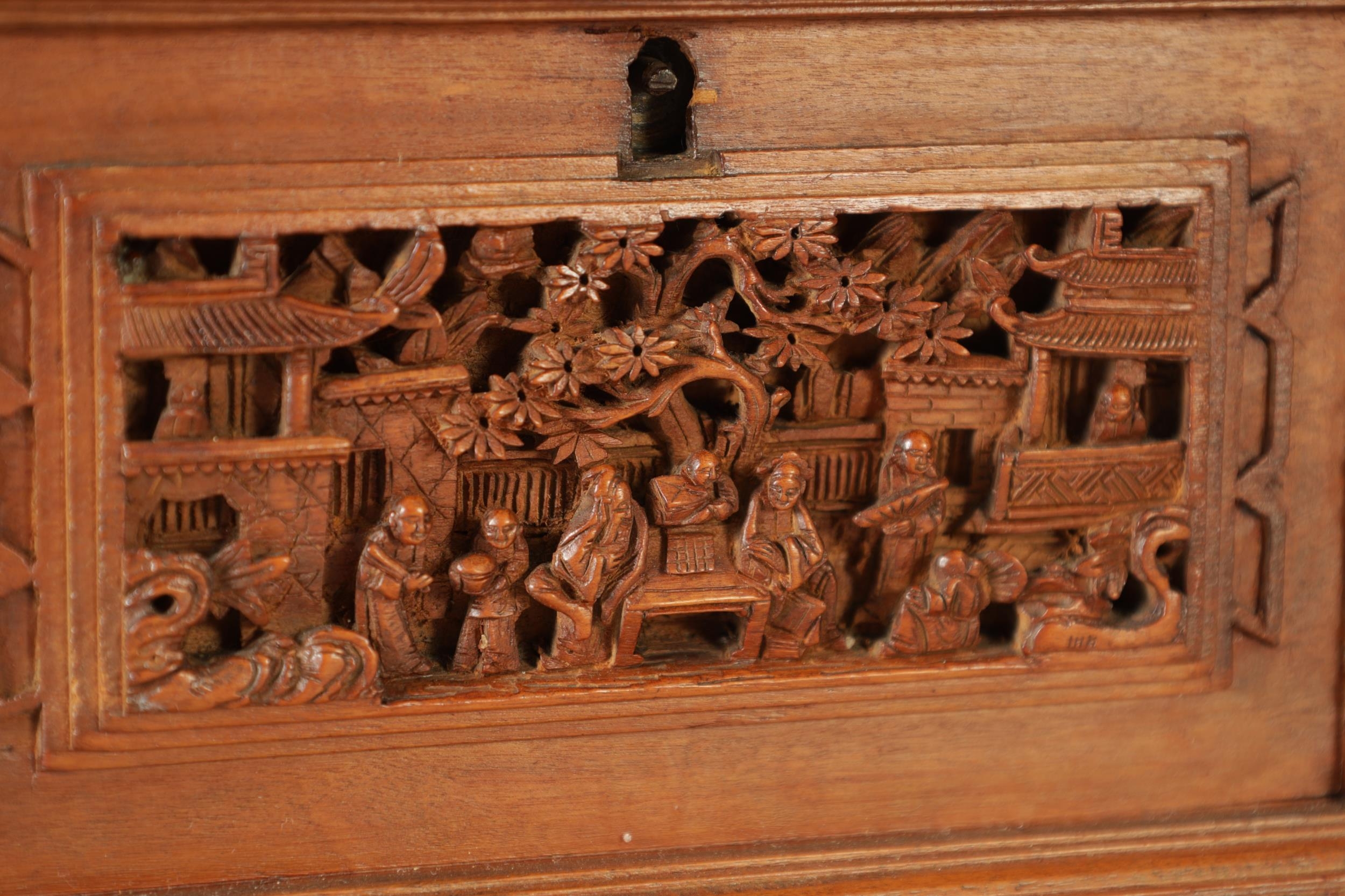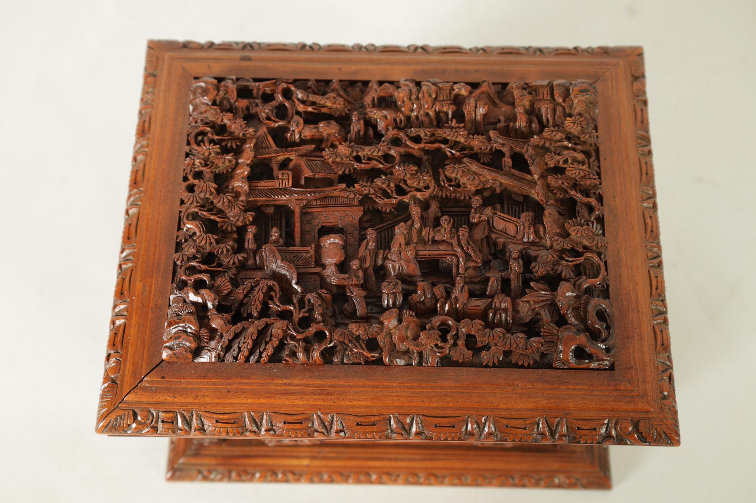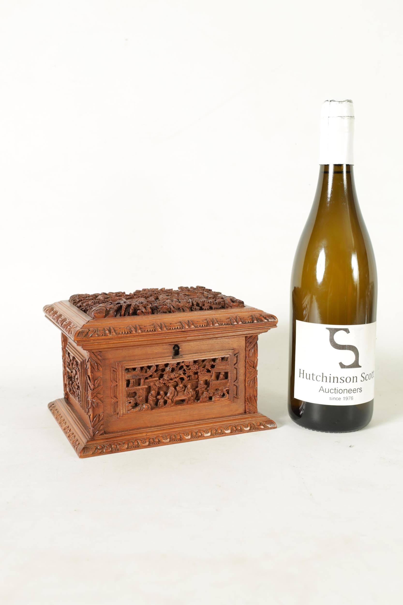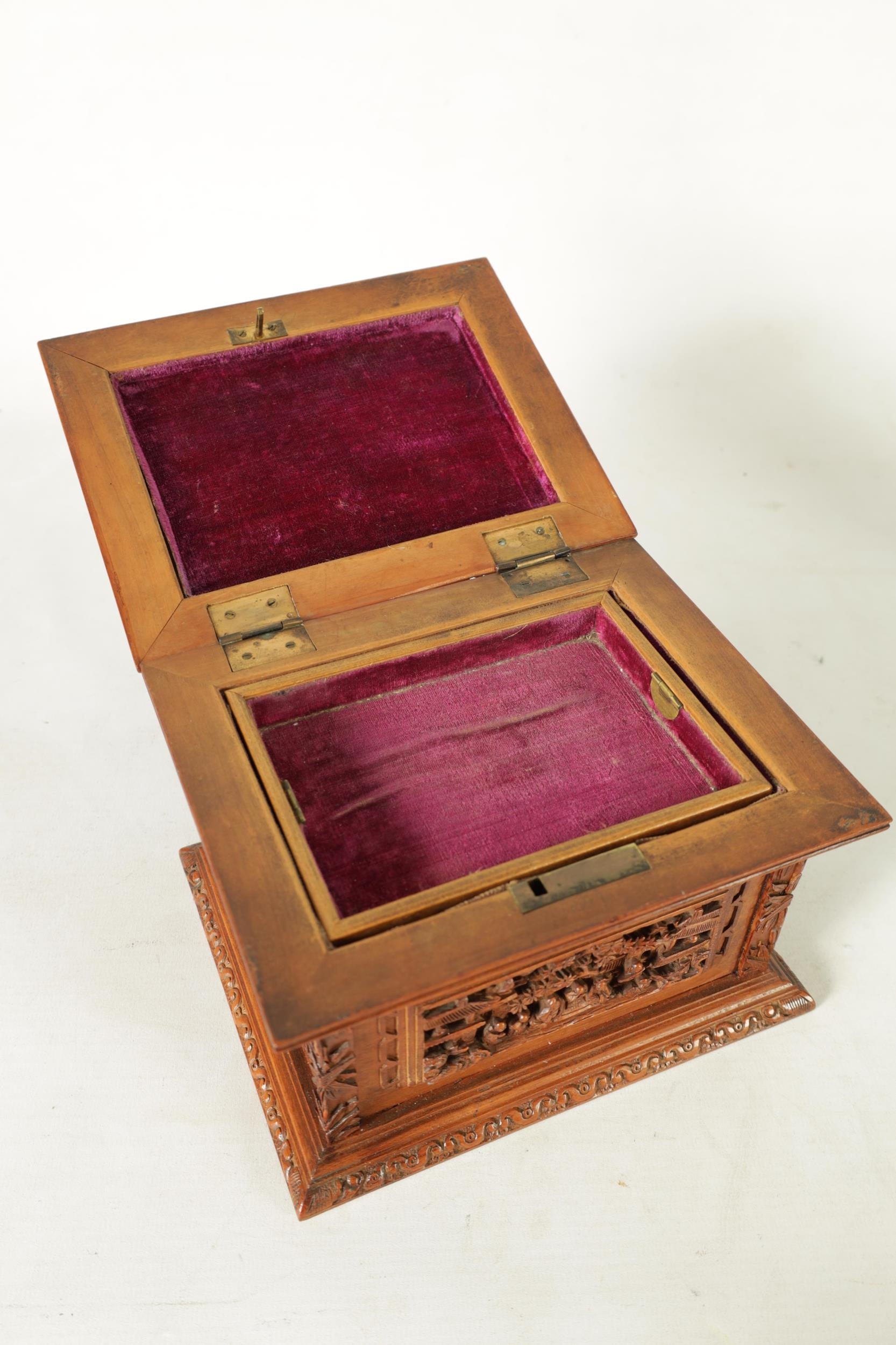 A LATE 19TH CENTURY CHINESE CARVED SANDALWOOD LIDDED JEWELLERY BOX profusely carved with landscape figural scenes and with lined interior. (19cm wide 15cm deep 12cm high )
